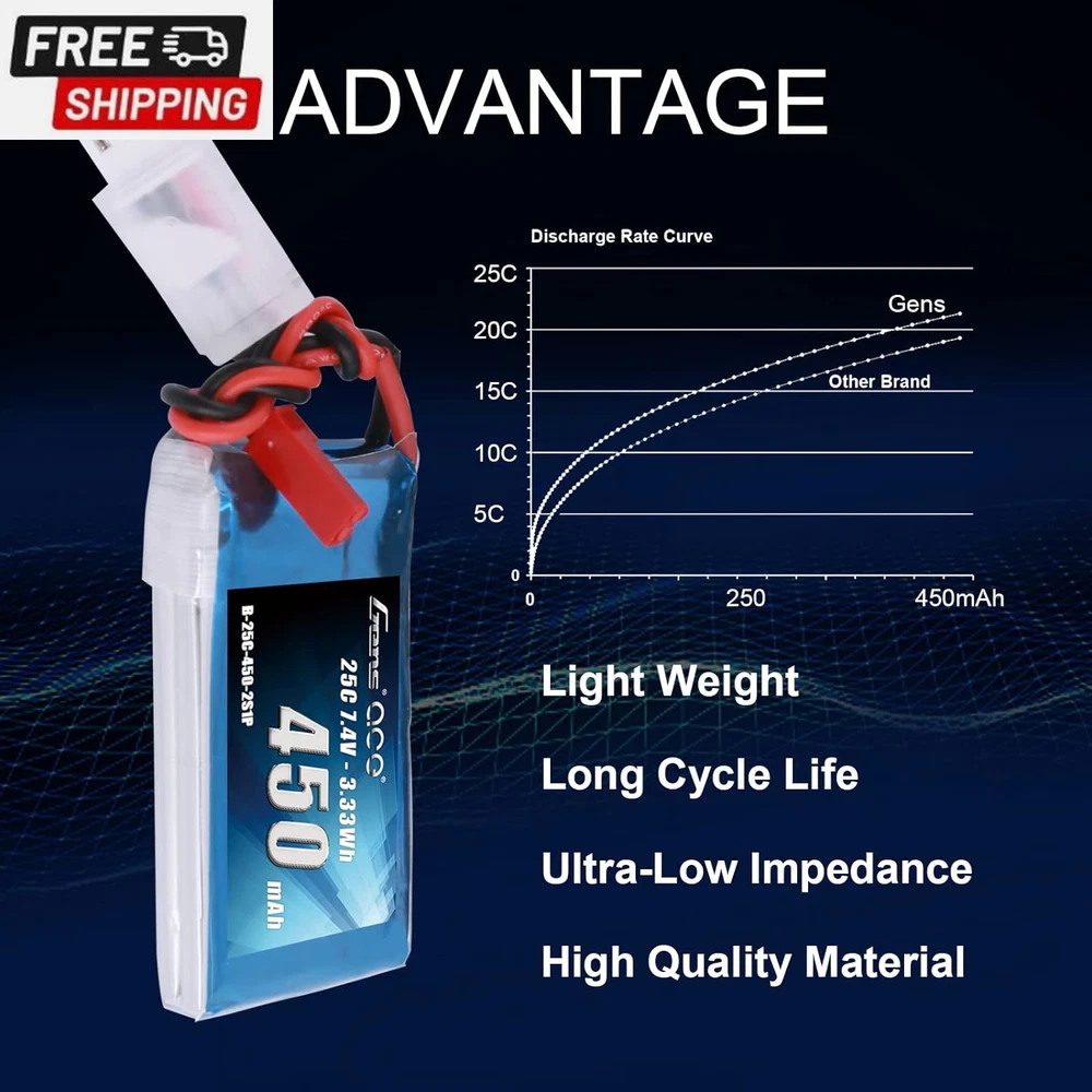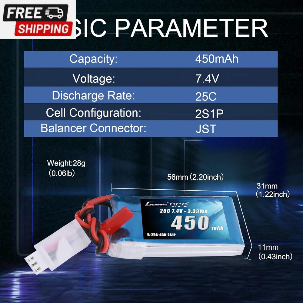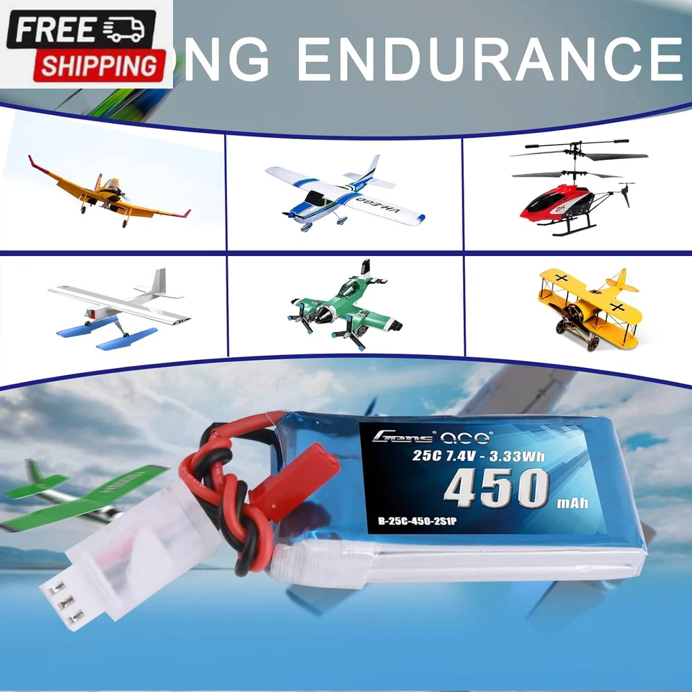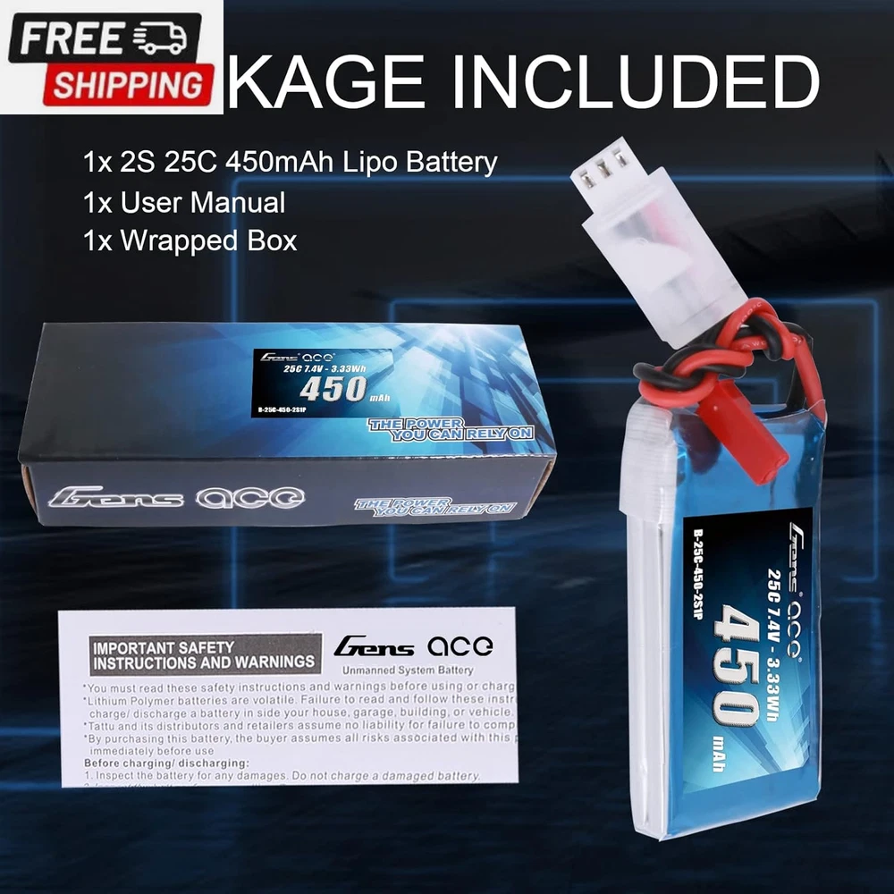 7.4V 450Mah 2S Lipo Battery Pack 25C/50C with JST Plug for Emax Babyhawk RC Heli 250 Helicopter Small Airplane Micro FPV Racing Drone Quadcopter Gens ace 7.4V 450mAh Lipo battery Specification:Battery Voltage:7.4V;Configuration:2S1P; Capacity:450mAh;Discharge: 25C/50C Plug: JST Plug. Dimensions: Gens ace 450mAh 2S Lipo battery dimensions is: 56*31*11mm/2.20*1.22*0.43inch; Approx Weight:28g/0.99oz. High Performance: Gens ace 2S 450mAh Lipo battery with 25C/50C discharge rate hardcase offers high power and very long time for your RC Model. Application: Gens ace 2S 450mAh Lipo battery specially compatible with Emax Babyhawk 250 helicopter, small airplane, and small FPVs, great for beginners and daily practice. What you get: The Gens ace battery comes with a 60 days money back and a 18 months warranty and with 24 hours friendly customer service. Please enter “YOU ORDER” to contact us directly if you have any problems with our product. Details: Brand: Gens ace Capacity(mAh): 450mAh Voltage(V): 7.4V Discharge Rate (C): 25C Max Burst discharge Rate (C): 50C Configuration: 2S1P Net Weight(dev.20g): 28g Length(dev.5mm): 56mm Width(dev.2mm): 31mm Height(dev.2mm): 11mm Connector Type: JST-SYP-2P Wire Gauge: AWG20# Wire Length(mm): 100mm Balancer Connector Type: JST-XHR Overview Gens Ace is one of the top rank RC battery brand in the market. With the effort of 200 professional engineers and technicians, Gens ace always provides batteries with exquisite technology for various RC Models such as RC cars, RC planes, RC helis, RC boats, etc. Features: 1.Superior Japan and Korea Lithium Polymer raw materials. 2.Automatic stacking technology, better performance 3.Strict matching progress, excellent consistency 4.Up to 200Wh/kg energy density 5.Long cycle life (150 times minimum) 6.Local after-sales service(located in Dublin, CA) Notes: 1.Only if the demension, weight, voltage and plug match, then it will fit 2.Don't over charge exceed 4.2V and don't over discharge below 3.7V 3.Don't put it beside the high temperature condition and don't throw it into fire or water 4.Check the battery condition carefully before using or charging 5.For any questions, pls feel free to contact us through "Your Orders" tab of your Amazon account, we will respond within one business day Shipping Fast shipping is very important for us. Our standard US shipping service is FREE. Your order will be shipped within 2-3 business days upon full payment received. Your order will be delivered within 2-3 business days after the handling time. We only ship to the confirmed PayPal address. We reserve the right to cancel any order for any reason at any time. We are not responsible for undeliverable addresses. Returns and payment We offer a 30 days return policy from checkout winning date. We allow only PayPal as payment method FeedBack Your feedback very important to us, after you get your package and you are satisfied with our service please leave us positive feedback If you have any problem with your order / any questions please before leave any type of feedback For any questions, using eBay contact system Please visit our eBay store to check out other items for sale! Thank you for shopping at our store.
