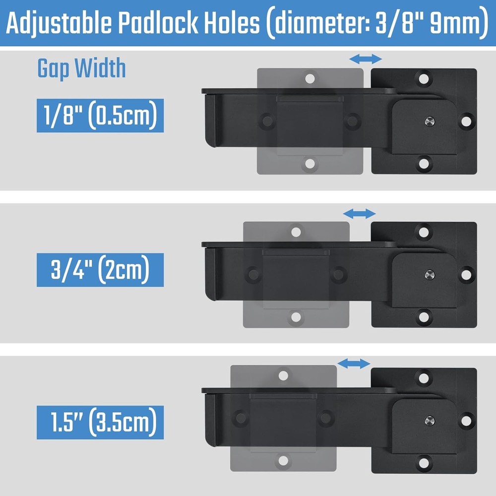 About this item 【Aluminum Alloy Made】The flip gate latch lock is directly cut from an aluminum alloy ingot by CNC. The flip latch has no welding trails on the surface. Together with a thickness of 0.16 inches and a weight of 11 oz to ensure the latch is strong. 【Symmetric Plates with 8 Screws】The flip gate latch has 2 symmetric plates and 4 screws for each plate to be installed on your gate frame or fence door. Many latches in the market have only 1 plate, reducing stability and compromising the appearance of your door, gate, or fence. 【Preset PadLock Holes】This latch can also function as a lock, featuring 3 preset lock holes on the latch arm for use with any locks up to a diameter of 3/8”. The lock hole and the gap between the two plates can be adjusted according to your needs. 【Oxidation and Sand-Blasting Surface】Exhibiting the same surface treatment as consumer electronics such as smartphones and laptops, the latch boasts a smooth skin-like finish. 【3 Step Installation】Simply adjust and align to one of the three lock holes, mark the drill holes on your door, and drive all 8 self-drilling screws to fix the lock. Dimensions: 11.02 x 10.91 x 2.05 inches.