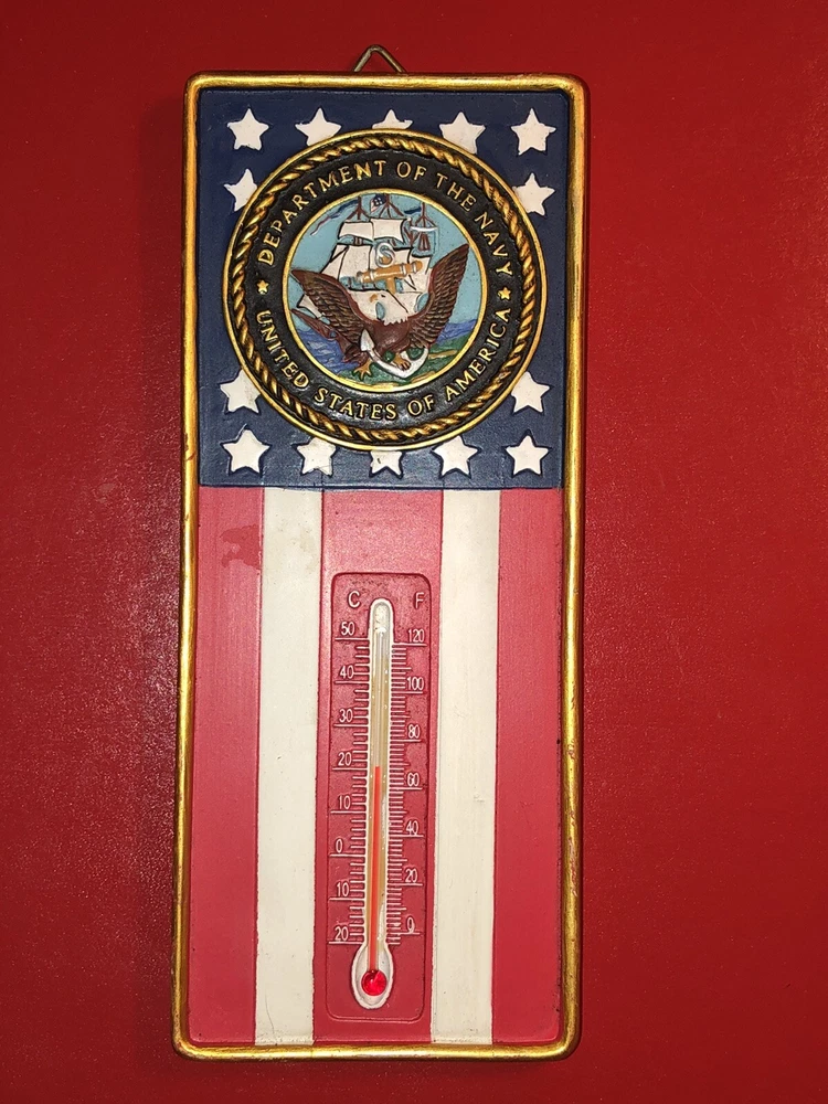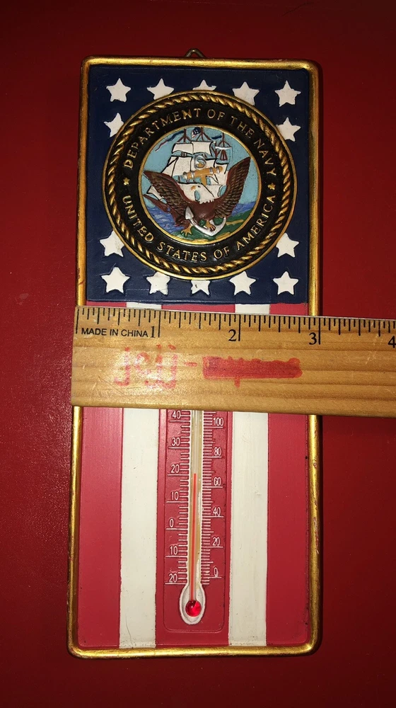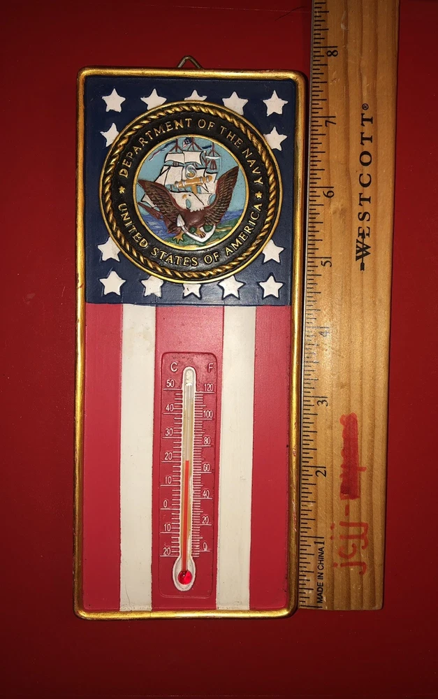 This auction is for a 7.5 X 3 UNITED STATES OF AMERICA DEPT OF NAVY RESIN WALL THERMOMETER DONE IN A FLAG DESIGN. A LOOP ON THE BACK FOR HANGING. MADE BY SPOONTIQUES. In good working condition, and no damage. See many photos. Fast Shipping. (Drwr) PHOTOS: Please view the many photos on my auctions for close ups and details of condition. Consider the photos as part of the description. Please take the time to click on each photo to enlarge it for details. I also put a ruler in many photos for size. CONDITION: I sell many items in varying stages of condition. Items are stored in my non-smoking, pet free home. Here is a general breakdown: New - A new item from the store, new with tags, or sealed item, never used. Used - A previously owned item will be in good usable condition, unless otherwise noted. Estate Sale item - These items may be old or antiques, their previous environment may have been a smoking or musty one. Some items may need minor cleaning or dusting. PACKAGING: I will package your item carefully and thoughtfully. I use new and recycled packaging materials. I will ship within 24 hours or sooner if possible. I do combine items into one package for multiple wins (if possible). Some larger items cannot be combined. SALES TAX: I am now required to collect NYS sales tax in the amount of 8% for all NYS residents who purchase my auctions. INTERNATIONAL BIDDERS: If you are an International bidder and wish to bid, please send me a message. I will give you a shipping quote, via First Class International for packages under 4 pounds. FEEDBACK: I strive to obtain a 5 star feedback from you. I pledge to ship fast/accurately describe/communicate swiftly/charge appropriate shipping. Please keep in mind; I will get your purchase to the post office within 24 hours. How long it takes the Post Office to deliver, is not what I am being rated on. If you ask me a question – I will usually answer you right away. I charge the shipping charges set forth by the Post Office, I cannot be held responsible for the high cost of shipping. I am by no means an expert in all that I sell, I will try to the best of my ability to describe my items. Please feel free to ask a question if I have left out a detail. I also welcome advice and helpful thoughts. HAVE A PROBLEM? If you have a problem or concern, please contact me directly. Go to your Purchase History, click on my auction, on the far right will be a drop down box which says More Actions. Click on the arrow and choose contact Seller. I am easy to work with and will make things right for you. COPYING: Did you know Ebay has a policy that prohibits someone from copying your text or photos? It can be found at ebay.com/help/policies/image-text.html - The offending listings can be removed if reported. So please don't copy any part of my listings without permission. Track Page Views With Auctiva's FREE Counter