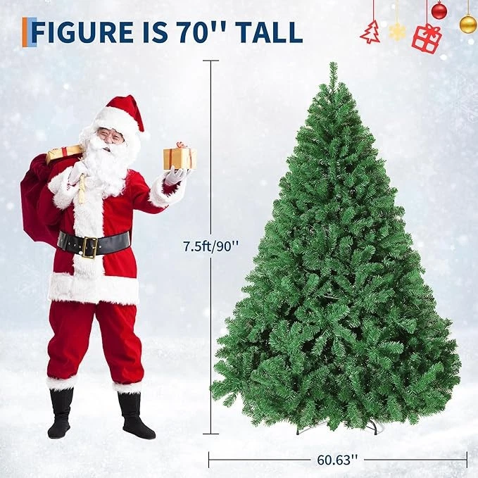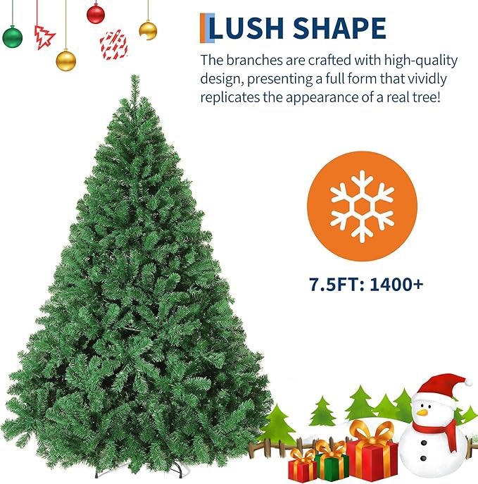 This 7.5 ft Artificial Christmas Tree is a realistic and premium spruce hinged tree perfect for the holiday season. Made of iron and PVC, this undecorated/unlighted tree is in a festive green color, adding a touch of Christmas cheer to any room. Standing at 7.5 feet tall, this artificial tree is ideal for those looking to bring the holiday spirit into their home without the need for maintenance.
