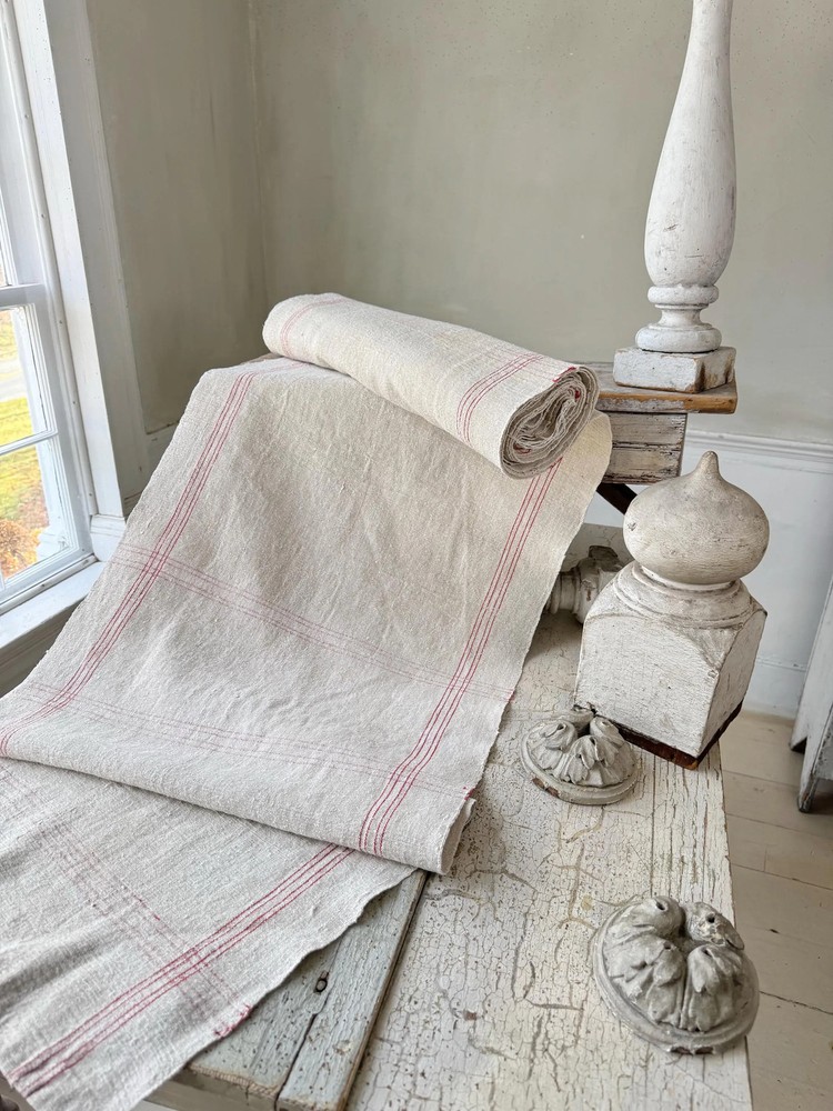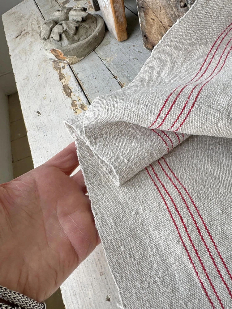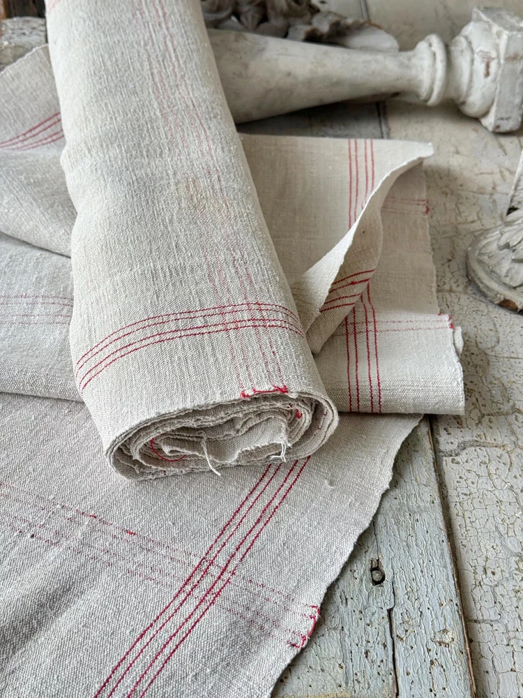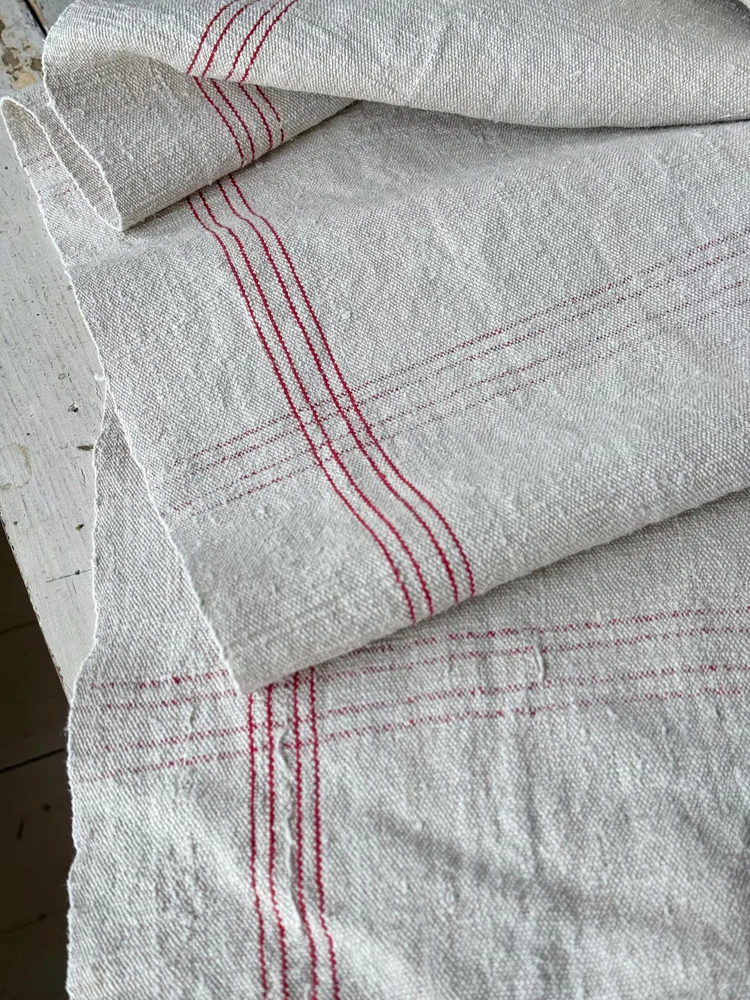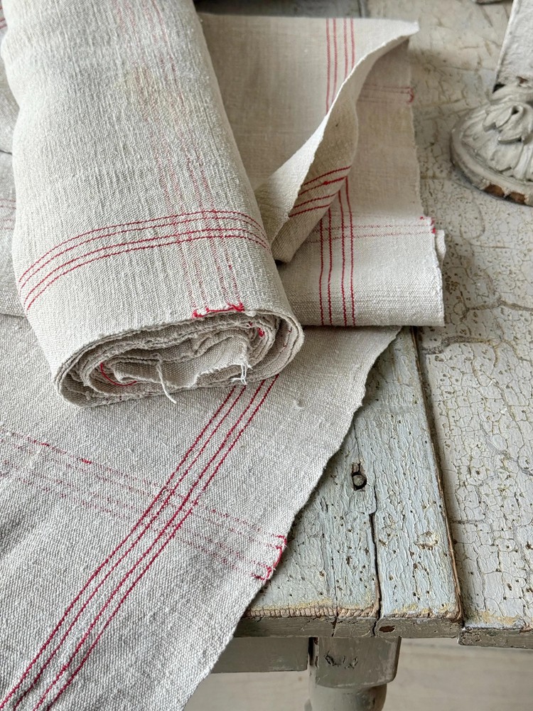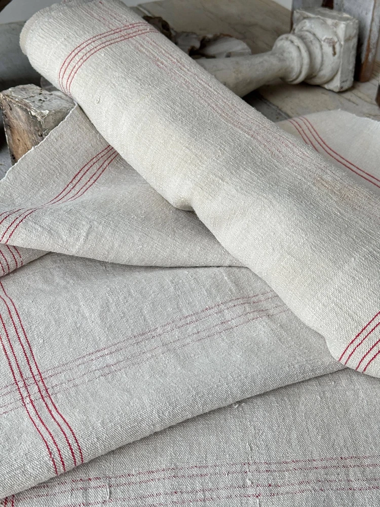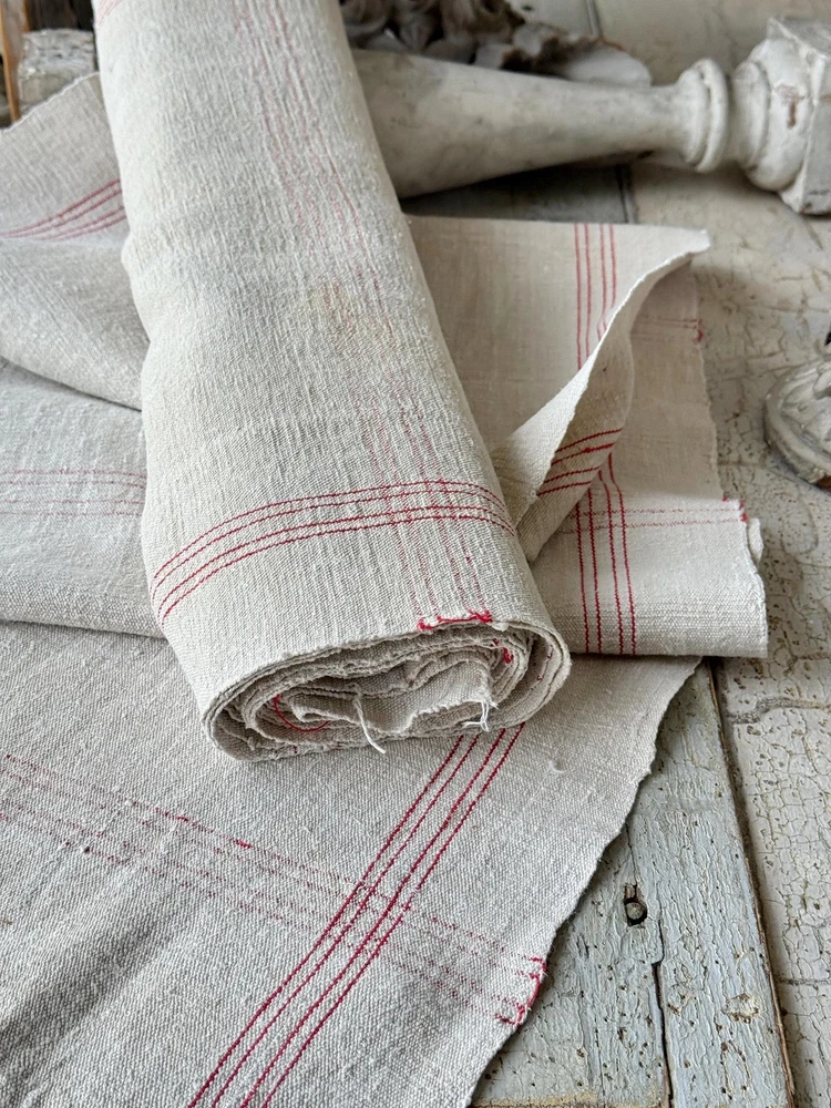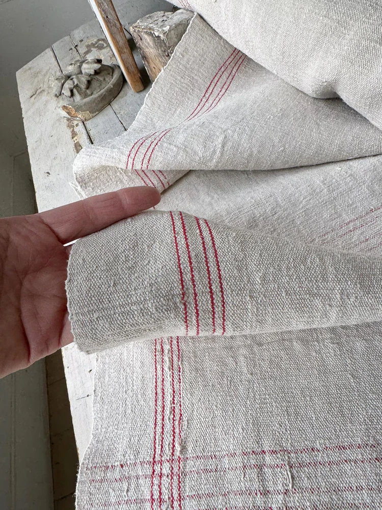 Welcome to The Textile Trunk ~ please follow us on ! We are ~ A very early fabric, hand woven sometime around 1900~The stripes are stunning ! This bolt was made to create hand towels, the intersecting stripe running the width was where the fabric would be cut the space in between the stripes is about 19 inches ~ ~ ~~*~ This bolt feels and smells just great! Nubby and floppy ~ This bolt is ideal for window treatments, table runners, pillows, upholstery etc! ~ Wonderfully high quality. I love knowing these linens were grown without the use of pesticides, just lovely natural fabric. It took the average weaver an entire night to weave only 21 inches! The time invested in this fabric is simply mind boggling and that is after they grew the fibers , retted them, spun them, died the stripe threads and THEN woven them. These are treasures beyond belief ~*~ ~ ~*~ *~ This wonderful textile was originally woven for grain sacks in rural French homes, where sturdy cotton and hemp fabrics were made to withstand years of heavy use. This length is the unused portion that was never stitched into a sack — it would have been carefully tucked away in a dowry chest, saved for future household needs. Textiles like this were treasured and used thoughtfully, and today they’re ideal for ecofriendly living, offering a sustainable way to bring authentic vintage character into the home while reusing materials that were made to last. MEASUREMENTS : This bolt measures 7.5 yards long by 21.5 inches wide ~~ CONDITION : I've freshly laundered this bolt and it's ready to use ~ there are some pale discolorations a pale yellowing in a couple of places, there are some pale storage marks ~ Light signs of time and use often inherent in these wonderful bolts ~ any and all condition is reflected in the price ~ Inventory : EL 888