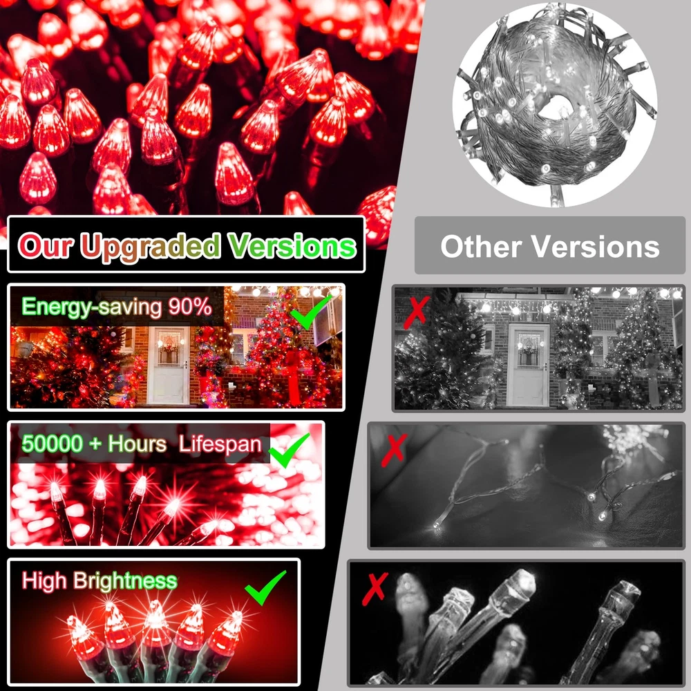 Light up your festive celebrations with our incredibly long and bright 256ft Christmas lights! Boasting 750 enhanced LEDs, these super-long string lights brighten any outdoor area, making them perfect for transforming your garden, patio, or backyard into a vibrant space ideal for holiday gatherings and celebratory events Light up your festive celebrations with our incredibly long and bright 256ft Christmas lights! Boasting 750 enhanced LEDs, these super-long string lights brighten any outdoor area, making them perfect for transforming your garden, patio, or backyard into a vibrant space ideal for holiday gatherings and celebratory events Featuring 8 unique lighting modes like Combination, In waves, Sequential, Slo-glo, Chasing/flash, Slow fade, Twinkle/flash, and Steady on—our lights cater to every mood and occasion. Easily control your settings with a simple push of a button on the plug. For added convenience, these lights come with a timer function for automated 6 hours on and 18 hours off cycles, while a memory chip retains your last used setting. Experience hassle-free installation and user-friendly operation that makes setting up your holiday display a breeze Prioritize safety with our LED Christmas lights designed for secure indoor and outdoor use. The 29v low voltage and advanced safety features offer peace of mind, especially in households with young children and pets. Our lights are cool to the touch with minimal heat emission, ensuring safe handling and a secure environment throughout the holiday season Durable and reliable, our waterproof Christmas string lights are crafted from high-quality materials and feature advanced LED for enhanced beauty and brightness. Perfect for both indoor and outdoor decorations, they withstand harsh weather conditions like rain or snow. Enjoy a long lifespan and enduring brilliance, making these lights a mainstay of your holiday decor for years to come This set includes 1 x 750 LED String Light, 1 x Power Plug, and 1 x User Manual, backed by 24-hour friendly customer service. If you have any questions, please feel free to contact us. Embrace the holiday spirit and use these robust string lights to adorn your garden throughout the Christmas season and beyond