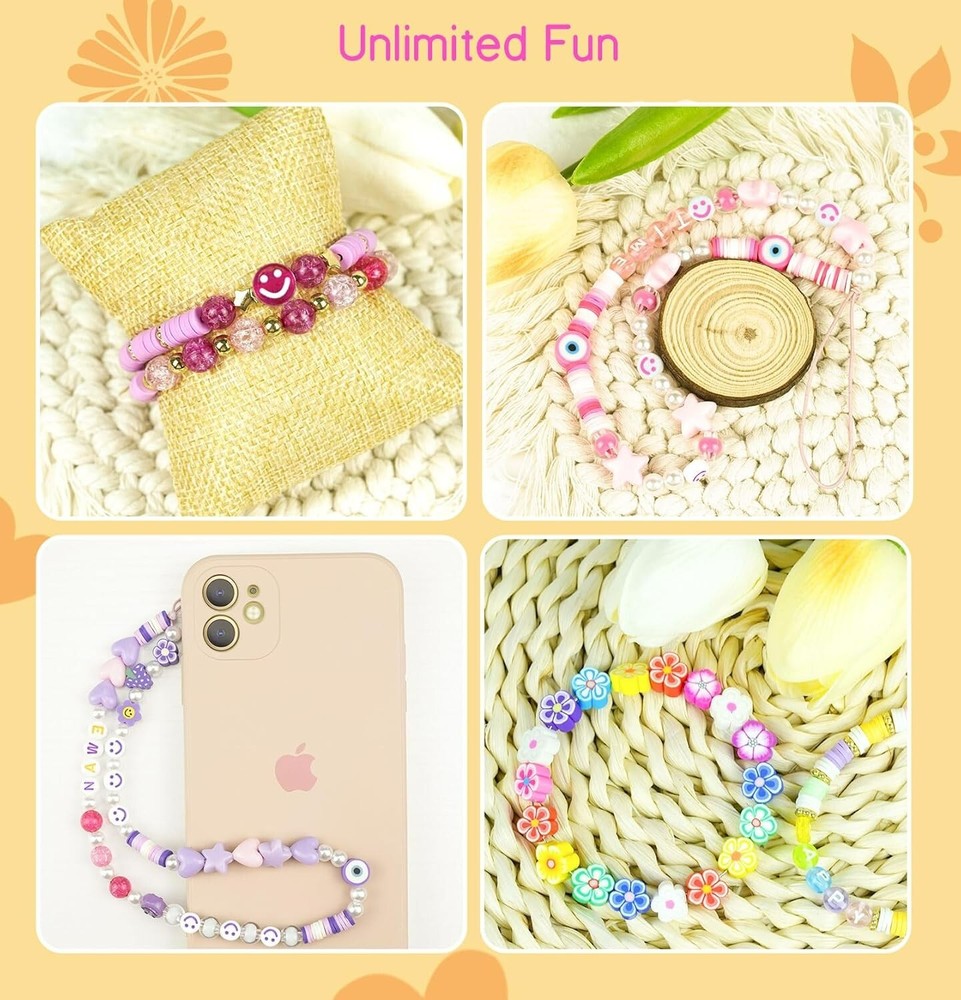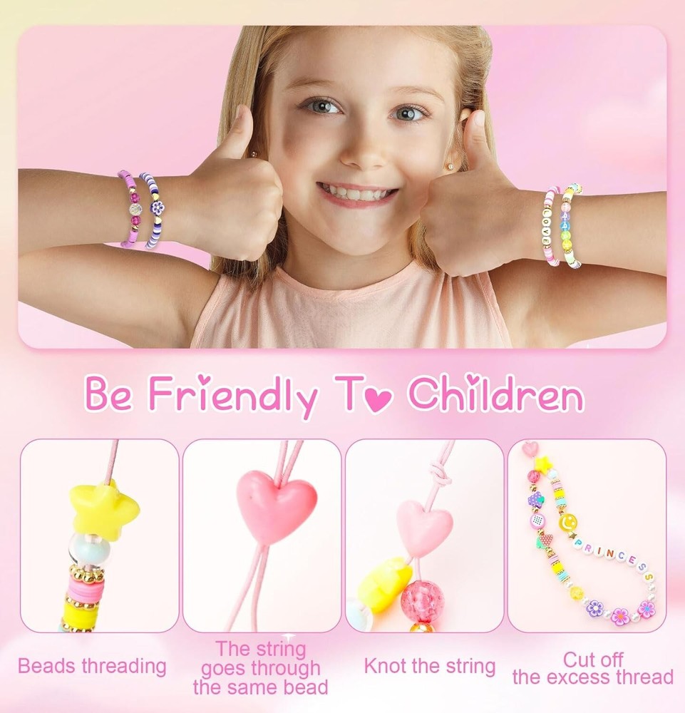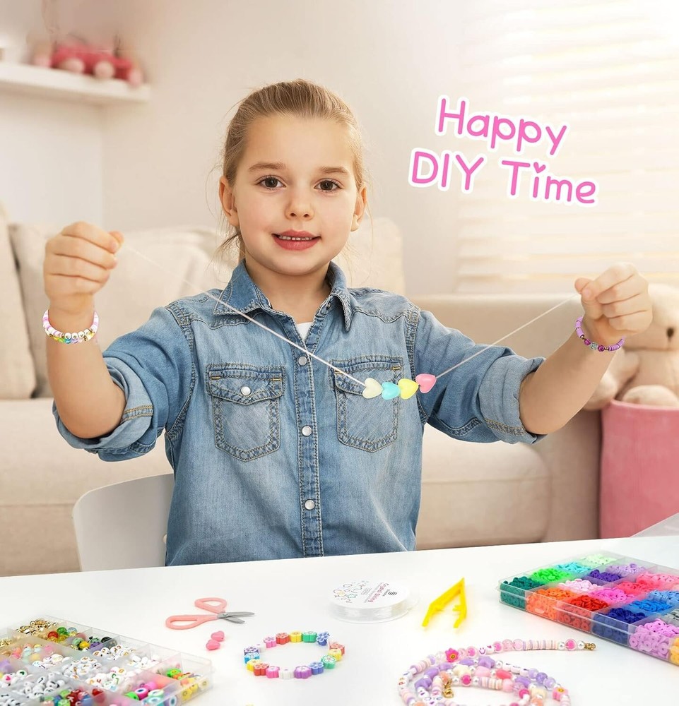 Clay Beads 7500 Pcs Friendship Bracelet Making Kit,2 Boxes 24 Colors Polymer Heishi Beads with Letter Beads for Jewelry Making, DIY Arts and Crafts Gifts Toys for Girls Age 4+ Everything you need is included: Two boxes contain about 3600pcs clay beads in 24 vibrant colors, about 48pcs polymer clay beads in 4 types,320pcs random letter beads in 4 types,20pcs plastic smile beads and 100pcs small round beads,166pcs charms rolls of 6 meters of elastic strings. You can make bracelets or jewelry according to your favorite color and style. What's new in our kits: We have prepared instructions and videos to teach you step-by-step how to make bracelets, jewelry, and earrings. In addition, we will also introduce you to the usage of charms accessories one by one, such as lobster clasp, binder, and so on. Whether you are a beginner or not, we hope to give you a relaxed and enjoyable experience. Kid-Friendly Material: All of our beads are made of healthy and environmentally friendly materials, light and durable, comfortable to the touch, not easy to fade, waterproof, and can be worn when bathing or swimming. You can use and wear it with confidence. All materials provided are completely safe and kid-friendly for ages 4+.Recommended age 4+ s old. Endless Creativity: With thousands of clay beads in 24 colors and various charms accessories, the possibilities for creative expression are endless. Let your imagination run wild and create unique pieces that reflect your style. Great Gift for Kids: Unleash creativity and imagination with this versatile bracelet making kit! Perfect for holiday playtime with kids, it helps improve hand-eye coordination, manual dexterity, and concentration. A meaningful and cheerful gift choice for birthdays, valentine's day, mother's day, Christmas, thanksgiving day, and more!