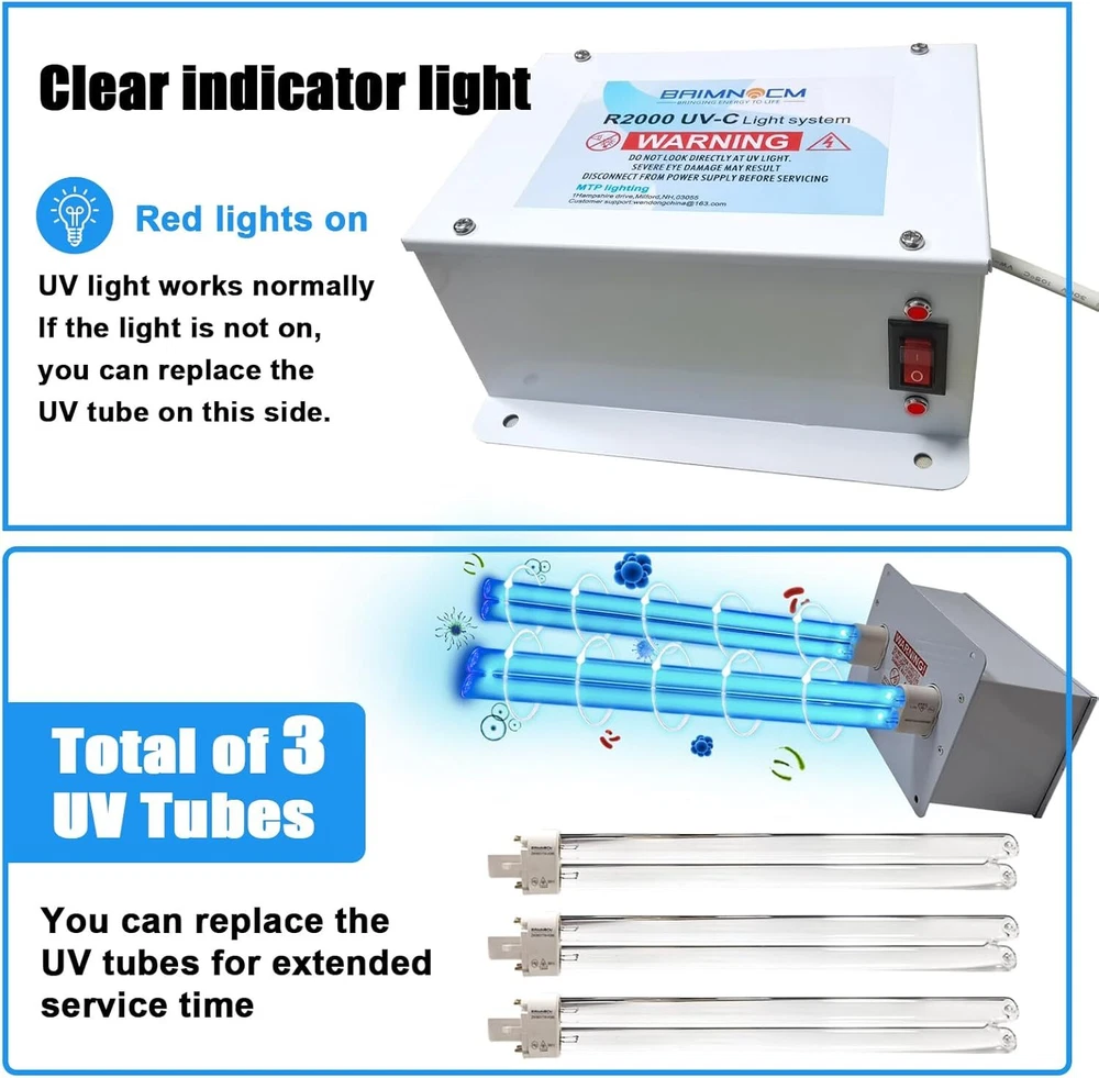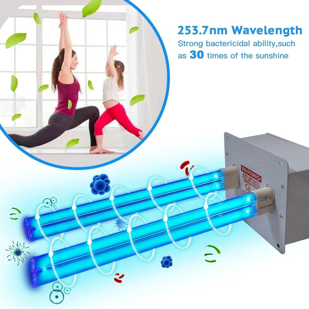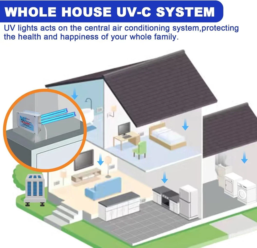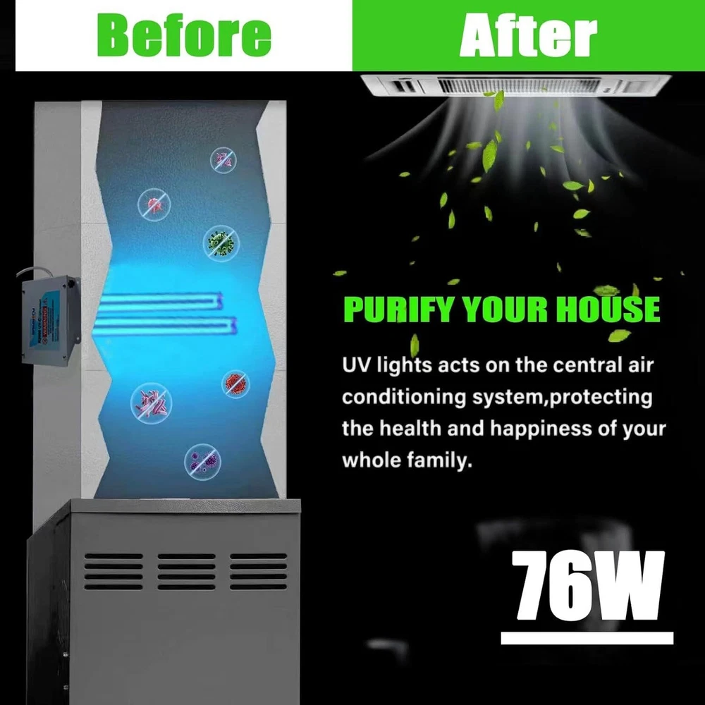 76 Watts Whole House Duct Uv Light, HVAC UV Ac System Filter Black Product Details Product Dimensions : 17.7 x 7 x 6.4 inches; 2 Pounds Item model number : Duct Light Manufacturer : XLT Color: Black Brand: BAIMNOCM Product Dimensions: 17.7"D x 7"W x 6.4"H Specification Met: EPA Certified Controller Type: Button Control Power SourceItem Weight: ac2 Pounds Control MethodFilter Type: TouchUV Light 【Purify】UV light has the effect of purifying function, making our room more fresh and it's Ozone free. 【Special Design】 work for odor, mold, germs!!! Designed to be installed on your HVAC Duct or furnace as a HVAC 【 Installation】Installation is easy 15 min or less, just cut 2 holes in your duct-work (template included), slip the lamp inside and and plug it in 6 ft cord 【 Tips】For better performance, suggest do the cleaning three times per week, UV-C light can work for most of existing mold, mildew and will prevent them from ever growing again and spreading.