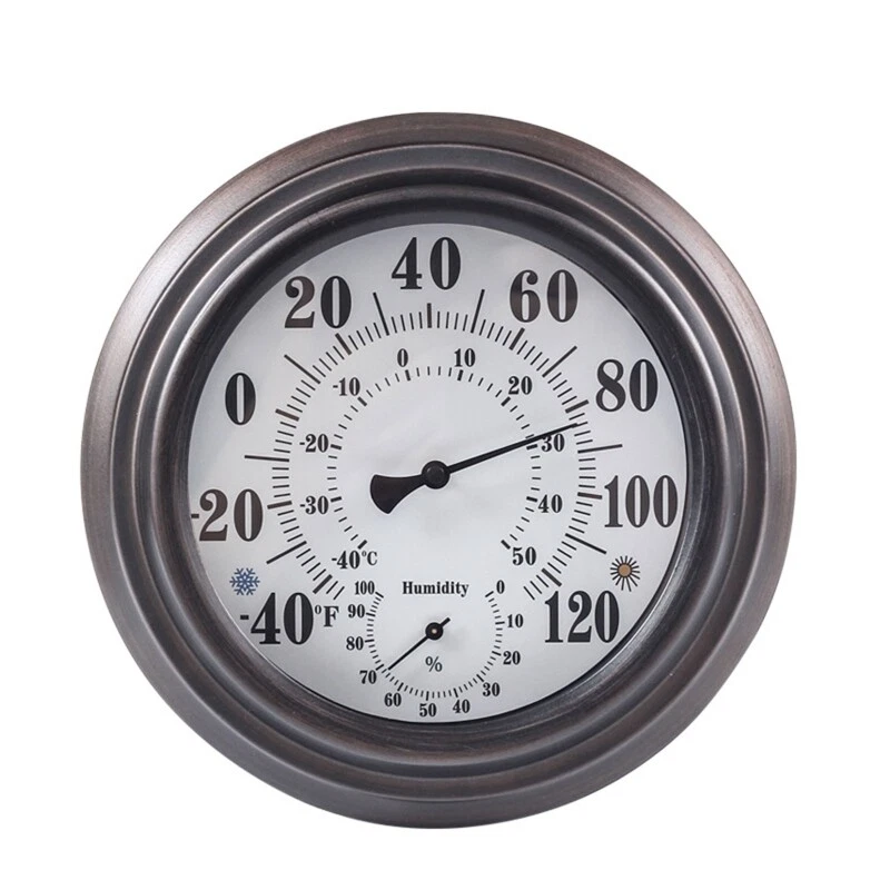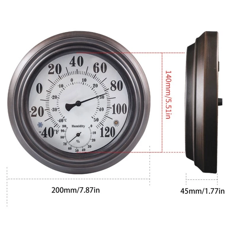 7.87" Patio Vintage Thermometer&Hygrometer Thermometer for Indoor Outdoor Features: and high Appearance size: American dial antique lacquered iron for case, thermo-hygrometer, about 7.87in in diameter and 1.77in in thickness. materials: 20CM iron for shell surface is treated with antique paint, inner for shell, glass lens, large font, high-material temperature and humidity sensing PVC sheet dial, the dial is the dial suitable for the Americas Function: The product is used to measure the temperature and relative humidity of the environment where you are located, let you know the heat and cold more clearly, and feel the dampness or dryness more clearly. Measurement and accuracy: temperature -40~120F (-40~50C), humidity 0~Rels; accuracy: temperature +/-5F (+/-2C), humidity +/-7% (40%~70% Rels). Application archives, pharmacies, hotels, greenhouses, nurseries, warehouses, laboratories, museums, offices, courtyard gardens, for sun rooms, factories, animal husbandry and other environments. Specifications: Metal for Shell/High Detail Glass/ABS Size:Approx.20x4.5cm/7.87x1.77in Package Includes: 1x Temperature Humidity Gauge note: Due to the light and screen setting difference, the item's color may be slightly different from the pictures. Please allow slight dimension difference due to different manual measurement.