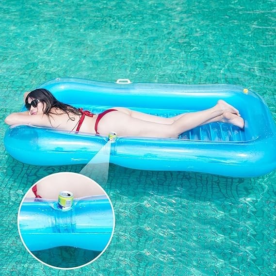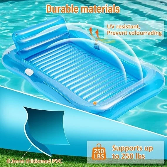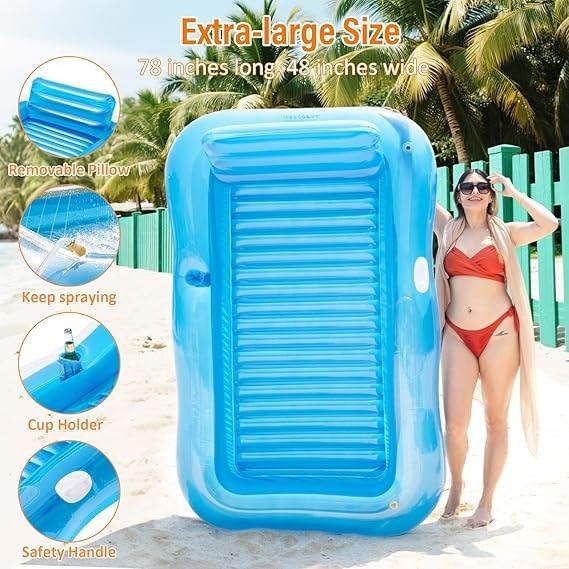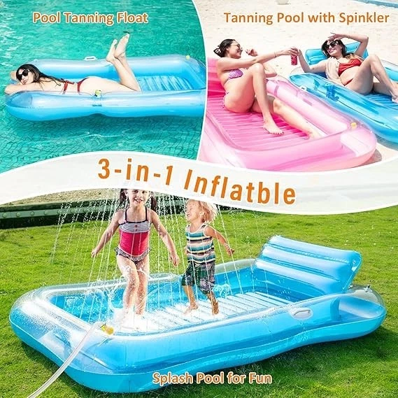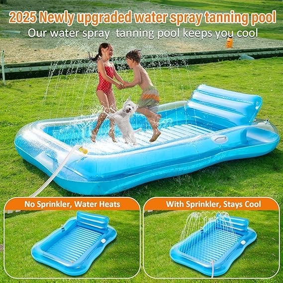 About this item Upgraded Tanning Pool with Sprinkler — 2025 New Design: Stay cool while you relax and tanning! This upgraded tanning pool lounger features built-in sprinklers for a refreshing water spray. Simply connect a water hose — the spray height adjusts automatically based on water pressure. Perfect for keeping cool and comfortable while enjoying a relaxing suntan in your tanning pool for the backyard — all summer long! Extra-Large Tanning Pool Bed for Backyard Relaxation: The inflatable pool floats are made of durable 0.3mm thickened PVC and measure 78 inches long by 48 inches wide, with a maximum load capacity of 250 pounds. Perfect as a tanning pool for backyard sunbathing — relax solo with a cooler or share the fun with friends and family. (Note: To prevent air leakage, avoid placing the float on sharp stones or rough surfaces.) Comfortable Pillow and Cup Holders: Our deluxe tanning lounger comes with a removable pillow and a drink holder,ergonomic pillows provide extra support for your neck and upper body, while the cup holder keeps your favorite drink within reach — making your tanning experience even more relaxing and enjoyable. Multi-Scene Use: This inflatable pool with sprinkler can be used as a tanning pool, pool float, personal pool, or lake float. It can also serve as a splash pad – but unlike regular dog splash pads, it can hold significantly more water, transforming into a fun mini pool for both pets and family to splash and play in! Perfect for enjoying outdoor summer pool parties with friends, family, or loved ones! Setting up the inflatable tanning chair is quick and easy — just follow four simple steps: 1. Inflate the inner chamber; 2. Inflate the outer ring; 3. Attach the pillow to the pool lounger float; 4. Inflate the pillow. This inflatable raft is compatible with most standard household air pumps and can be fully inflated within 5 minutes. Ideal for tanning, this inflatable pool is perfect for outdoor relaxation and summer enjoyment.