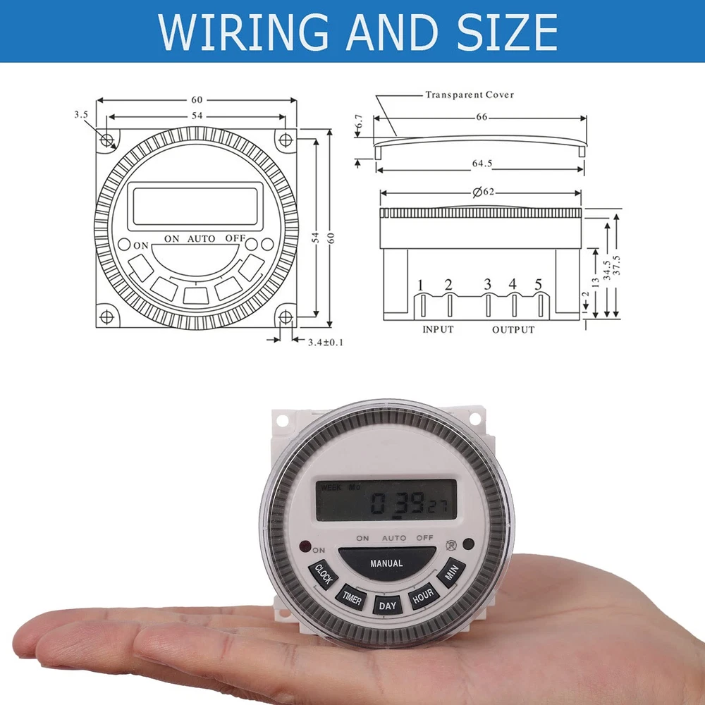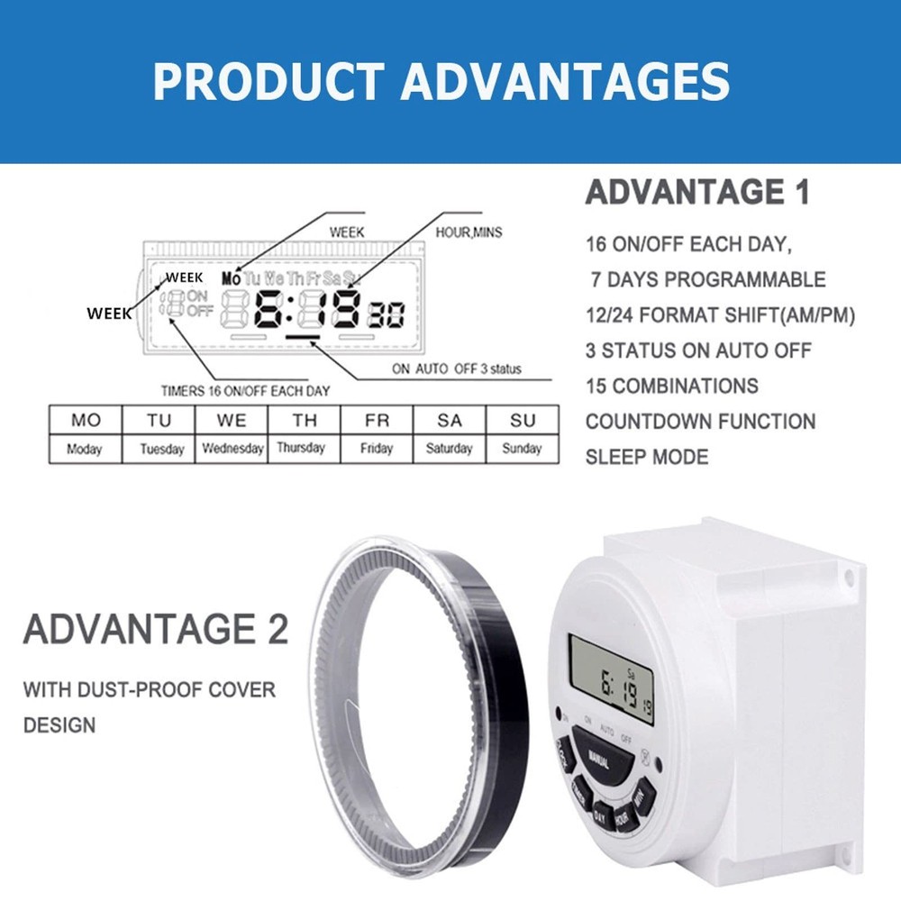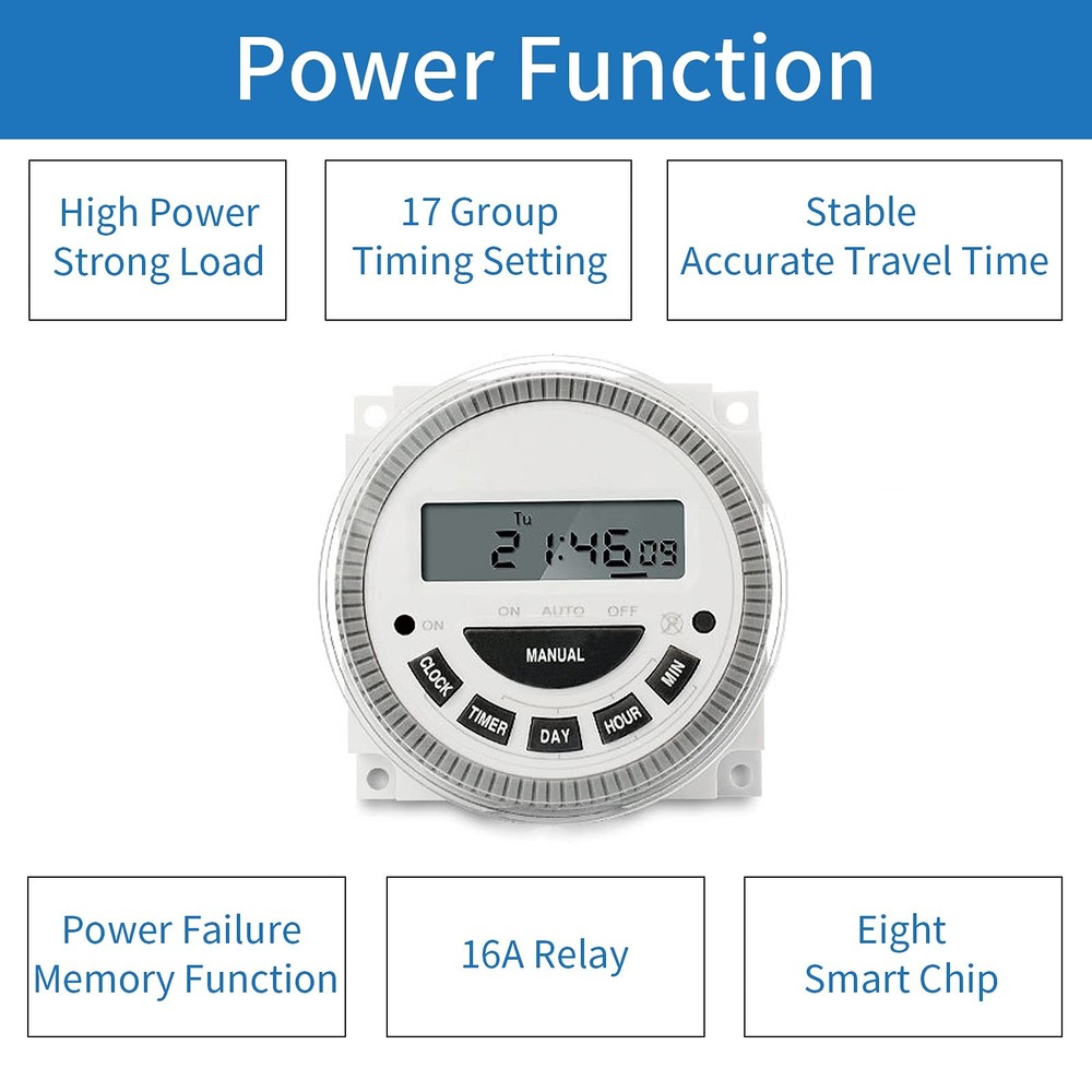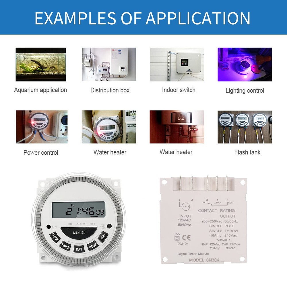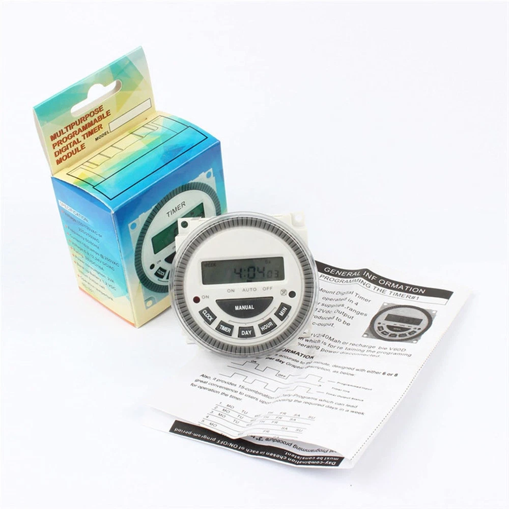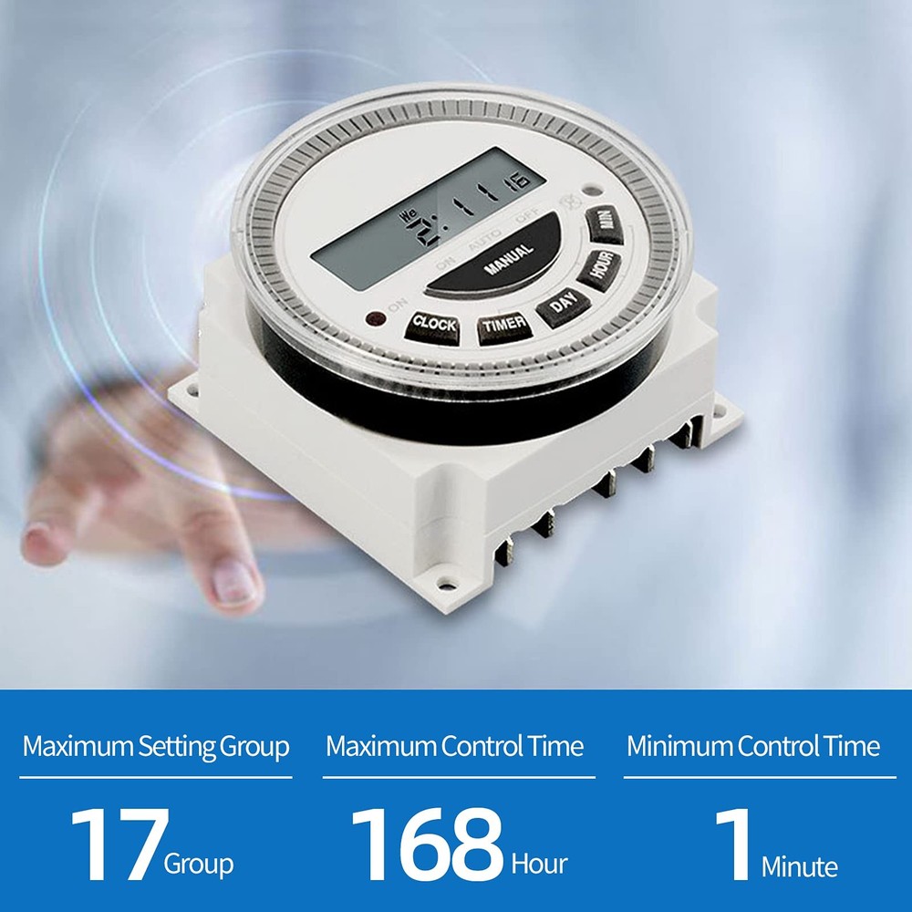 7-day programmable digital timer switch Product Name: Digital Display Time Control Switch Display type: LCD digital display Item type: Time switch Timing range: 1 minute to 168 hours Setting group: 16 on/off per day Program: 15 groups Black-out: 60 days Power supply: AC 120V Current: 30A Capacity: 16AMP Frequency: 50/60Hz Battery type: 1.2V, built-in, rechargeable Package includes: 1 x Time Switch 1 x Installation Manual In the long work and life. Yeipower will always be with you. If you have any use and product quality issues that lead to dissatisfaction. Please contact us via Amazon. We will provide satisfactory service within 24 hours. Widely Applicable: It can be used for swimming pool. Door. Sprinkler. Lighting. DIY automatic chicken house door. Solar controller. Fish feeder.Automatic preheating. Neon light. Kitchenware and Garden. Exquisite Appearance: Timer switch has a transparent dust cover and rubber buttons which are very practical. long lasting. High-definition LCD clock display and 12/24 hour format conversion (AM/PM). Your operation is smoother and faster. Powerful Function: Timer switch can be easily set up to 16 kinds of on/off every day, 15 kinds of combinations, and the setting interval can be as short as one minute. There are detailed operation methods on the English manuals we have provided. Please read them carefully. Easy to Use: Timer switch can automatically turn on/off the power. You can also enter sleep mode. Save power. And don't need batteries to be rechargeable. Hassle-Free Customer Service: You will get Timer Switch and installation Manual. If you have any questions about use and product quality, please contact me. We will provide you with a satisfactory solution. Completely worry-free, immediately add to the shopping cart.
