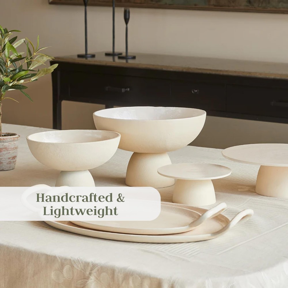 Place Holder THE CHAROLETTE COLLECTION: Perfectly aligns with the evolving trends of entertaining and home decor for now and beyond. As we see a growing emphasis on sustainability and organic aesthetics in modern homes, the Charlotte Collection stands out with its eco-friendly materials and artisanal craftsmanship. HIGH QUALITY MATERIALS: Beautifully crafted from aluminum, this serving pedestal features a crème-colored, food-safe enamel finish. Handcrafted and lightweight, these luxurious table essentials are easy to carry, making them practical treasures for all your entertaining needs. PERFECT FOR EVERY EVENT: A must-have for entertaining, the Charlotte Serving Pedestal will be the focal point at your next dinner party. Elevate your gatherings with the Charlotte Serving Pedestal, the perfect blend of style and functionality for any occasion.