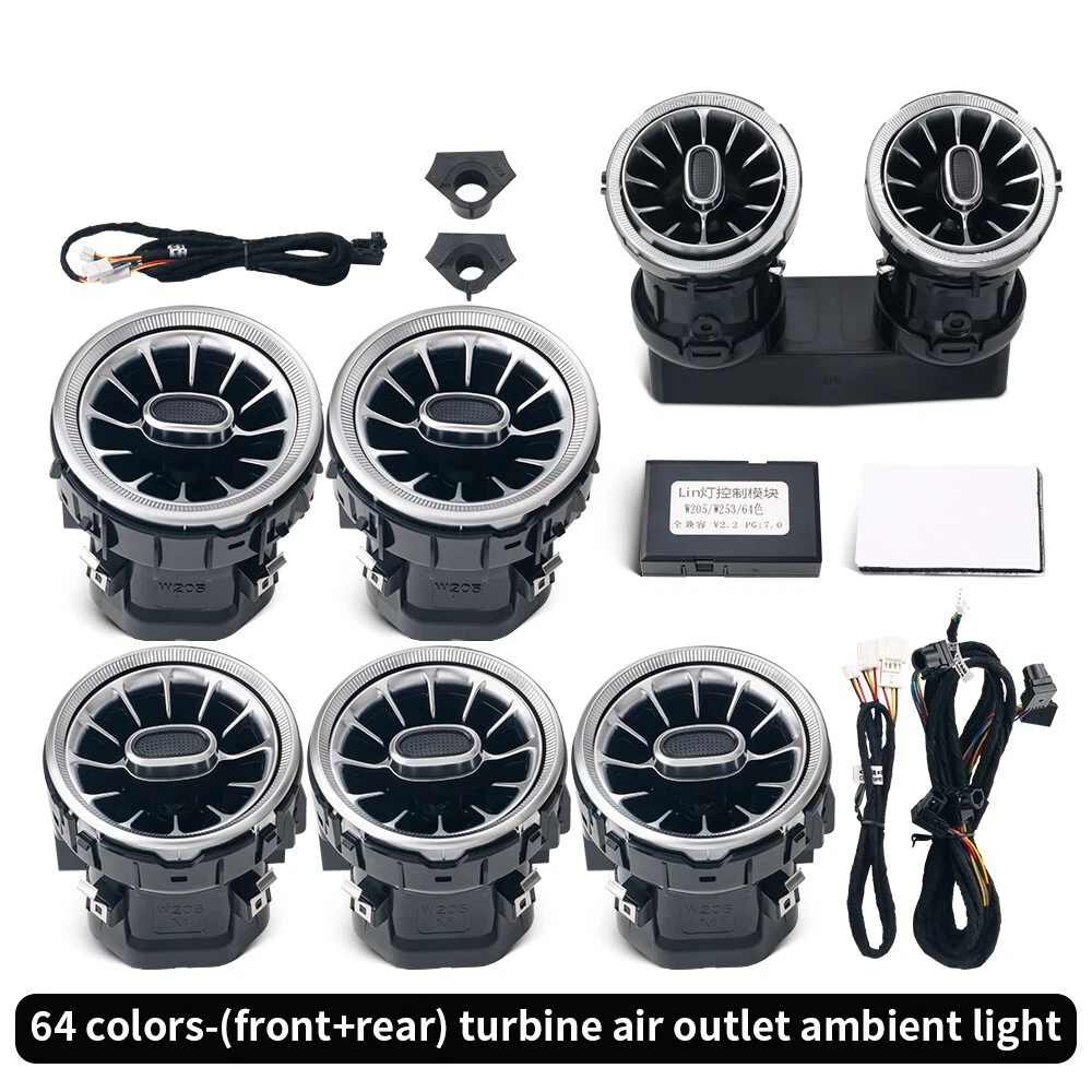 Features: 100% Brand New in Box W205 7PCS/Set 64 Colors NEW Version High Quality Plug and Play Interior Front and Rear Dashboard Air Vent with Ambient Light 1:1 Replacement; NO Modification Required Fitment: For Mercedes Benz C-Class W205 2017 2018 2019 2020 2021( 64 Colors ) - OEM design, fit original air vent position perfectly - Light color is synchronized with original ambient light - Light color and brightness can be controlled by original Command knob Package included: 7 PCS/Set Front and Rear Air Vents with Ambient Light NOTE: NOT Including Installation Guide or Manual. Professional installation is highly recommended .