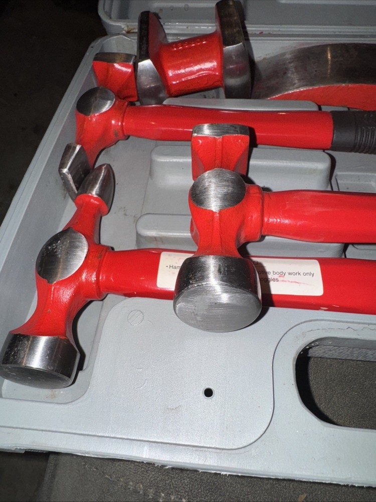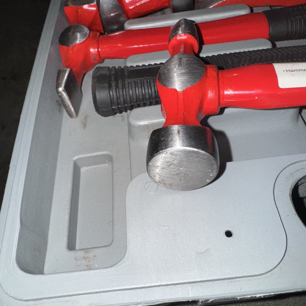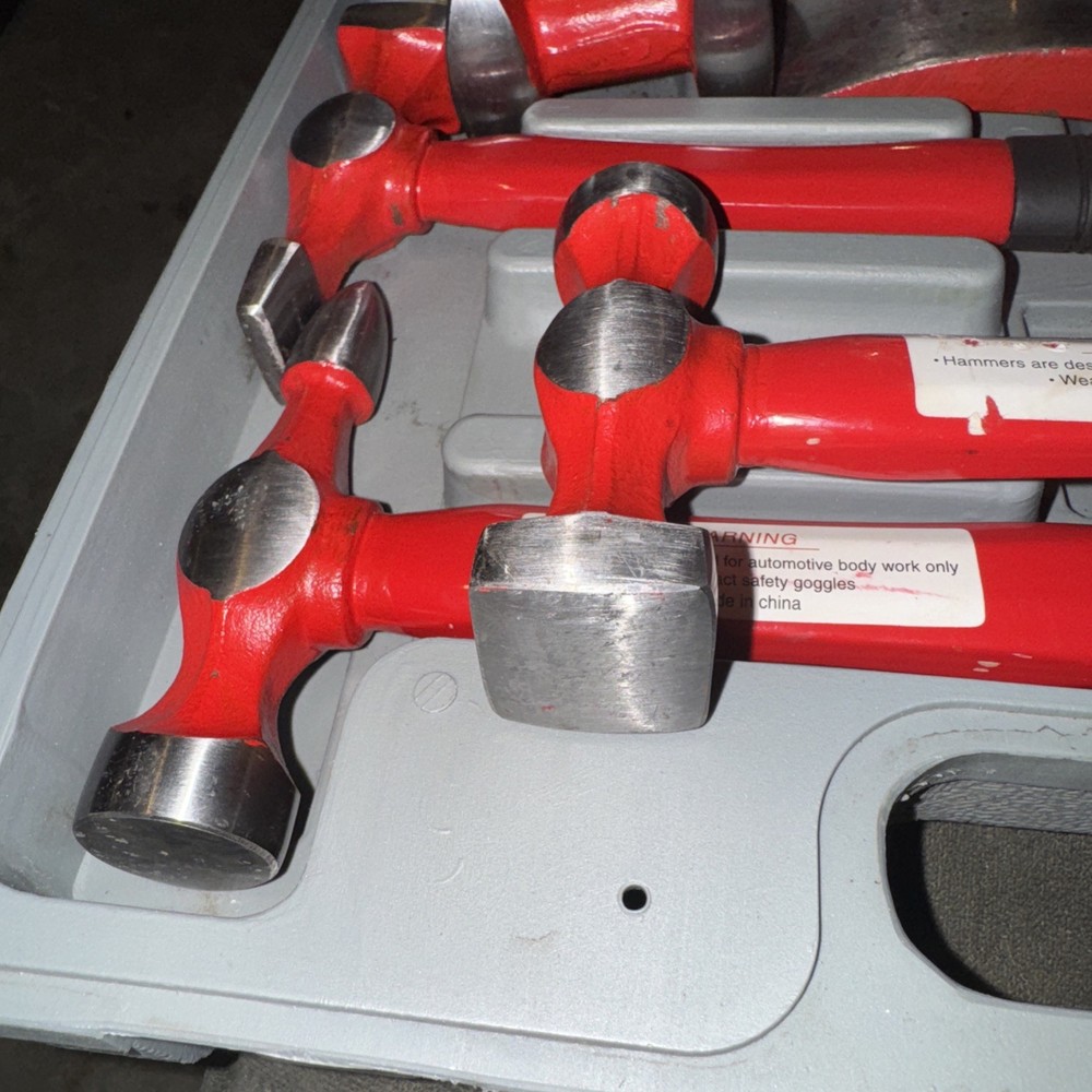 This 7 piece hand car auto body work hammer and dolly fender tool dent repair set kit is a comprehensive set designed for repairing dents in auto bodies. The set includes a hammer and dolly, all neatly stored in a case for easy access and organization. Made in China, this set is a practical and essential tool for anyone looking to fix dings and dents on their vehicle by themselves. With a California Prop 65 warning, users should be aware of potential chemical hazards associated with this product. Has cosmetic blemishes on pieces from transport inside the case. Other than that, it appears to be brand new.