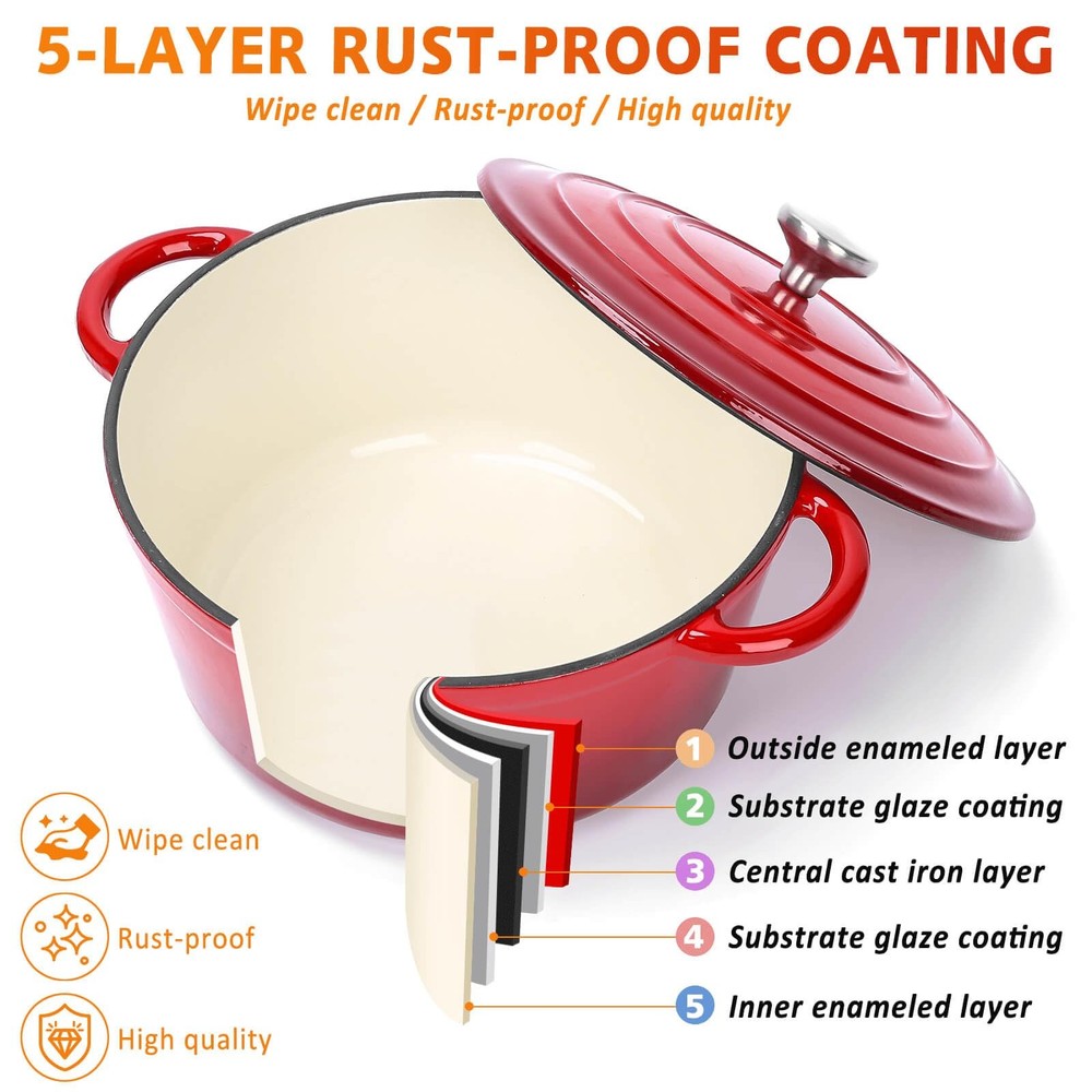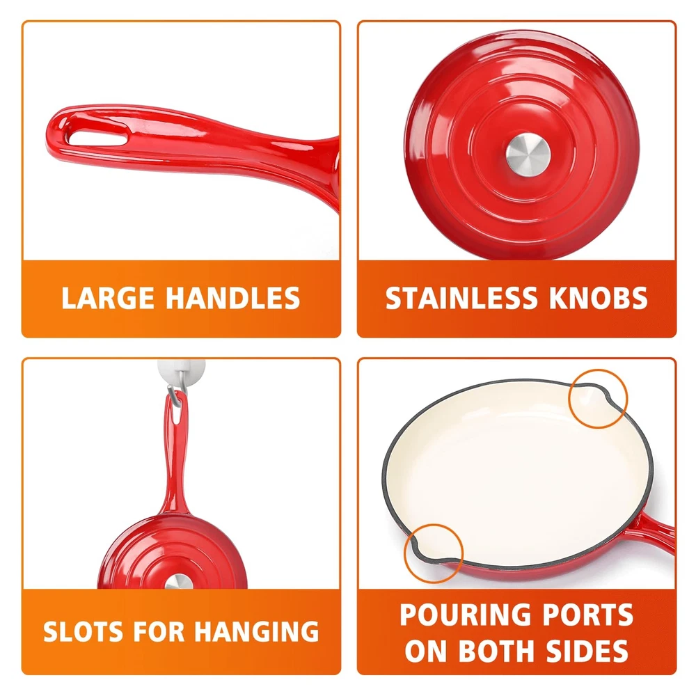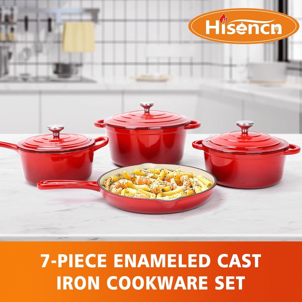 Experience Superior Cooking with Hisencn's 7-Piece Enameled Cast Iron Cookware Set Elevate your culinary skills with our premium quality cookware set, meticulously crafted for exceptional performance and durability. Whether you're sautéing, grilling, slow cooking, braising, boiling, frying, roasting, or baking, this versatile set is your ultimate kitchen companion. What's in the Box: 4.8-Quart Large Dutch Pot with Lid 2.8-Quart Small Dutch Pot with Lid 2-Quart Sauce Pan 10.25-Inch Skillet An excellent gift choice for cooking enthusiasts! Premium Quality: Crafted from durable cast iron. Enameled Coating: Cleanup is a breeze with the coating, which is free from PFOA, PTFE, lead, and cadmium, ensuring healthy cooking. Versatile Cooking: Compatible with gas cooktops, electric, induction, and ceramic stoves. Oven safe up to 550 degrees Fahrenheit. Cleaning and Maintenance: Simply use a soft sponge or rag for cleaning. Avoid using metal utensils to maintain the ceramic coating's luster. Enclosed Thermal Self-Circulating: The lids feature a raised design that allows water vapor to circulate through the pan, preserving nutrients and moisture in your food. The snug fit ensures nutrients and water are retained without overflowing. [Complete 7-Piece Set for Versatile Cooking] - This enameled cast iron cookware set includes a 4.8-quart large Dutch oven with lid, 2.8-quart small Dutch oven with lid, 2-quart sauce pan, and a 10.25-inch skillet. Perfect for a range of cooking techniques, from sautéing and grilling to slow cooking, roasting, and baking—an ideal gift choice for home chefs! [Premium Ceramic Coating for Easy Use] - Crafted with 5 layers of durable ceramic enamel coating, this ceramic cast iron cookware set ensures effortless easy-cleaning performance. The layers include a sturdy cast iron interior, base glazes, and an exterior enamel, making it resistant to cracking, scratching, and chipping. The PFOA, PTFE, lead, and cadmium-free coating makes cooking healthier, while messes can be wiped clean with a single swipe—your trusted partner in easy, enjoyable cooking. [Enhanced Heat Distribution & Retention] - Made from high-quality cast iron, this ceramic coated cast iron cookware set heats evenly and retains heat exceptionally well, allowing food to cook thoroughly and stay warm longer. Enjoy perfectly cooked, succulent dishes every time, with even heat that brings out the best in every meal. [User-Friendly Design with Thoughtful Features] - Each piece in this enameled cast iron pots and pans set includes ergonomic handles for easy transfer from stovetop to oven, and the lids feature stainless steel knobs for durability. The skillet is designed with pouring spouts on both sides for drip-free serving, while the handles include perforations, making storage convenient and adding style to your kitchen and table. [Self-Circulating Lids for Optimal Flavor] - The Dutch oven and sauce pan lids are designed with a unique raised pattern, allowing water vapor to circulate within the pan, locking in nutrients and moisture, and distributing them evenly across your food. This thermal self-circulating feature helps preserve the natural flavors and nutrients of your ingredients, providing consistently delicious and healthful meals. [All-Cooktop Compatibility & Oven Safe] - This versatile enameled cast iron cookware set is compatible with gas, electric, induction, and ceramic cooktops, and can withstand oven temperatures up to 550°F. Perfect for everything from stovetop searing to oven roasting, making it a reliable choice for all types of culinary adventures. [Effortless Cleaning & Maintenance] - The smooth enamel coating makes cleaning quick and easy. Simply wipe down with a soft sponge or cloth, or for tougher stains, soak in warm water and use baking soda or a mild detergent. Avoid metal utensils to protect the enamel finish and preserve its pristine appearance over time. [Hisencn Quality Assurance] - Each enameled cast iron pots and pans set undergoes a rigorous inspection process for quality assurance. If your item arrives with any issues, our 24/7 customer support team is here to assist you promptly, with a 1-year warranty for any quality concerns.