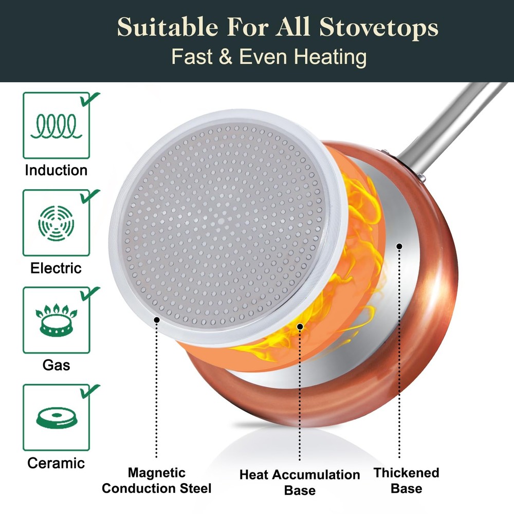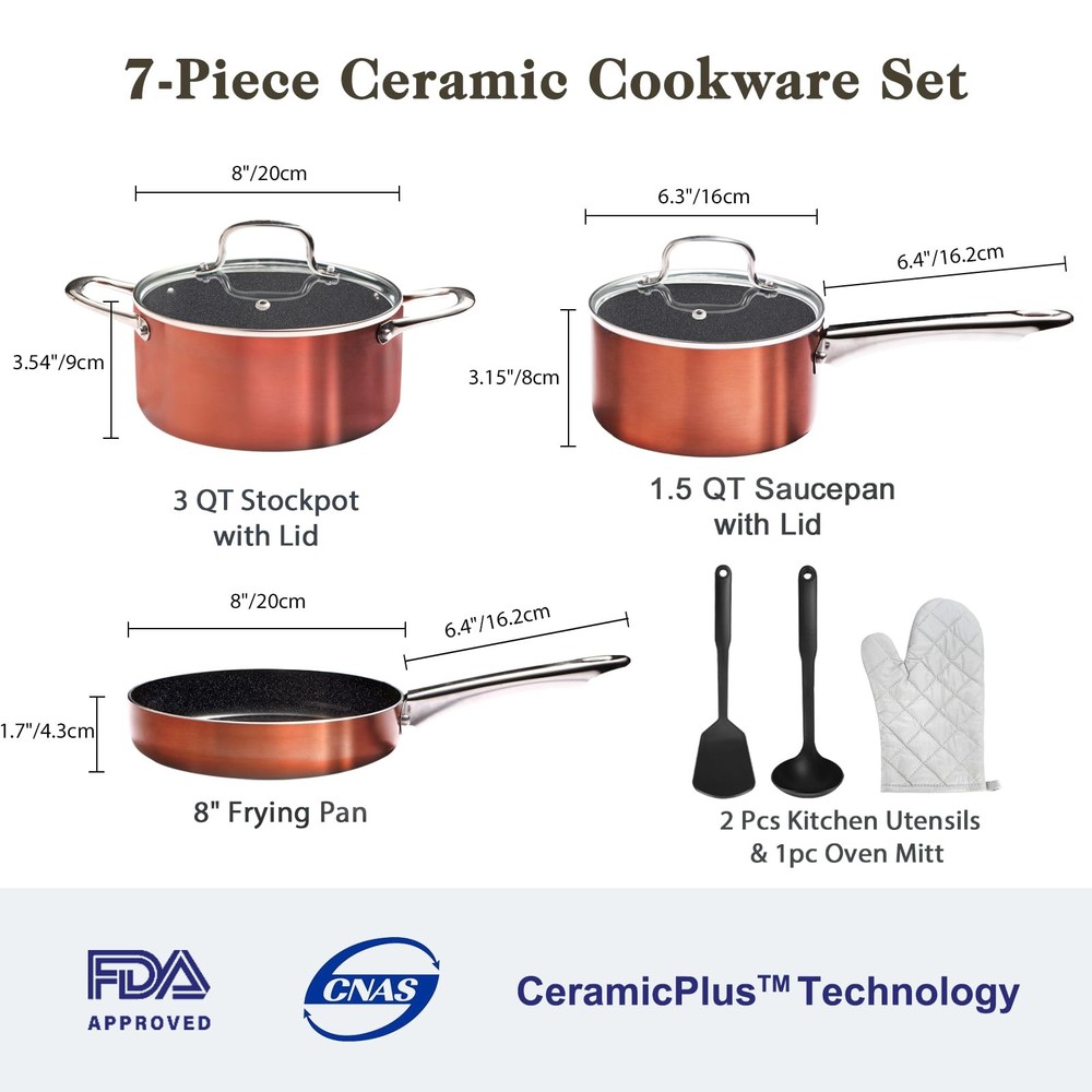 Nonstick Ceramic Cookware Set, Copper Pots and Pans Set 【All in One Little Set】offers high quality kitchen pots and pans set without assembly: 8" non stick frying pans, 2 piece saucepan set including 1.5 quart sauce pan with lid and 3 quart casserole pot with lid, 2 nylon kitchen utensils set (Turner+Spoon). Versatile non stick pot and pan set meets all your need for every day cooking. Perfect ceramic pots set for compact kitchen 【Nonstick Ceramic Cookware】induction pots and pans feature long-lasting ceramic nonstick coating, makes cooking more enjoyable and easier. EUROFIN approved, 100% free of PFAS/PTFE/ PFOA/lead/cadmium. Clean up is quick & easy, simply rinse or wipe with a damp paper towel. Enjoy healthier and easier cooking with ceramic pots and pans set non stick 【Premium Cooking Pan Set】induction cookware sets is aesthetically made for everyday cooking. Rustic copper color and nonstick ceramic interior is attractive yet functional. Food just glides off the surface, requiring minimal oil for healthier cooking. Pot set comes with elegant gift box, best choice as cookware starter set for family use and house-warming gifts 【Stovetop & Oven Safe】This nonstick cookware set is crafted from heavy-duty aluminum, heats up quickly and evenly. Low or medium heat is recommended. High magnetic conductive steel base is compatible with all cooktops including induction, gas, electric, ceramic and so on. Our non toxic cookware set is oven and broiler safe up to 550°F, providing you with more choice for cooking and baking 【Stainless Steel Handles】This copper pots and pans set is equipped with ergonomic stainless steel handles, featuring non-slip and easy-to-grip. Suggest to hold with a glove when heating on gas stove. Durable glass lids with steam vent for a clear view on food while cooking, lock the best taste of the food