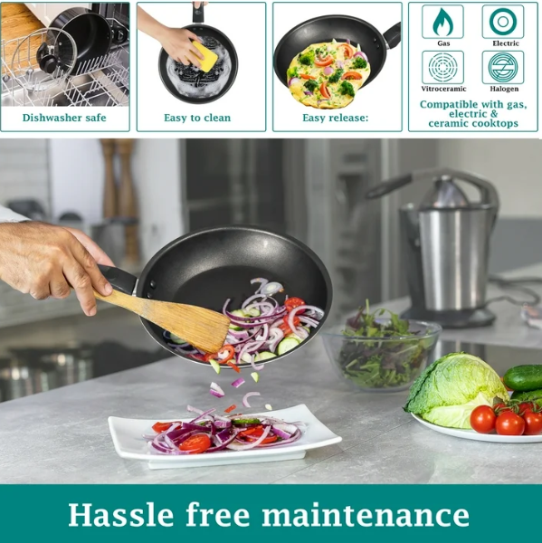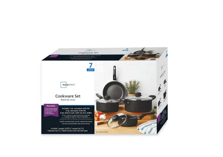 Prepare everything you need for amazing meals with the Mainstays Stainless Steel 10-Piece Cookware Set. Including one 8.5” sauté pan, one 1-quart saucepan, one 2-quart saucepan, one 4-quart Dutch oven, 3 vented glass lids, 1 solid serving spoon, 1 slotted Mainstays 7 Piece Non Stick Aluminium Cookware Set, Black Includes a 1 Qt. saucepan with lid, 2 Qt. saucepan with lid, 4 Qt. Dutch oven with lid, and an 8-inch frying pan Non-stick finish for easy food release and cleanup Lightweight design for easy maneuverability, perfect for both experienced chefs and beginners Dishwasher safe for convenient cleaning Constructed from durable aluminum for even heat distribution