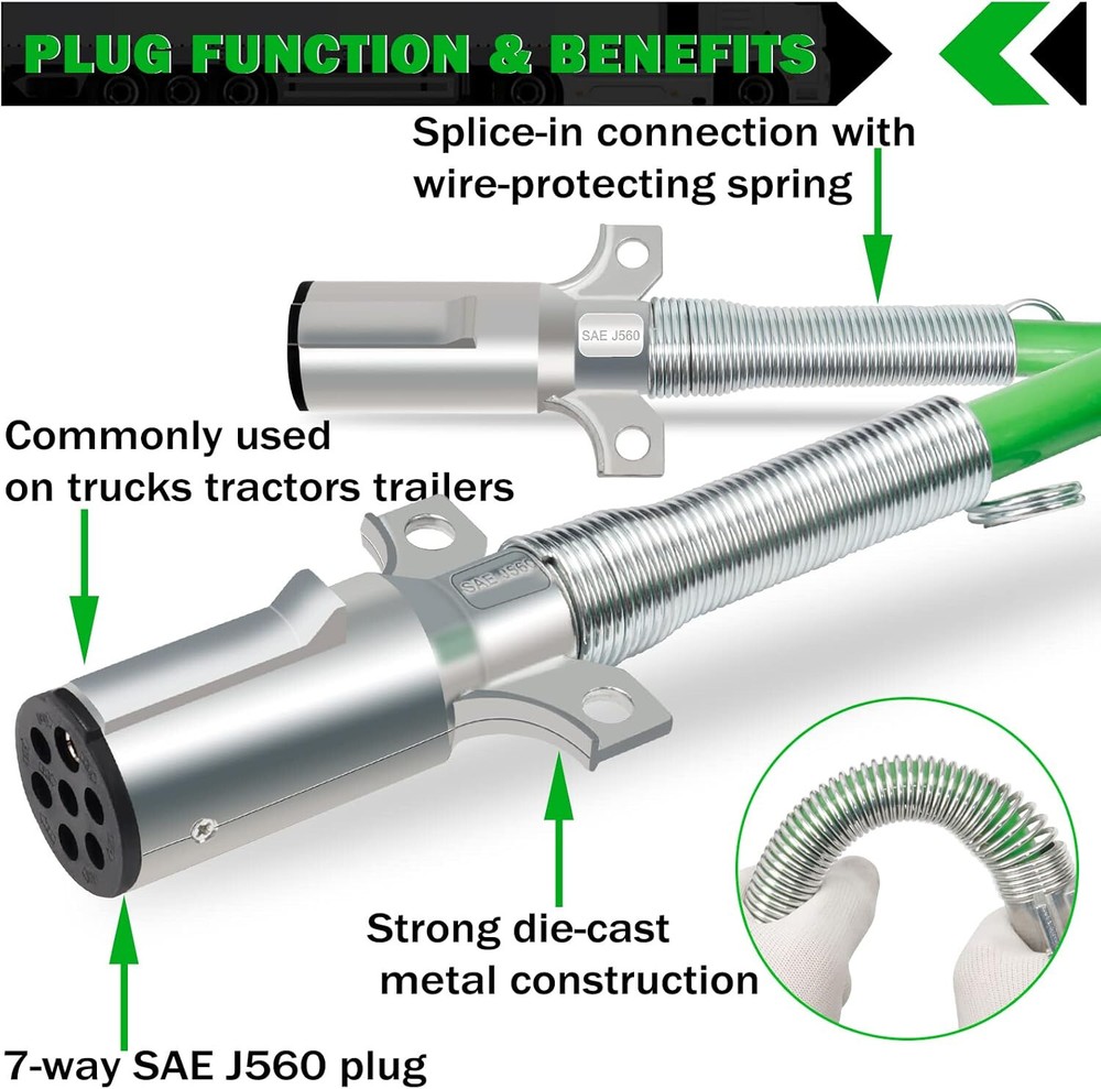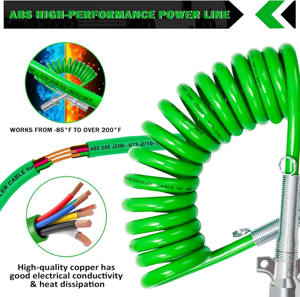 Store New Arrivals Add to Favorite View Feedback Contact 7 Way Coiled Trailer Cord 15 FT Green ABS Electrical Power Coil Heavy Duty Cable Power Wire for Semi Trucks Tractors Description Number of Cable Strands 1 strand No of wires 7 Color 15 FT COILED Brand CheeMuii Material Manufacturer Part Number RLX-HC8053 Item Weight 6.03 pounds Voltage 24 Volts Manufacturer Cheemuii Package Dimensions 13.74 x 6.69 x 4.57 inches Size 15 FT COILED CORD ELECTRICAL POWER CORD: 7 Wire Trailer Cord is made of high-quality pure and has a longer service life. And with excellent conductivity and thermal conductivity to ensure normal use of lights (such turning signals and braking lights) during driving SAE J560 PLUG: 7-Way plug: 100% meets SAE J560 testing and performance requirements. The zinc die plugs that meet the industry standards are not easy to deform or rupture, and effectively transmit the power from the engine to the semi truck trailer tractor SPRING JOINT: The two ends of ABS cables are protected by 3.94 -inch stainless steel spring. Springs with good elasticity can not only protect the wires well, but also have a cushioning role when installing and using a wire SPECIFICATIONS: 15 FT ABS 7 Way Electrical Cable: [TRUCK/TRAILER CABLE for ABS SAE J2394 - 4/12-2/10-1/8 -65°C/-85°F (Green)] - [SAE J560 for Plug] - 7 P/24 V REPLACEMENT: Replace for Philips 30-4621, for Velvac 590161, for PDC EL27715, for Tectran 7ATG522MG, for Tremec 4D015, for Sloan 421130 Product Description ABOUT US We offer the best prices around on high quality products. Our E-store includes media such books, movies, music and games while offering electronics, toys, sporting apparel, clothing, tools, general home, garden items and more. SHIPPING We are always working hard to ensure your package arrives soon possible. Please understand that some factors like weather, high postal traffic, and the performance of shipping companies are outside of our control. For shipping outside of the continental USA, we only use eBay's Global Shipping Program.The item is shipped to KY and then sent to the rest of the world. International customers are responsible for all duties and taxes. Continue to check out in order to calculate costs for shipping the item to your country. Messages regarding eBay's Global Shipping Program MUST be directed at eBay EXCLUSIVELY. RETURNS We offer a 30-Day Return Policy on items which you are not completely satisfied with. You have the option for a full-refund or an exchange of the item. No returns are available on items shipped outside of the USA. PAYMENT We accept PayPal. CONTACT US This page content is yet to come Please ad us to your favorite seller and visit again later Thank You CUSTOMER SATISFACTION We try our very best to make sure every customer is completely satisfied. If there's a problem, message us! We're happy to help. WE ACCEPT © 2021 AutoDS. | All Rights Reserved
