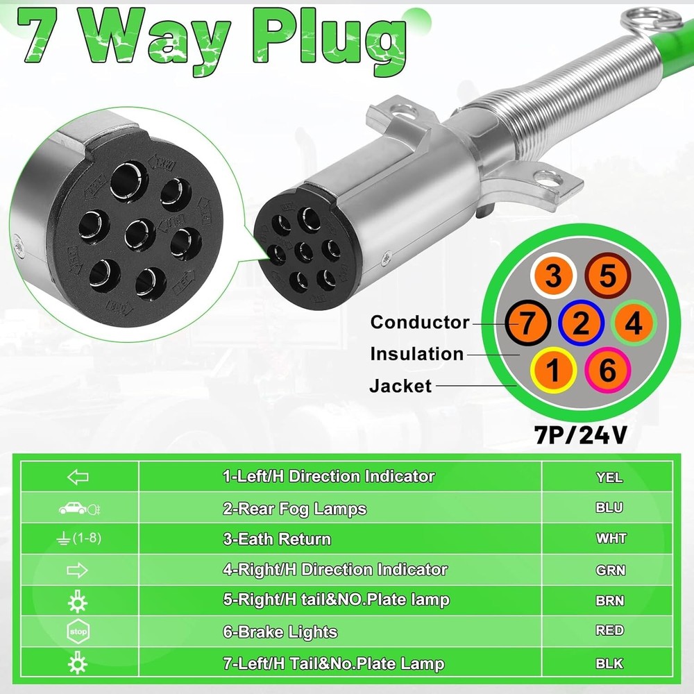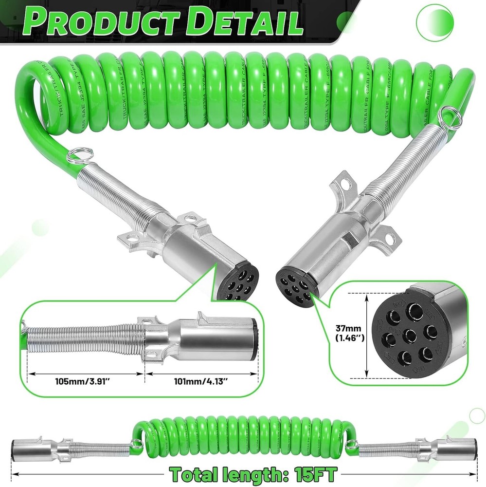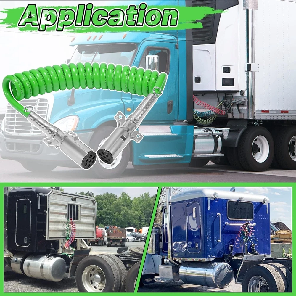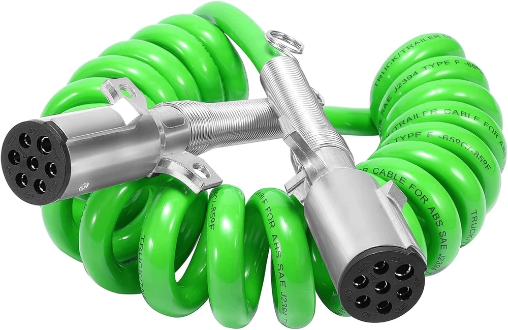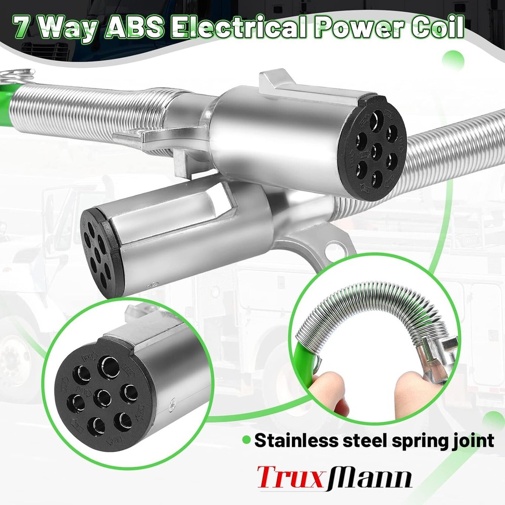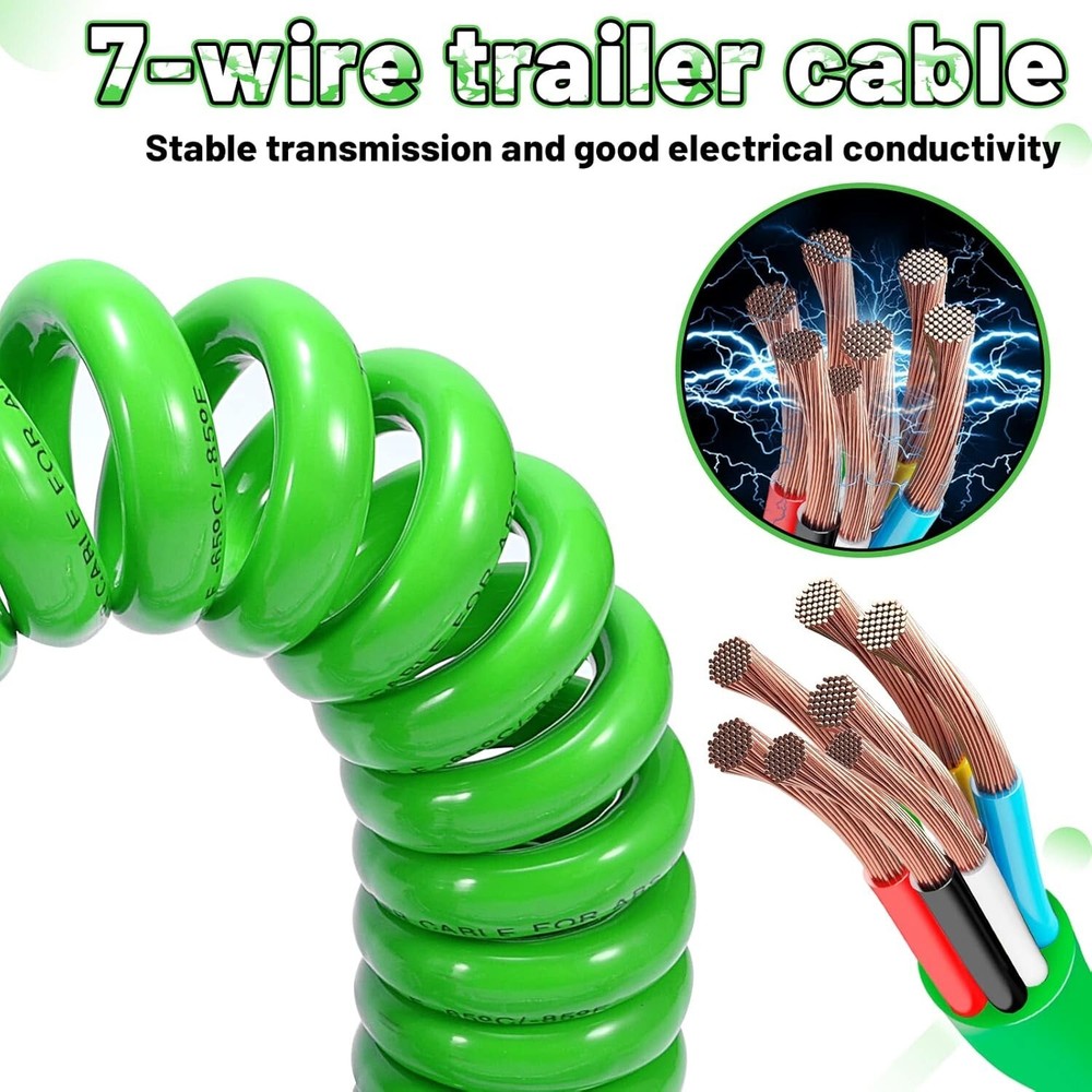The 15FT 7-Way Coiled Trailer ABS Cord Green Electrical Power Cable Wire is a high-quality, durable solution designed for semi-trucks and trailers, providing reliable electrical connectivity for braking and lighting systems. Below are the key details: Product Details : Type : Coiled 7-Way ABS Trailer Cord Length : 15 feet (coiled) Color : Green Connector Type : 7-Way Round Plug Application : Electrical power supply for semi-trucks, trailers, and other commercial vehicles. Features : Heavy-Duty Construction Made from durable materials that withstand harsh conditions, including heat, cold, abrasion, and road debris. Coiled Design Compact and flexible, allowing for stretch and recoil to prevent tangling and dragging. 7-Way Plug Standard connector for trailers, supporting power to ABS systems, lights, and other electrical components. Weather-Resistant Designed to handle extreme weather conditions, ensuring consistent performance. Color-Coded Wiring Green cable ensures easy identification and organization. Applications : Semi-Trucks : Reliable electrical connection for trailers. Trailers : Powers ABS systems, lighting, and auxiliary electrical components. Commercial Vehicles : Suitable for buses, vans, and other large vehicles requiring a 7-way electrical connection. Benefits : Improved Safety : Ensures reliable operation of ABS systems and lighting for better visibility and braking control. Durability : Coiled design prevents wear and tear caused by dragging or stretching. Ease of Use : Simple plug-and-play connection with universal 7-way round connectors. Weatherproof : Resistant to environmental factors, ensuring long-lasting performance. Installation Tips : Inspect Connectors : Ensure the vehicle and trailer connectors are clean and free of corrosion before attaching the cord. Align Correctly : Match the plug pins with the vehicle's socket for a secure connection. Check Tension : The coiled design should stretch enough to connect the truck and trailer without being overly tight. Test the System : After installation, verify that all connected systems (lights, brakes, etc.) are functioning properly. Optional Features (Available in Some Models) : LED Indicator : Confirms proper power flow through the cord. Double-Spring Cable Ends : Provides added strain relief at connection points. Shielded Cable : Offers additional protection against electrical interference.