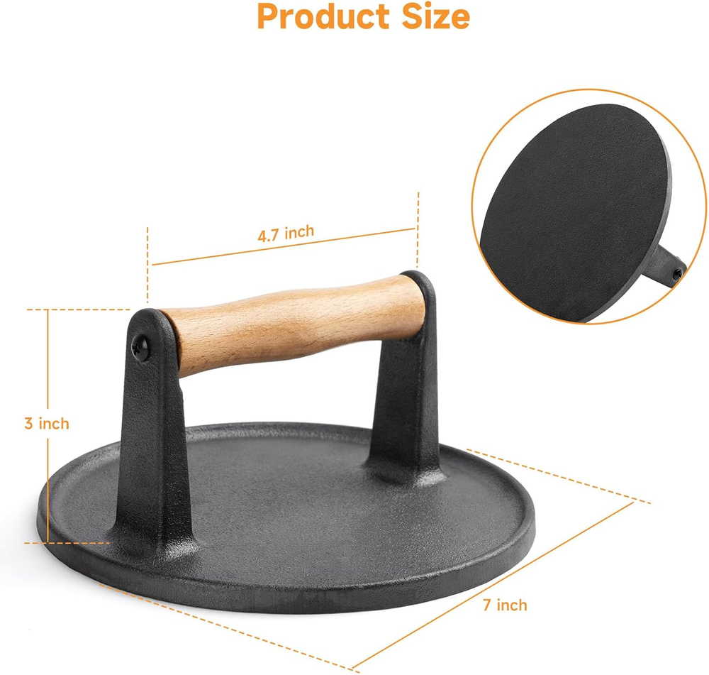 7" round Burger Press Accessories for Blackstone Griddle Indoor Outdoor Cooking 7" Burger Press: This 7" burger press could cook two flavorful burgers or patties at once, reducing cooking time Heavy Duty: The pre-seasoned cast iron press enhances the culinary effect and easily smashes the patty down to a flat patty shape like a pro Heat-Resistant: The ergonomically elevated wooden handle ensures a safe and comfortable grip without fear of burns Versatile Use: Enjoy grilling delicious burgers, bacon, steaks on griddles, frying pans, flat-top grills, etc Easy to Clean: Easily wash with water or toss it directly into a dishwasher. Simplify your post-meal cleanup Product Description Ergonomic Wooden Handle Enhanced safety and comfort with heat-resistant and elevated handle. Heavy-duty Thickened Press Effortlessly smash the patty to a flat patty and improve the cooking efficiency. Pre-seasoned Bottom Non-stick and rust-resistant for cooking perfect, flavorful patty burgers. Item Weight 2.2 pounds Item model number 01CBA091_AM01US09 Product Dimensions 7 x 7 x 3 inches Size 7 inch, Round Shipping Fast shipping is very important for us. Our expedited US shipping service is FREE. Your order will be shipped within 2 business days upon full payment received. Your order will be delivered within 2-3 business days after the handling time. Warranty & Returns 30-Day FREE Return Policy offered for unsatisfactory items. Options include: Refund or Exchange for another item. Contact us Customer satisfaction is our top priority. If you encounter any issues with our product, please don't hesitate to reach out to us. We are committed to ensuring your satisfaction and will go above and beyond to assist you. Your happiness is our goal! Thank you for shopping at our store.
