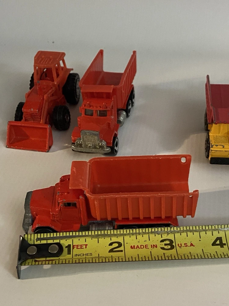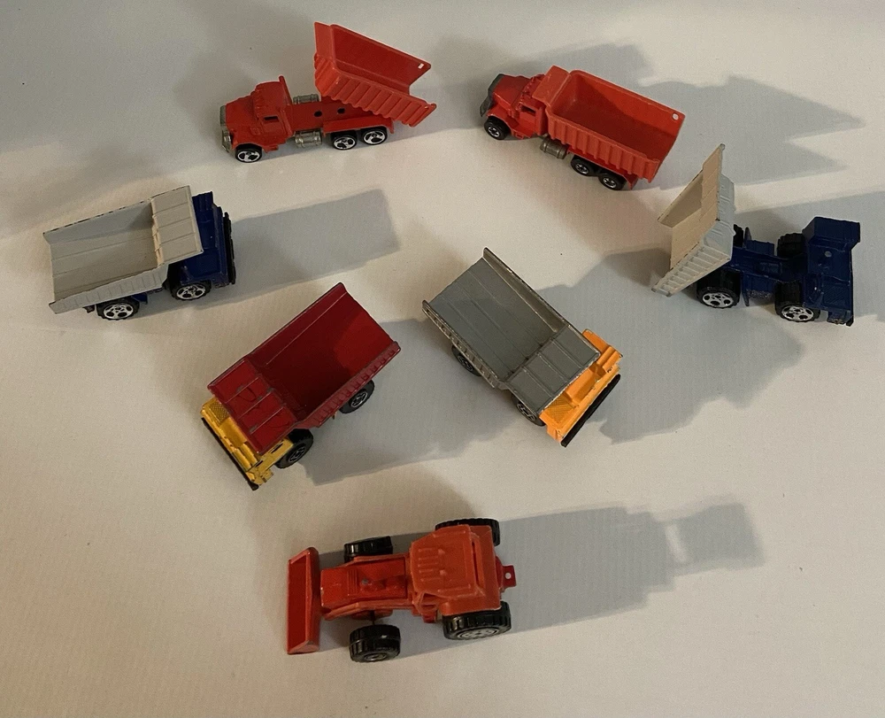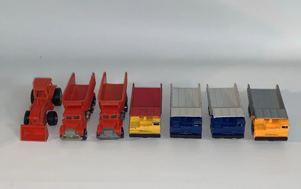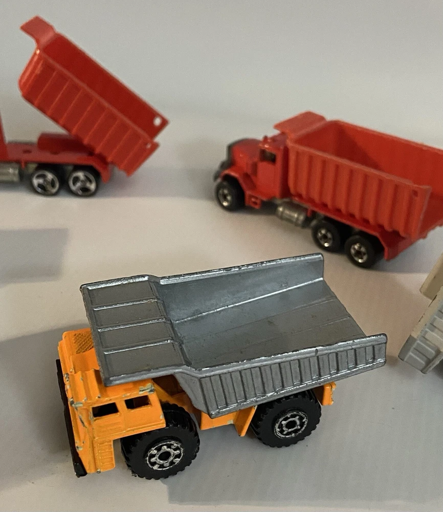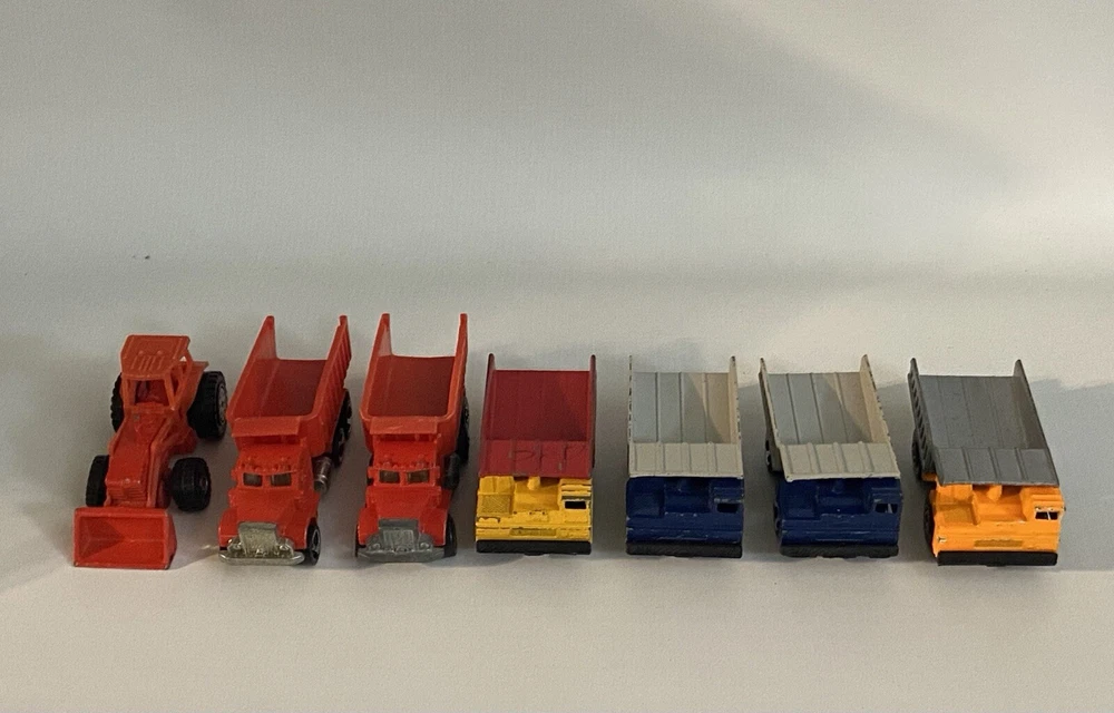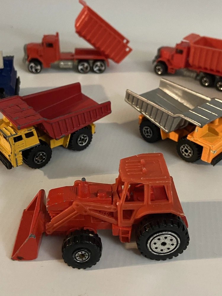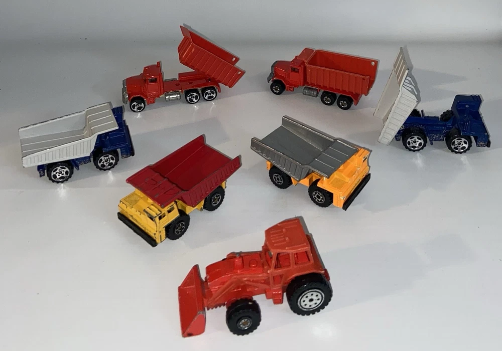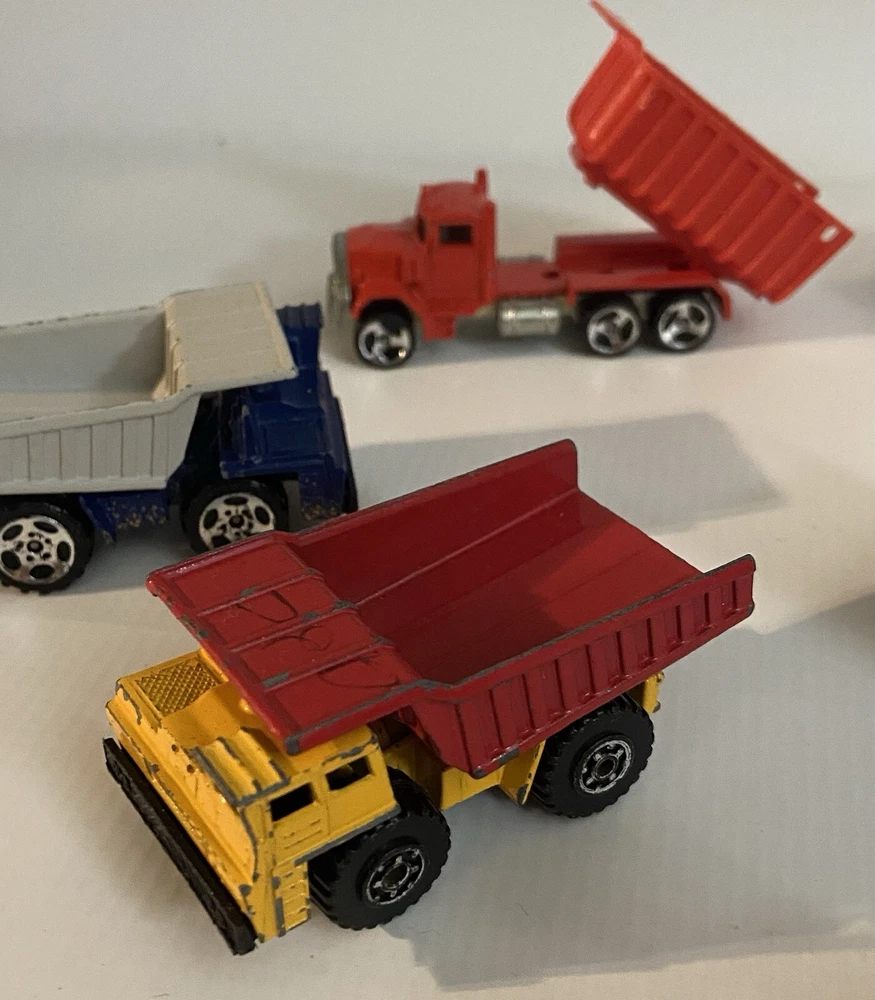 7pc Lot 1979 1989 Hot Wheels & Matchbox Dump Trucks + Tractor ~ there are 4pc 1:140 Matchbox 1989 Dump Trucks, 2pc 1979 Hot Wheels Red Long Bed Dump Trucks, & 1 Hot Wheels 1991 Red Tractor. NOTE: the two long bed red dump trucks are missing their back gates, also the lot shows some cosmetic wear consistent with being played with as shown in photos, includes all 7 pieces.