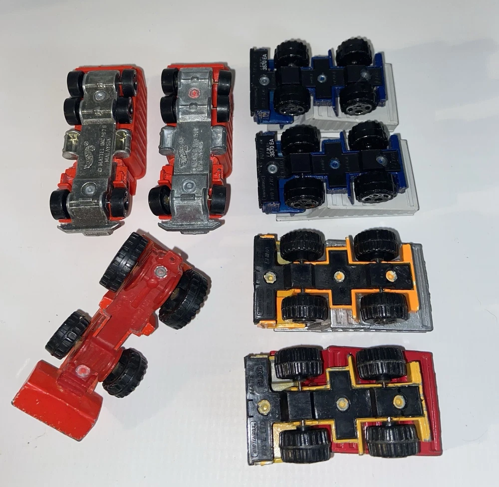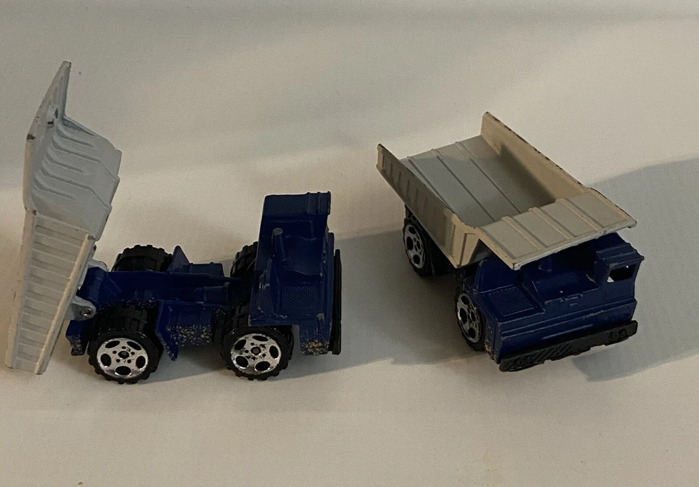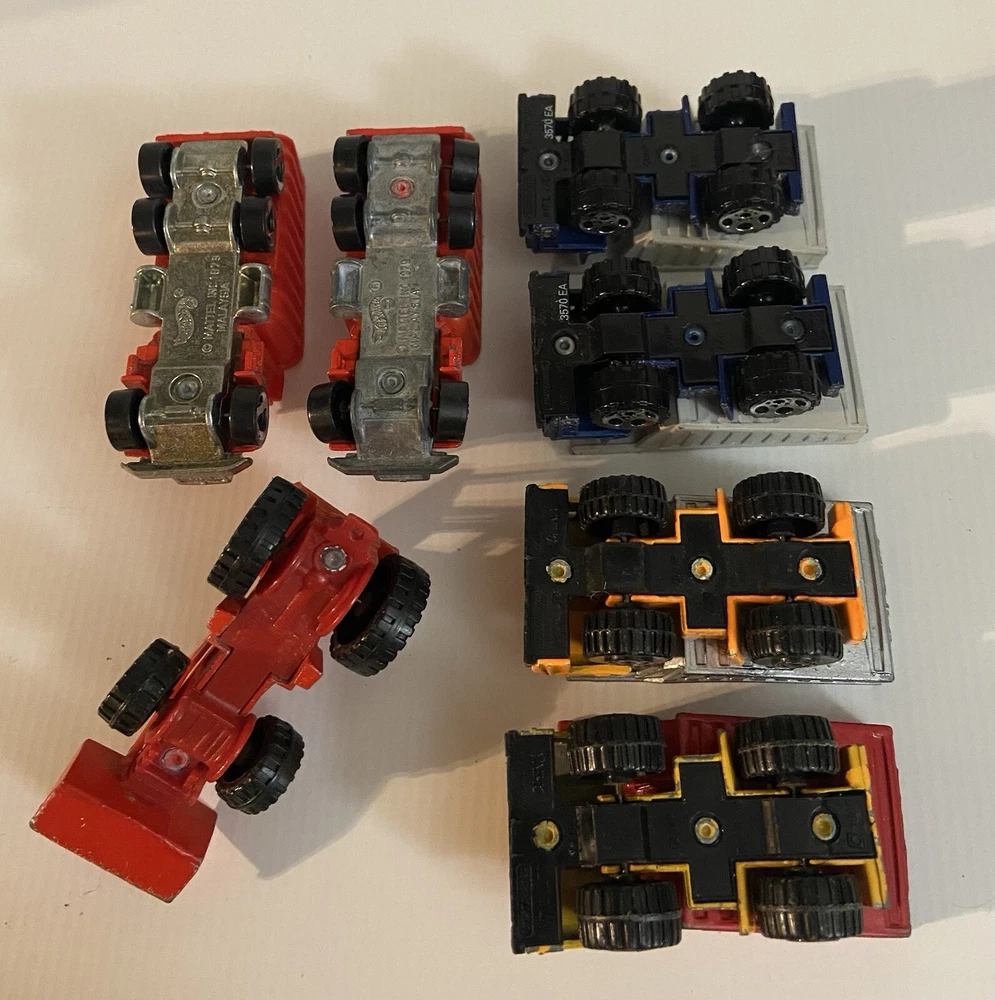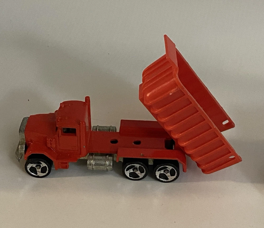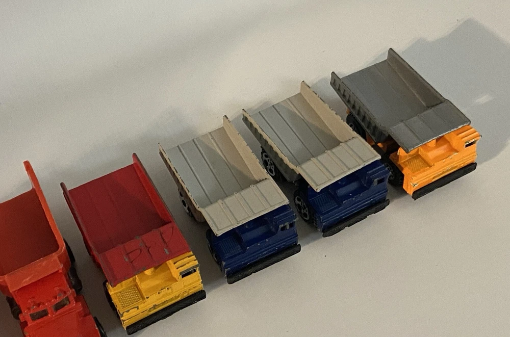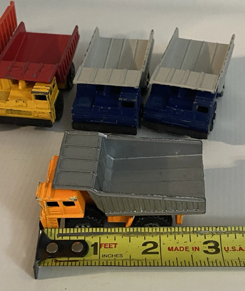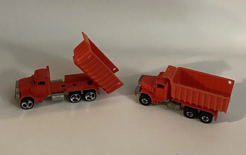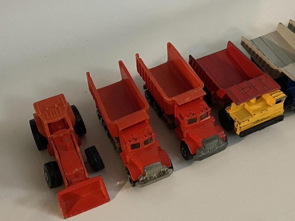 7pc Lot 1979 1989 Hot Wheels & Matchbox Dump Trucks + Tractor ~ there are 4pc 1:140 Matchbox 1989 Dump Trucks, 2pc 1979 Hot Wheels Red Long Bed Dump Trucks, & 1 Hot Wheels 1991 Red Tractor. NOTE: the two long bed red dump trucks are missing their back gates, also the lot shows some cosmetic wear consistent with being played with as shown in photos, includes all 7 pieces.