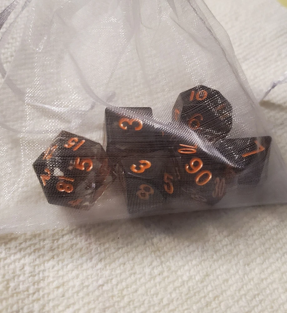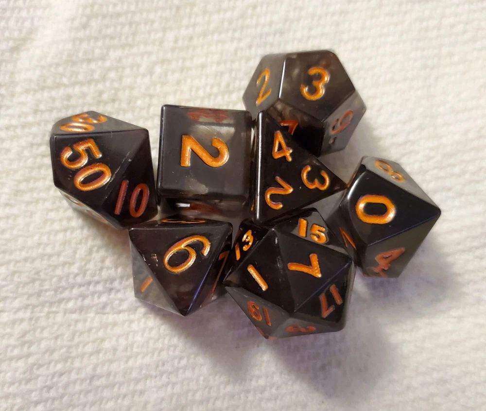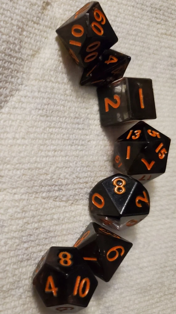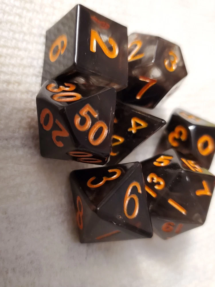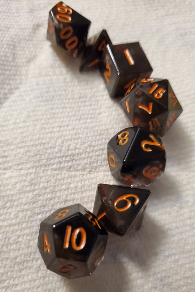 7pcs Set Of Handmade Resin Polyhedral DnD Gaming Dice: black dice with pumpkin orange colored numbers painted on visibly making the dice perfect for gaming of any sort, but especially around Halloween. Properly weighted for play and obviously beautiful for display. Great gift for any DnD gamer or collector. Comes with a storage bag that's also great for transportation for those game nights at friend's houses!