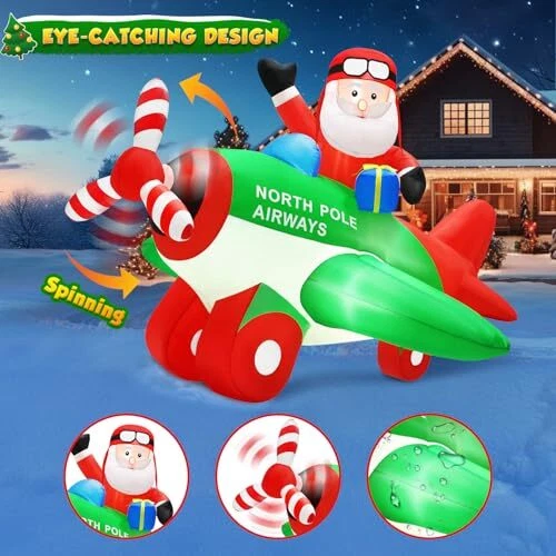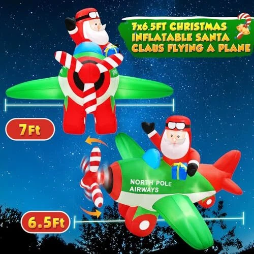 30 Days Return Policy Fast Delivery Trusted seller 7x6.5FT Christmas Inflatables Decorations Santa Claus on Animated Airplane, Christmas Blow Up Decorations Outdoor Flying Polar Airplane Plane Built-in Bright LED Lights for Xmas Holiday Party Product Description 【7x6.5FT Eye-catching Christmas Inflatables Santa Claus on Animated Airplane with spinning propeller and LEDs】 7FT Christmas Decoration Santa Claus Flying a Polar Airplane carrying a gift box, with the spinning propeller seems like the plane is about to take off to deliver presents. Built-in bright LEDs lights instantly light up your yard and easily attract the attention of your neighbors specially children, makes your yard full of children’s cheer! 【Extra 180W Powerful Stronger Blower for Continuous Spinning and Stable】Our upgrade feature above others is that we equip it with a 180W upgraded powerful blower (equal to 5 times the power of other) that can keep the propeller Spinning continuously! And ensure the Christmas inflatable outdoor decoration self-inflate within 1 minute. The attached stakes, ropes and a sandbag can fix the inflatable Christmas decorations on the ground and stay firmly. 【Unique Santa Flying Airplane Appearance Creates Pleasant Christmas Atmosp】The 7FT Christmas decorations outdoor Santa on airplane with a gift box to celebrate Christmas holiday with your guests and family. The vivid design and built-in LEDs create a cheerful atmosp, perfect Christmas photo spots in the garden, and make your house become more popular and unique at Christmas.(Note: Please connect the connection ports that the blower and the LED light.) 【Waterproof & Tear-proof Material for Outdoor Use】 Christmas blow up yard decorations is made of high-quality durable thicken polyester, airtight excellently for full inflation and not easy to be pierced by hard things, weatherproof and fade resistant, suitable for indoor or outdoor use. Even in poor weather, it will not be blown down easily. 【Perfect Merry Christmas Gifts for Christmas Eve Night】The Christmas decorations inflatables create a charming centerpiece for your Christmas display, and attracts both grown-up and younger to take photos and give them an unforgettable night, perfect Christmas gifts for Christmas Eve activities, Christmas Party, and More. Enjoy Christmas with your family! Shipping Returns Payment Shipping Shipping is FREE to all addresses other than APO/PO boxes in the lower 48 states. All our stock ships from US-based warehouses. Shipped via USPS or UPS (depending on location and package weight) Unless stated otherwise, all orders will ship within 24-72 hours of your payment being processed. Check our feedback to see the great reviews of FAST shipping we offer. Returns As our valued customer, we will do our best to make sure the product you receive arrives to you on time and as expected. If you are not satisfied with your purchase, please contact us within 30 days of receiving your order to process a return. Payment We currently accept payment via eBay managed payments only. Once payment is cleared, we will dispatch your shipment within 1-3 business days. Please refer to the "Shipping" tab for more information regarding shipping speed to your destination.