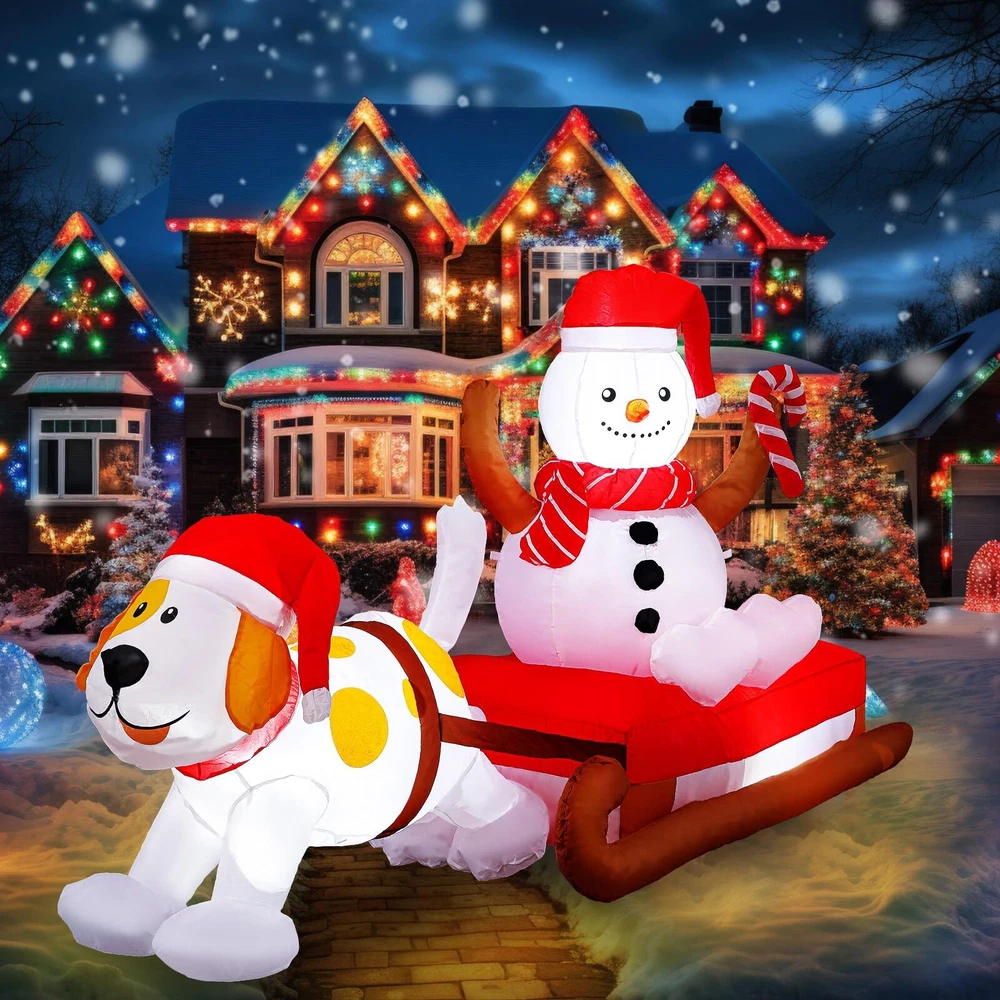 Features: Complete Combination: A full set of outdoor inflatable Christmas decoration installation components is provided. The Christmas inflatable is fixed to the ground with 6 windproof stakes, 2 ropes and 2 sandbags, allowing it to stand without support, no need to worry about it being blown away by the wind. Powerful blower and continuous airflow inflate the Christmas outdoor inflatable toys. Repeatedly durable: The inflatable outdoor holiday decorations are made of high-quality thick, waterproof polyester cloth, no need to worry about being blown away by the wind or damaged by rain. The outdoor inflatable Christmas decorations are durable and can be reused for a long time. Specifications: Material: polyester Color: multicolor Size: about 8 ft (L) Package Includes: 1 x Christmas Inflatables Decoration 1 x Blower 1 x Transformer 2 x ropes 2 x sandbags 2 x buckle 3 x LED light 6 x plastic stakes Notes: Manual measurement, there may be slight size errors. Due to different screen displays, there may be slight color differences. Magical Night Christmas Decoration: this is an 8-foot Christmas inflatable decoration of a puppy pulling a snowman on a sleigh; The puppy and the snowman are wearing red Santa hats, and the snowman is wearing a red scarf; It is cleverly integrated into Christmas, bringing you a lively and warm atmosphere of Christmas, and is loved by children and passers by Bright LED Light Design: the Christmas courtyard inflatable has built-in super bright 3 LED lights, which will make the interesting Christmas inflatable decorations look very real and conspicuous at night, becoming an attractive and decorative courtyard near you, setting off a lively and happy holiday atmosphere Durable Waterproof Material: The inflatable dog pulling snowman is made of 190T waterproof polyester cloth, and the pattern printing uses high-grade ink; Passed European ROHS test certification, waterproof, lightweight, and fade-resistant; Excellent stitching improves the durability of the inflatable outdoor holiday garden decoration Safety Reinforcement and Fast Inflation: equipped with 6 plastic ground plugs and 2 PP ropes and 2 fixed sandbags, it makes it more stable, and there is no need to worry that the Christmas outdoor decorations will fly away with the wind; The equipped fan is made of high-strength ABS plastic, And equipped with a transformer, plug and play, convenient and fast, fast inflation speed, improves your installation convenience and experience Versatile Decoration Options: you can put our outdoor Christmas decoration yard on the front porch, living room, roof, terrace, garden, cafe, restaurant, hotel, shopping mall, party, celebration, to create a fun and memorable Christmas Eve holiday