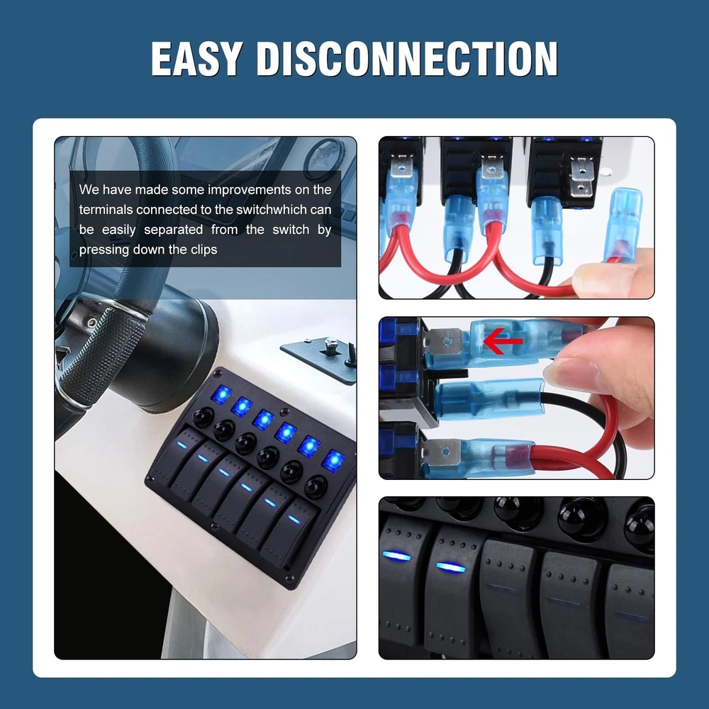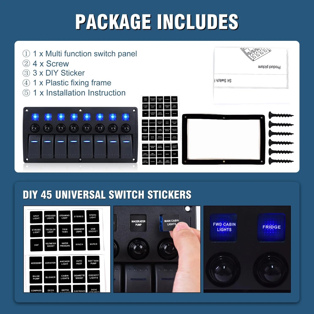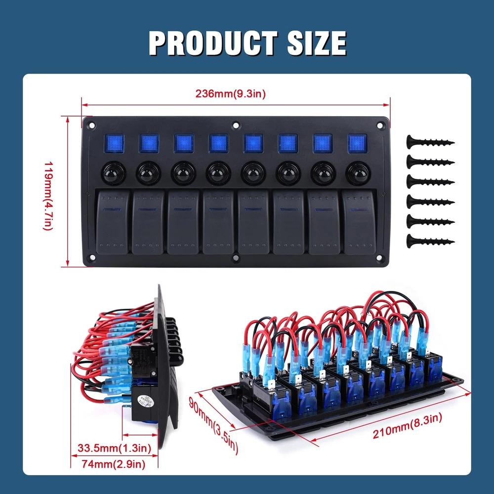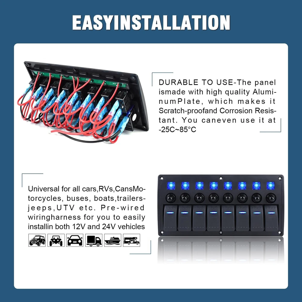 8 Gang Waterproof Toggle Switch Panel 12V/24V On-Off 3 Pin Marine Switch Panel with Circuit Breaker LED Light Pre-Wired Switch Panel for Marine Boat Automotive Car RV Truck Jeeps UTV Vehicles Product Details Size: 8 Gang Brand: GGTA MPN: HN-S8 UPC: Does not apply EAN: Does not apply Operation Mode: ON-OFF Current Rating: 20.01 Amps Operating Voltage: 12 Volts Contact Type: Normally Open Connector Type: Plug In Brand: GGTA Terminal: Through Hole Item dimensions L x W x H: 7.2 x 4.7 x 2.95 inches Circuit Type: 8-way Actuator Type: Rocker Product Dimensions : 7.2 x 4.7 x 2.95 inches; 1.46 Pounds Date First Available : July 24, 2023 Manufacturer : GGTA Country of Origin : China Best Sellers Rank: #273,168 in Automotive (See Top 100 in Automotive) #522 in Automotive Replacement Toggle Switches #522 in Automotive Replacement Toggle Switches Customer Reviews: 4.4 4.4 out of 5 stars 35 ratings Multi-Function Switch PanelThis includes 8 on-off Blue LED rocker switches with rubber seals, along with 8 circuit breakers, making it suitable for various types of circuit control. It comes with built-in overload protection, where the circuit breakers will automatically disconnect the power to protect the safety of electrical appliances. Multi-Voltage CompatibilityOur 8 gang switch panel supports both DC12V and DC24V, and it features a pre-wired design for easy installation, meeting the needs of various vehicles and boats. Product InformationSwitch panel dimensions: 9.3''x4.7'', cutout dimensions: 8.3''x3.5''. The LED switch panel can be installed either horizontally or vertically. Please ensure that you measure the appropriate installation size. Safety and Durability AssuranceThe marine switch panel holds certifications from CE, FCC, and ROHS. It features built-in DC32V overcurrent protection and safeguards against overheating, overcurrent, and short circuits. The H65 copper-silver-plated and UL94-V1 flame-retardant panel ensures safety and reliability. After-Sales GuaranteeEnjoy a one-year quality warranty under regular use. We offer customer technical support, so feel free to contact us with any technical, installation, or usage questions.