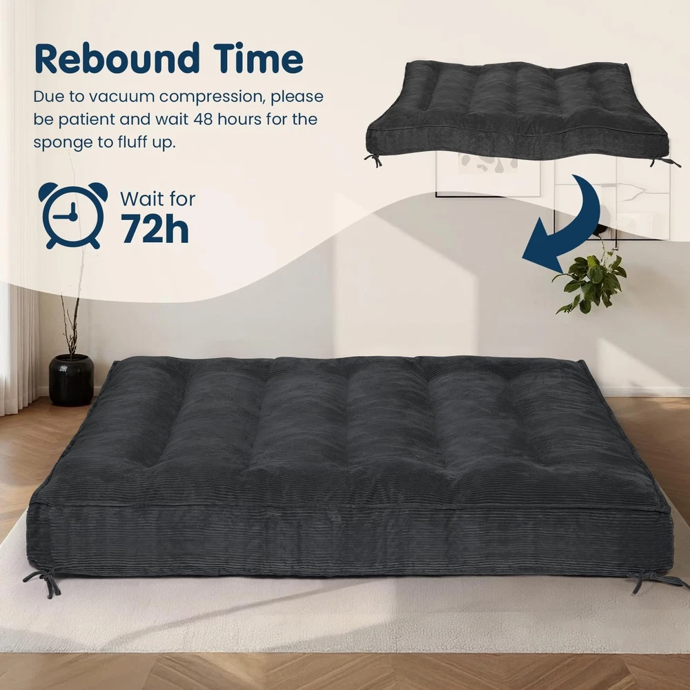 Note: Frame Not Included 🏗️ Secure Strap Design & Versatile Use: This 8-inch thick futon mattress features 4 reinforced corner straps for secure attachment to most bed frames, preventing slippage. Includes 2 additional storage straps for easy folding, storage, and transport. Functions as a mattress or effortlessly converts into a futon sofa bed or temporary guest bed, meeting diverse household needs 🌿 Year-Round Comfort & Skin-Friendly Material: Futon mattress full size crafted with premium soft corduroy fabric, it offers a cozy touch and excellent breathability for all seasons. The high-quality material ensures durability while delivering a warm, comfortable home experience, providing an ideal sleep and relaxation solution for bedrooms, living rooms, guest rooms, or apartments 💤 High-Support Filling: The futon couch internally filled with high-resilience foam chips, scientifically proportioned to perfectly balance support and softness. Effectively contours to body curves, relieves pressure points, ensures comfortable sleep, while maintaining shape and preventing sagging to extend lifespan of full size futon 🏠 Space-Optimized & Convenient: No complicated tools required—simply unfold and use. Compact when folded, our futon mattress stores easily in closets or corners, perfectly solving space constraints in smaller homes. An ideal choice for apartments, dorm rooms, guest rooms, children's spaces, or meditation areas, balancing comfort with space efficiency 🔒 Quality Assurance & Safety Design: Meticulous attention to detail ensures durability. Futon sofa bed with sturdy straps and reinforced stitching guarantee long-term reliability. All materials meet relevant safety standards, providing peace of mind for you and your family. Note: For hygiene, use a mattress cover and air regularly to maintain optimal condition