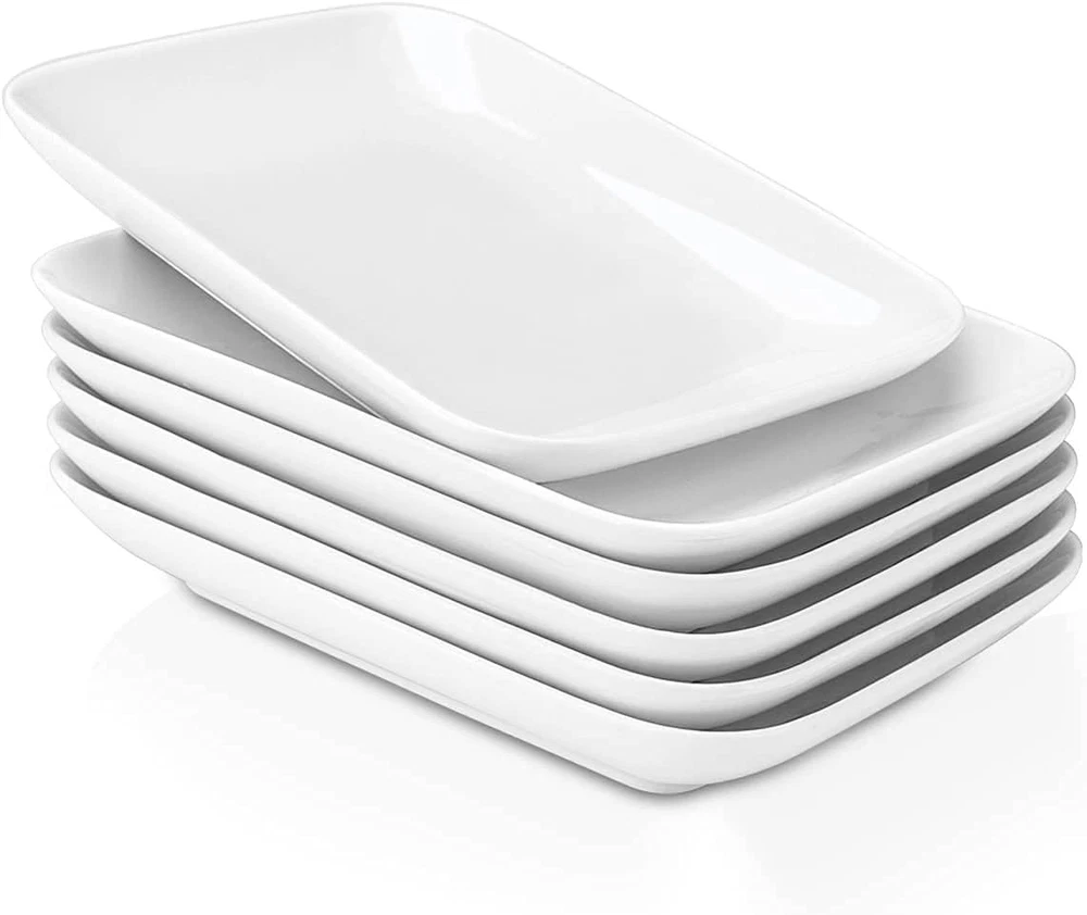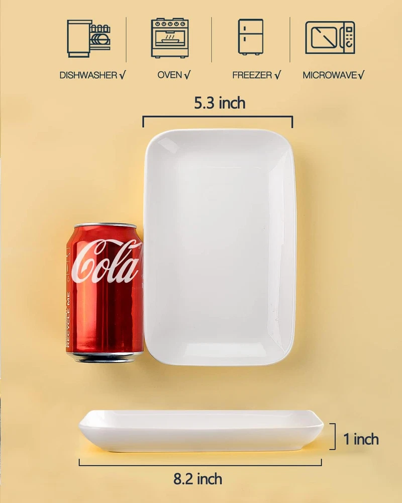 Lightweight and Sturdy: The Delling ultralight ceramic appetizer plates are crafted from high-quality ceramic that is both lightweight and sturdy. This means that these plates can withstand daily use without getting damaged easily, they are stackable, it 's easy to store and save your kitchen space. Elegant and Classic Design: These rectangular plates have classic and elegant design that complements any kitchen or dining room decor. The minimalist design allows your food to be the standout feature, making your guests' culinary experience even more special. Microwave and Dishwasher Safe: These plates are not only beautiful but also practical. They are microwave, dishwasher and oven safe, so cleaning up after your event is a breeze, This means you can easily clean them even if you have a busy schedule. Perfect for all Occasions: The versatile design of rectangular plates makes them suitable for all occasions. Whether you're hosting a family dinner, a party, or just a casual get-together, whether it be for a casual brunch, a formal dinner party, or a small gathering with friends, these plates are the perfect complement to your dishes. They are perfect for serving appetizers, desserts, salad, snack, sushi or even small meals. Ideal Gift: These ceramic plates come in a set of 6 and make an ideal gift for any occasion such as weddings, housewarming, birthdays, or as a special treat for yourself. Send something that your family or friends will actually use as a creative gift. Your friends and family will appreciate the stylish and practical design of these plates. Product Description Delling 8 Inch Serving Plates Set 1 For Fruit 2 For Dessert 3 For Salad 4 For Snack Small Portion Size: Dimensions: 8.2 x 5.3 x 1 inch Enjoy delicious food without worrying about consuming too much fat Stack Evently & Save Space The nested design makes for convenient and compact storage which saves space on your table and cabinet.While the wide bottom makes them stack steadily and not easy to dump. Simple & Beautiful Multi-functional Serving Plates Set How's the package? What if i receive the broken items? Don't worry! Our product breakage rate as low as 1%. If you do receive a broken item, tell us ASAP and we will provide fastest solutions until you are satisfied. These plates can be used safely in the dishwasher or microwave? Of course! they are safe for microwave, oven, dishwasher and freezer.