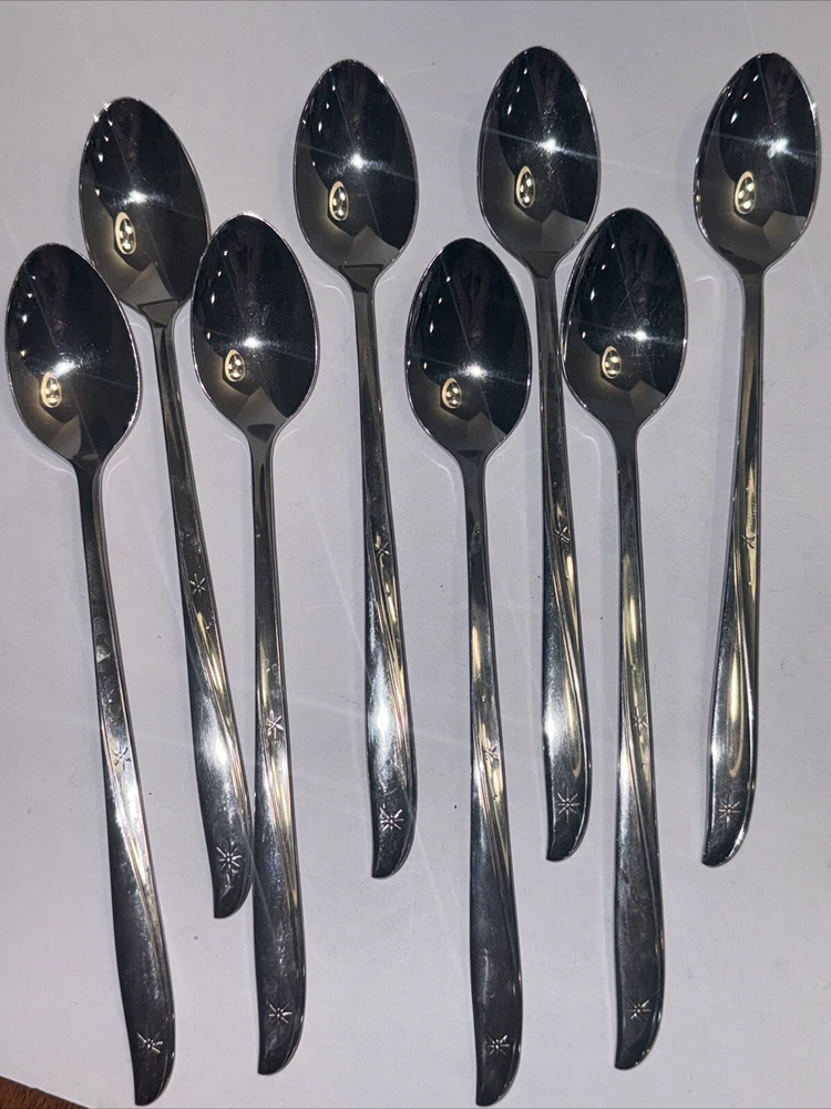 Add some sophistication to your tea time with this lot of 8 Oneida Community Atomic TWIN STAR Iced Tea Spoons which are 7 1/2" in length and come in a set of eight. Please feel free to contact me with any questions you have