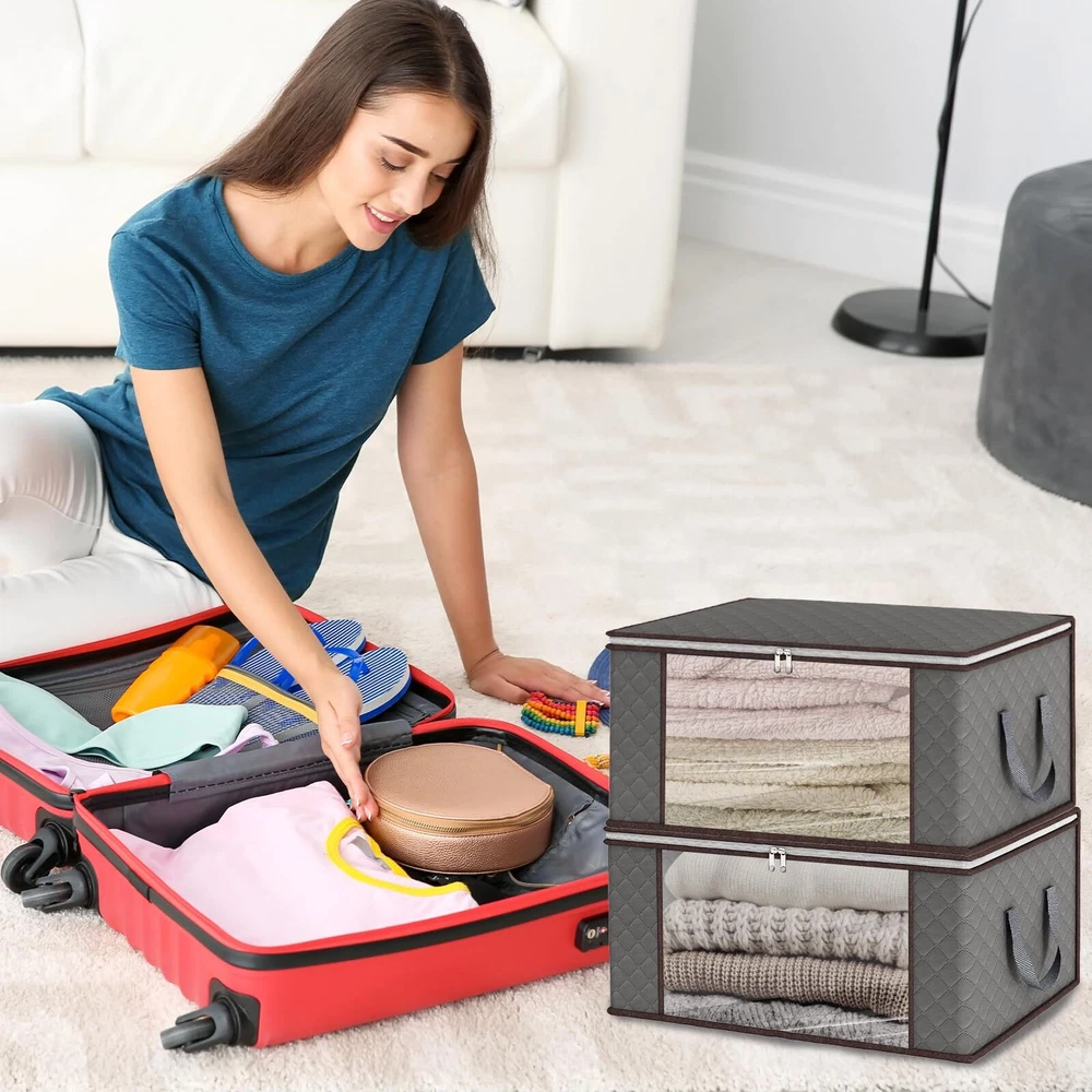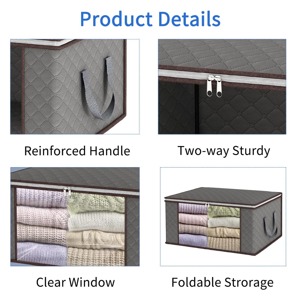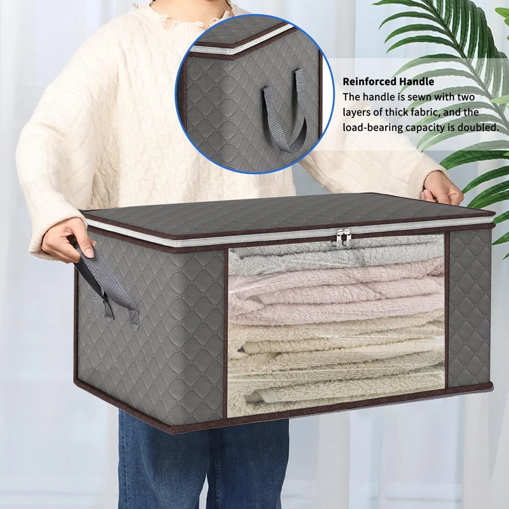 LARGE CAPACITY: Each clothe storage bag measures 23.6 x 15.7 x 13.8 inches / 60 x 40 x 35 cm. The kit contains 8 clothes storage containers with a total capacity of 90L. UPGRADE MAKINGS: Our foldable storage bags are made of 120g thick three-layer non-woven fabric in premium quality. STRENGTHEN DOUBLE HANDLE: Different from the others one layer handle, clothes storage bags sewed with three layers of thick fabric which can withstand loads about 13 lbs. VISIBLE WINDOW & TWO-WAY ZIPPERS: The visible clear window allows you to quickly view the contents of the storage bag. The high-quality two-way zipper is more sturdy and not easy to break, ensuring that your items are dust-free. VERSATILITY: Folding storage bag can be used in the closet or under the bed. Suitable for line, quilts, pillow, winter clothes and so on. In addition, the foldable design makes it easy to store when not in use.