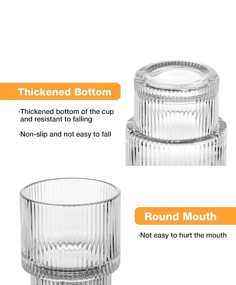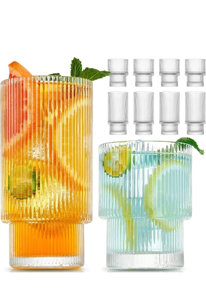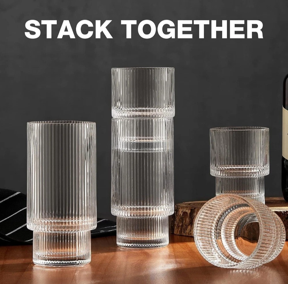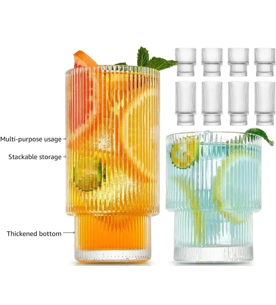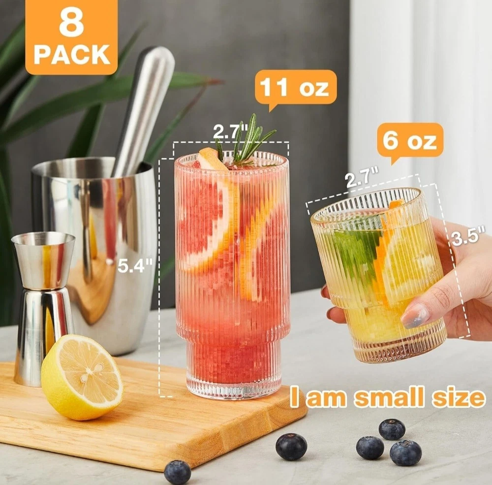 8 Pack Drinking Glasses, 4pcs Highball Glasses (11oz) & 4pcs Rocks Glasses (6oz), Vintage Glass Cups, Elegant Ribbed Glassware, Iced Coffee Glasses, Glass Tumbler for Cocktail, Whiskey, Juice TWO SIZE GLASSWARE SET The ribbed glassware set includes 4 highball glasse 11oz & 4 tumbler glasses 6oz, which is just what you’re looking for. TALL, Highballs – Our 11oz drinking glasses make it easy to stay hydrated or keep the party going even longer. SHORT, Tumbler Glasses – These 6 oz shorter cups can be used for whiskey, bourbon, scotch or even for small drink portions. QUALITY MATERIAL & DISHWASHER SAFE Glass cup is made of super quality glass, heat-resistant and durable, lead-free, and BPA-free. The drinking glasses have the ability to resist cracking and shattering. It can be cleaned in the dishwasher and easy to handwash. STACKABLE TO SAVE SPACE This unique origami style glass cup with a European retro flavor. Each cup can be stacked on the other, very convenient and easy to store. The perfect vessel for the perfect pour, whatever flows. It is ergonomically designed so that you will feel lightweight in hand and comfortable to hold. GLASSES MULTI-PURPOSE The glass tumbler can be used for many types of hot or cold beverages. It is widely loved by families, kitchens, breweries, cafes, bars, and restaurants. You can make it as an iced coffee cup, beer glasses, smoothie cup, whiskey glasses, margarita glass, tea cup, boba cup, fruit juice jar, or any other interesting holiday drinks glassware. BUY WITH CONFIDENCE This glass cups set is packaged in a heavy bubble holder and thick carton box to prevent damage during transportation. If you have any problem with your order, please feel free to contact our team, and we will gladly assist you. Payment ●Payment must be received within 3 business days of auction closing. ●Please Note: Import duties, taxes and chargers are not included in the item price or shipping charges. These charges are the buyer's responsibility. Shipping ●Items will be shipped within 3 days after the cleared payment. All items will be checked carefully and packages in good condition. ●We will ship to ebay's address only. Please make sure your address on ebay is the same with your shipping address before you pay. ●Shipping and Handling will be determined based upon the ship to address ●If you didn't receive your package, this time schedule, please do not hesitate to contact us. Within 24 hours we will try to update you with the latest tracking details of the shipment. Return and Feedback ●We sincerely hope that you can leave us a positive feedback. If, for any reason you are not satisfied with your purchase, please contact us through "Ask Seller Questions" before leaving neutral or negative feedback ●If you are not satisfied about your received item, please return it within 30 days for a refund. ●We will accept any return and give a full refund (without shipping cost) on any item. The item must be returned to us in original condition and the buyer need to pay return shipping cost
