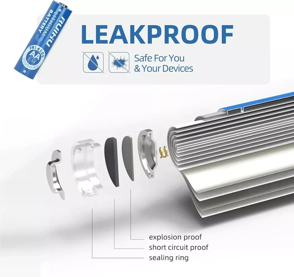 8 Pack Extended Long-Lasting Lithium Batteries for Blink Camera - 1.5V 3000mAh šćWarning & Caution!ćDo Not Recharge! This is a Non-rechargeable battery. šćWork with Blink CameraćThe Original batteries provided in Blink camera package are Energizer Lithium AA batteries(model: L91). Our RUIHU AA lithium batteries is same as Energizer AA lithium batteries, and they both are Li-FeS2 batteries. šćBasic Paramatersć8-Pack RUIHU AA Safe Lithium Battery 1.5V 3000mAh; 20 years shelf life with very very low self-discharge rate(<2% per year); Standard AA size with wide application. šćLong-Lasting & DurablećRUIHU AA Lithium Battery has high performance and constant output, using high-density materials to accumulate amazing energy. šćWide ApplicationćApplied for various devices, such as Clock, Camera flash, Remote controllers, Mouse, Keyboard, Radio, Baby toys, Toy car, Digital cameras, Smart door lock, Electronic toothbrush, Wireless microphone, LED flashlight, Emergency lamp, Cassette recorder, VR controller, Game controller... šćGood CompatibilityćCan replace various AA batteries, such as Alkaline batteries, Carbon batteries, NI-Mh batteries, NI-Cd batteries. Compatible with L91, FR6, LR6, R6, E91, AM3, LFB-AA, FR14505...Perfect for both high and low drain devices. šćNo LeakagećTriple safety valve, new spiral winding structure, the electrolyte is fully adsorbed to prevent leakage;Ruihu AA batteries escorts your high-end electronic equipment. šćAdapt to extreme temperaturesćWorks perfectly in extreme environments from -40ā to 140ā. Its cold resistance surpasses alkaline batteries and Ni-MH batteries, and is suitable for both outdoor and indoor use. šćSuper Innovative BatteyćRUIHU AA lithium batteries adopts new technology and unique Li-FeS2 material to keep the battery super long-lasting. The batteries show no memory effects and keep 1.5v constant discharge in 3000mah lithium cell. Item Specification Item model number AA Unit Count 8.0 Count Battery Cell Composition Lithium Product Dimensions 0.57 x 0.57 x 1.99 inches Country of Origin China Item Weight 4.7 ounces Batteries 8 Lithium Metal batteries required. (included) Recommended Uses For Product Indoor/Outdoor Number of Batteries 8 Lithium Metal batteries required. (included) Size Lithium AA-8 Count/Box
