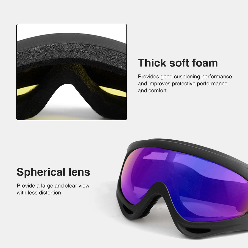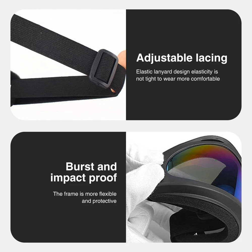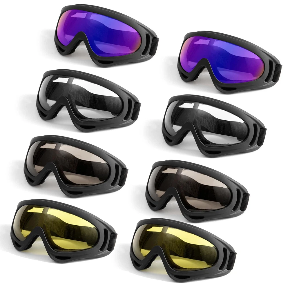 Description Multipurpose windproof goggle set Package includes: 2*colorful lens ski goggles 2*clear lens ski goggles 2*brown lens ski goggles 2*yellow lens ski goggles Application Scenario ·ski ·motorcycle ·biking ·climbing ·hiking If you have any questions about our products, please us by , and we will reply you in time. [Multi-color lenses] Our ski goggles set includes 4 different colors of lenses(colorful, clear, brown, yellow). In the 8-piece set, there are 2 goggles of each color lens to meet different needs [Excellent protective performance]This ski goggle adopts a unique design and provides excellent protection while ensuring comfort, allowing you to do whatever you want in various sports [Various usage scenarios] This windproof goggle can be used in a variety of sports scenarios. Such as off-road motorcycles, skiing, cycling, mountain climbing, hiking, etc., and provide multi-color lenses for you to choose from [Adjustable size] Our ski goggles have an adjustable strap design, you can freely adjust the strap tightness to suit everyone, whether it is a kid, teenager, or adult, you can easily wear our product [Reliable after-sales service] We are committed to providing services that satisfy our customers. If you have any questions after receiving the product or during use, please us in time, and we will provide you with satisfactory after-sales service and solve your issues