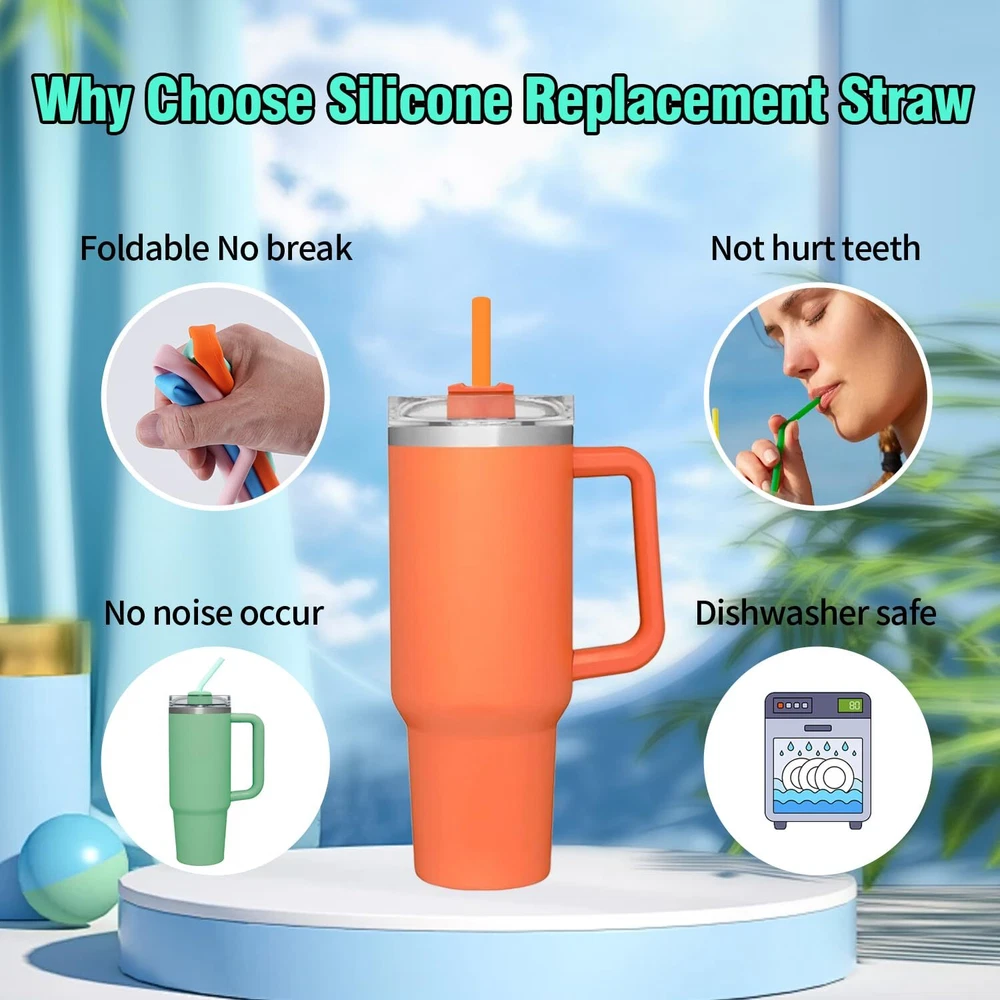 【Perfectly Compatible】:The stanley straws size is 12.2" length x 0.39" wide , 8 counts long colorful straws plus 2 cleaning brush. Compatible with stanley 40 oz 30 oz straw. Perfect for stanley accessories. 【Advantages of Silicone Material】:Food grade silicone is BPA free,non-toxic, odorless,eco-friendly,Non-teeth chipping,reusable and long-lasting.Safe use for driving. More friendly for people who like to chew straws .Easy to cut to the length you want. 【Easy to Clean】:The stanley cup straw come with 2 counts 12.2 inches extra long cleaning brush, you can wash the replacement straws for stanley 40 oz tumbler by hand with water,very easy to wash and keep clean.Dishwasher Safe. 【Package Includes】:8 counts silicone stanley replacement straw(4 straight and 4 curved straws) Suitable for various occasions.and 2 counts cleaning brush to keep them clean. 【Suitable For Gifting】:Perfect gift for your family and friends who likes to use the Simple Modern or Stanley Cup, they will like it very much.