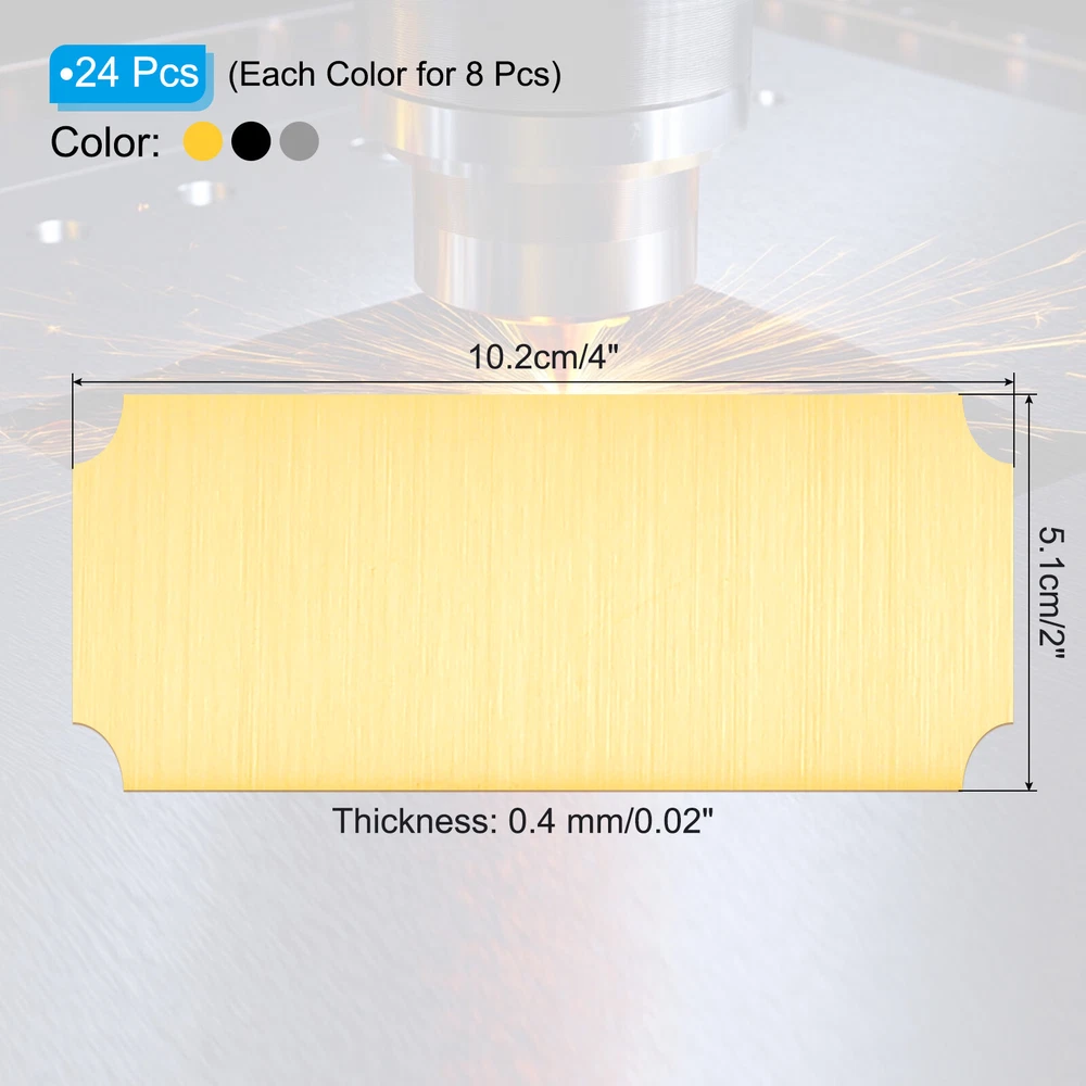 Document Our engraved nameplates are perfect for mounting on plaques, picture frames, sweaters, trophies, bags, display boxes, flag cases, and anything else.SpecificationMaterial: Stainless SteelColor: Silver/Gold/BlackSize: 10.2 x 5.1 cm/4 x 2 Inch(L*W)Thickness: 0.4 mm/0.02 InchPacking List: 8 Pcs x Engraved NameplateAdvantageOur engraved nameplates are made of brushed stainless steel which is durable, stable, not easy to fade, rust, or break, and can be used for a long time. With a smooth surface, it will not scratch your skin.The right thickness makes the plate stronger and allows for deeper engraving. These elegant nameplates have a beautiful luster and a simple design. Suitable for various crafts to add brilliance.The protective film design can effectively prevent scratches. The adhesive backing design allows you to stick this nameplate anywhere without any tools and it can be firmly on the objects.InstructionPlace a metal workbench block underneath the blank stamping tags for better stamping.NOTE:1. There may be light scratches and blemishes due to shipping, but they can be polished.2. Only for laser engraving, not suitable for mechanical engraving.3. Please remove the protective film before use. 8 Pcs 4" x 2" Engraved Name Plate Picture Frame Label Art Tag, Silver/Gold/Black Our engraved nameplates are perfect for mounting on plaques, picture frames, sweaters, trophies, bags, display boxes, flag cases, and anything else. Specification Material: Stainless Steel Color: Silver/Gold/Black Size: 10.2 x 5.1 cm/4 x 2 Inch(L*W) Thickness: 0.4 mm/0.02 Inch Packing List: 8 Pcs x Engraved Nameplate Advantage Our engraved nameplates are made of brushed stainless steel which is durable, stable, not easy to fade, rust, or break, and can be used for a long time. With a smooth surface, it will not scratch your skin. The right thickness makes the plate stronger and allows for deeper engraving. These elegant nameplates have a beautiful luster and a simple design. Suitable for various crafts to add brilliance. The protective film design can effectively prevent scratches. The adhesive backing design allows you to stick this nameplate anywhere without any tools and it can be firmly on the objects. Instruction Place a metal workbench block underneath the blank stamping tags for better stamping. NOTE: 1. There may be light scratches and blemishes due to shipping, but they can be polished. 2. Only for laser engraving, not suitable for mechanical engraving. 3. Please remove the protective film before use. Hot Item Payment 1.We accept eBay payment . 2.Payment must be received within 7 business days of auction closing. Shipping 1.We ship to your eBay or Paypal address. Please make sure your eBay and Paypal address is correct before you pay. 2.Items will be shipped within 1-3 business day when we received payment. 3.Delivery time depends on destination and other factors. Description Policy 8 Pcs 4" x 2" Engraved Name Plate Picture Frame Label Art Tag, Silver/Gold/Black Our engraved nameplates are perfect for mounting on plaques, picture frames, sweaters, trophies, bags, display boxes, flag cases, and anything else. Specification Material: Stainless Steel Color: Silver/Gold/Black Size: 10.2 x 5.1 cm/4 x 2 Inch(L*W) Thickness: 0.4 mm/0.02 Inch Packing List: 8 Pcs x Engraved Nameplate Advantage Our engraved nameplates are made of brushed stainless steel which is durable, stable, not easy to fade, rust, or break, and can be used for a long time. With a smooth surface, it will not scratch your skin. The right thickness makes the plate stronger and allows for deeper engraving. These elegant nameplates have a beautiful luster and a simple design. Suitable for various crafts to add brilliance. The protective film design can effectively prevent scratches. The adhesive backing design allows you to stick this nameplate anywhere without any tools and it can be firmly on the objects. Instruction Place a metal workbench block underneath the blank stamping tags for better stamping. NOTE: 1. There may be light scratches and blemishes due to shipping, but they can be polished. 2. Only for laser engraving, not suitable for mechanical engraving. 3. Please remove the protective film before use. Hot Item Payment 1.We accept eBay payment . 2.Payment must be received within 7 business days of auction closing. Shipping 1.We ship to your eBay or Paypal address. Please make sure your eBay and Paypal address is correct before you pay. 2.Items will be shipped within 1-3 business day when we received payment. 3.Delivery time depends on destination and other factors.