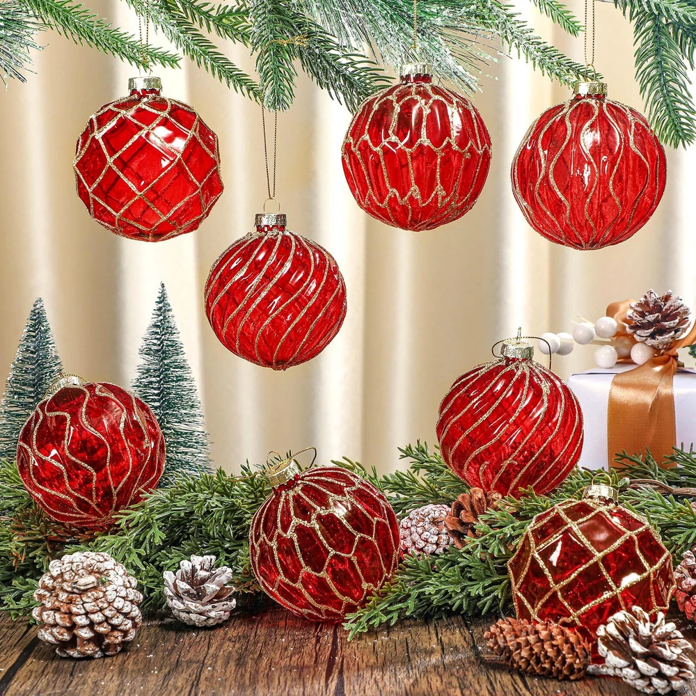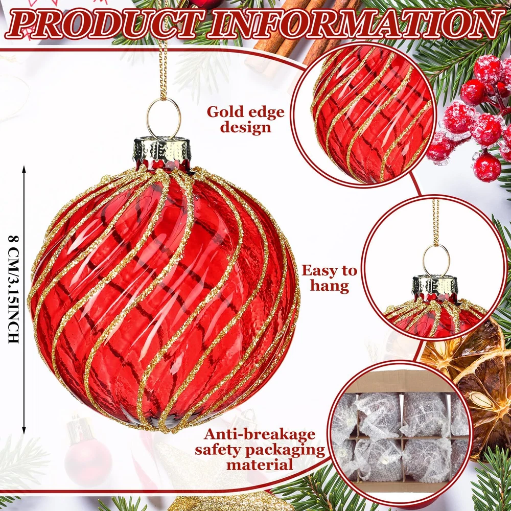 Features: Our glass Xmas ornaments can be applied in a wide range of events, you can hang them on Christmas tree, staircase, mantel, fireplace or other places, enhancing the festive ambiance in most spaces. These Christmas hanging balls can be a delicate present for your loved ones, family members and more, spreading the holiday cheer. Specifications: Material: glass Main color: red, gold Size: about 3.15 inches/ 8 cm Package includes: 8 x Glass Christmas ball ornaments Notes: Manual measurement, please allow slight errors on size. The color may exist a slight difference due to different screen displays. Package Contents: coming 8 glittery Christmas tree balls, mainly in red and gold colors, eye catching and beautiful, providing you with ample decorations to tastefully adorn your festive spaces, the bright colors and sufficient quantities to meet your Christmas tree decoration needs Glass Material: made from exquisite glass, these Christmas ball ornaments reflect light beautifully, enhancing the elegant appeal of your holiday decorations, and providing a warm and classic color palette suitable for the festive setting Vintage and Glitter Style: these glittery Xmas ornaments come in 4 distinctive styles, red transparent glass with gold trim, stylish and attractive, can help decorate your Christmas tree, adding variety and charm to your holiday decorations Ideal Size for Versatility: each Christmas tree decorations set is approximately 3.15 inches/ 8 cm, making it a suitable size to be charming, yet not overpowering; Use it to adorn trees, wreaths, garlands or other Christmas display, proper and rustic Versatile Decorations: this glittery Christmas ornament set is proper for various occasions, such as Christmas, anniversaries, weddings, parties, birthdays, housewarming, etc., can match with Christmas theme, provide attractive display and ornament