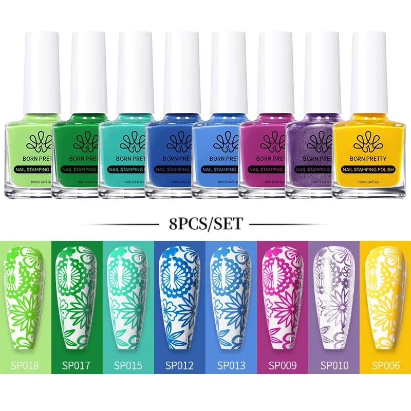 Type: Stamping Nail Polish Color: 8 Colors for Choose Quantity: : 8 Bottles Volume: Approx. 10ml Using Tools: Dry by natural, matched with Stamper&Scraper and Stamping Plates(not including) Package Contents: 8 Bottles 10ml BORN PRETTY Stamping Nail Polish Why Choose Our Nail Polish? Made of high quality material, the nail polish is of high pureness , making your nail with bright colors. Easy to apply, quick-drying. Special nail polish for nail art stamping and printing colors. Simple to use: Shake or stir very well before use. Comes with brush making nail art fast and easy for everyone. Allow you to create beautiful nail designs in short time. How To Use Our Nail Polish? Step 1: Apply the base gel and color polish on your nails. Step 2: Apply the nail latex. Step 3: Apply stamping polish on stamping plates. Step 4: Use scraper to scrape the excessive stamping polish. Step 5: Press the stamper quickly to pick up the pattern. Step 6: The pattern is completed and transfer on nail surface. Step 7: Peel off the nail latex and apply the top coat to finish the nail design.