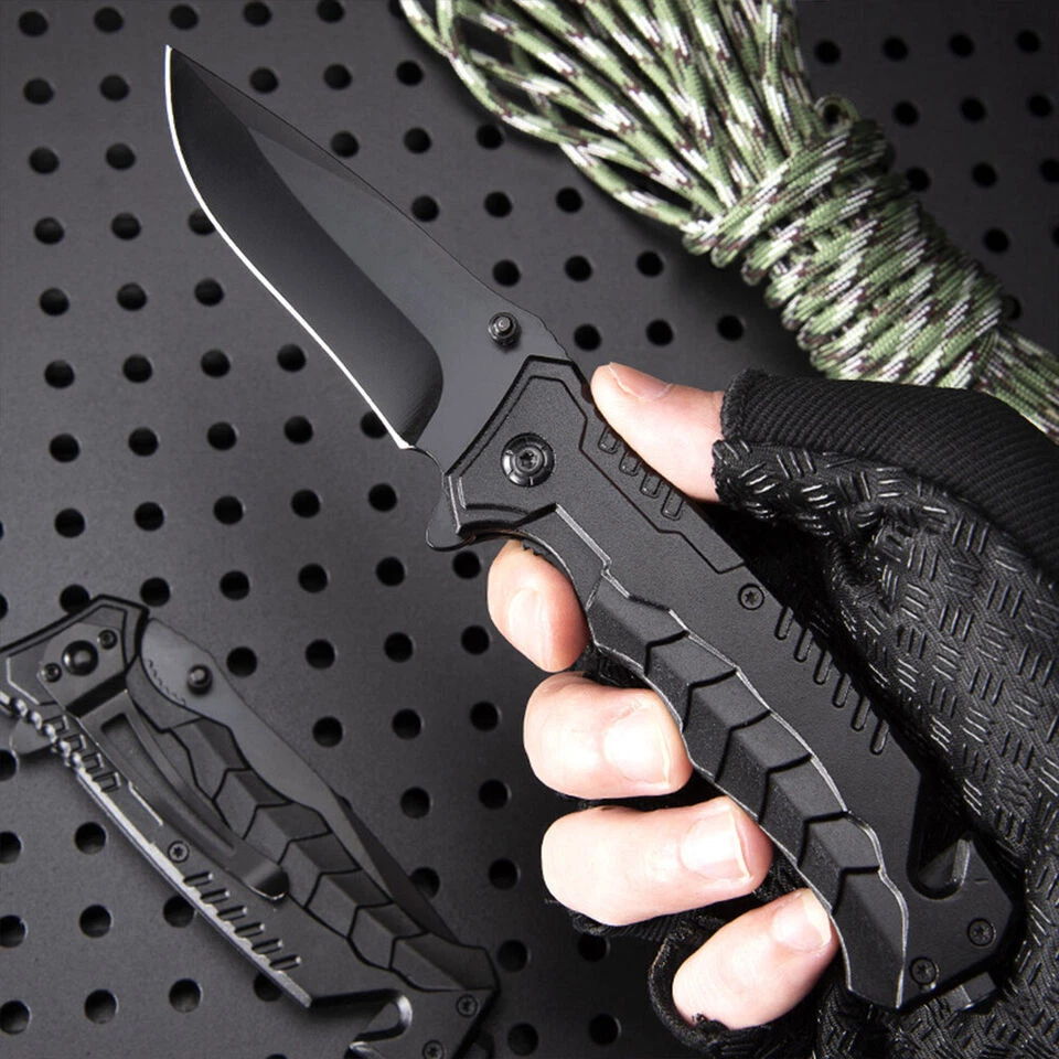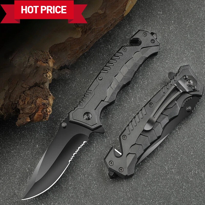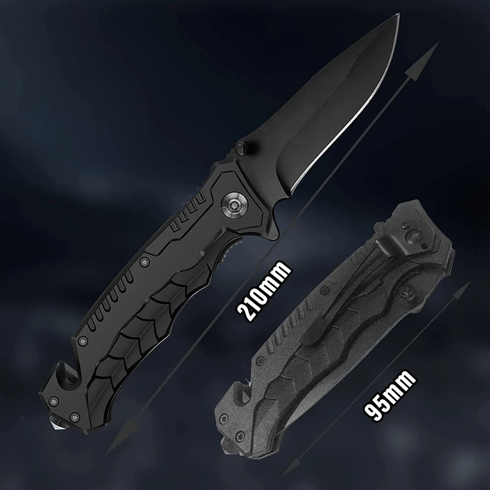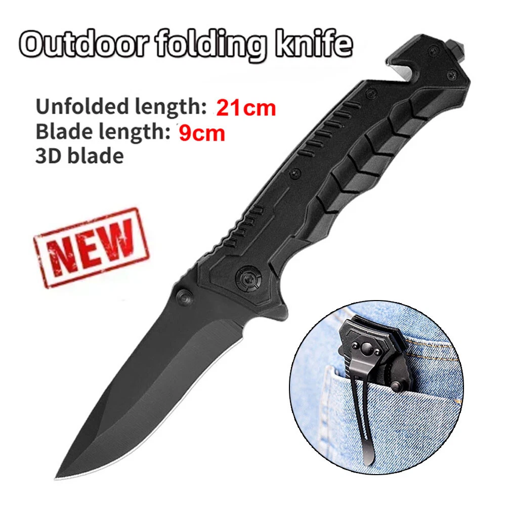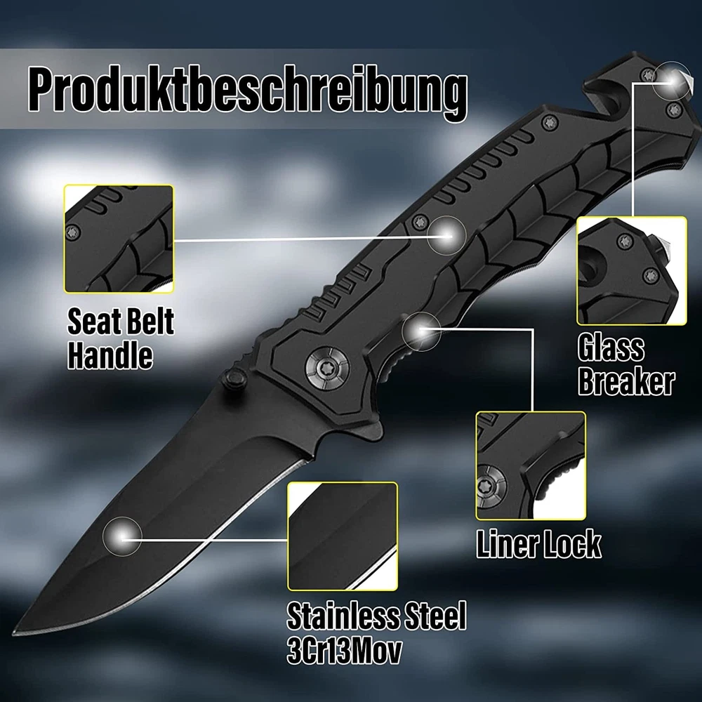 Knife type: folding knife You buy here a very high quality outdoor folding knife of the brand The extremely sharp blade, is made of stainless steel and can be opened comfortably with one hand, by means of flip function. The knife meets all the criteria you would expect from a Survival pocket knife! In addition to an extremely high overall stability of the knife, it additionally has a belt cutter and a glass breaker. In addition, you can easily carry your faithful companion with you with the existing belt clip and have your tools at hand at any time. Whether you are carving, cutting, guttering, refining or crushing, the robust, ergonomically shaped handle made of aluminium is perfect for you and carbon perfect in the hand. Features: robust and wear-resistant, sharp and durable, easy to carry, suitable for hand shape, carefully selected materials, mini and compact, foldable Specificaiton: Blade length: 9cm Blade angle: 50 ° Length of knife handle: 110mm Application: Outdoor, Self-defense Material: aluminium alloy+stainless steel 3cr13 Applicable audience: It is not recommended for minors to buy and use, and during use supervision by adults is required. P ackage included: 1 x Knife