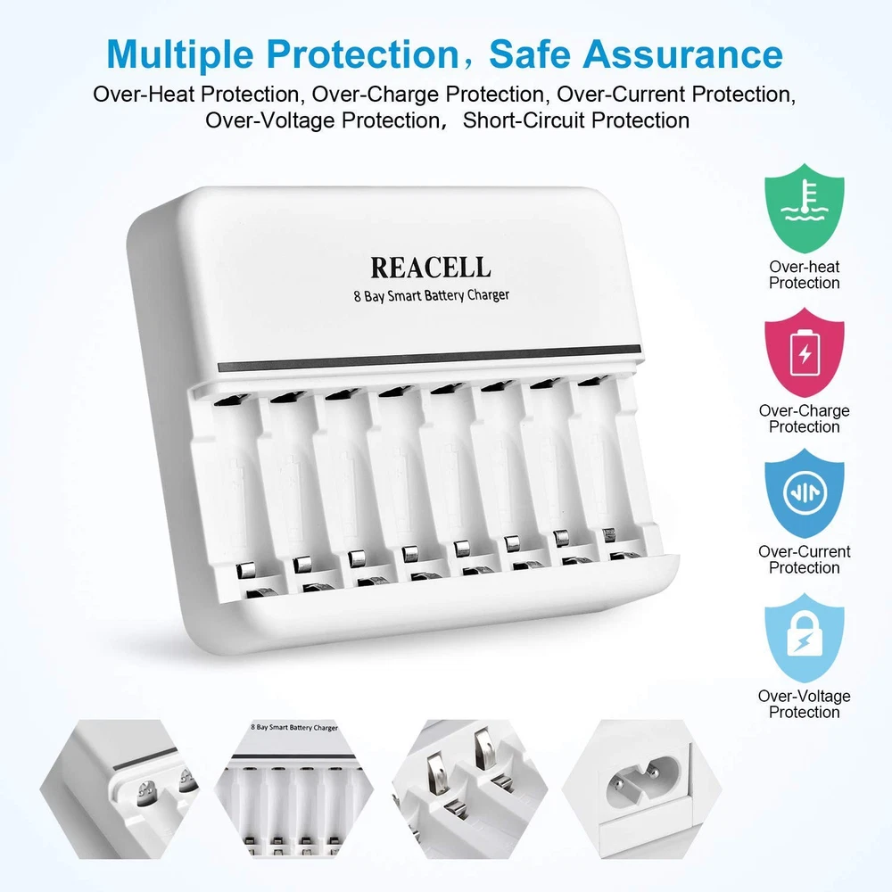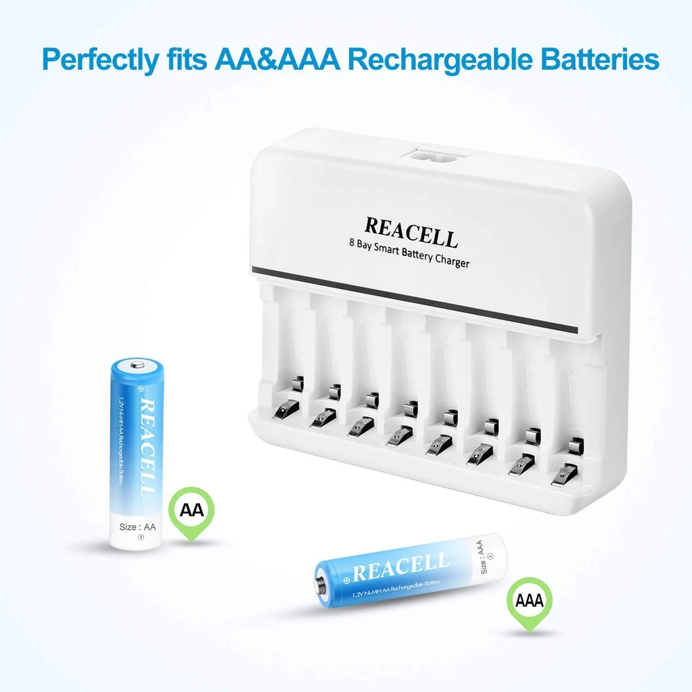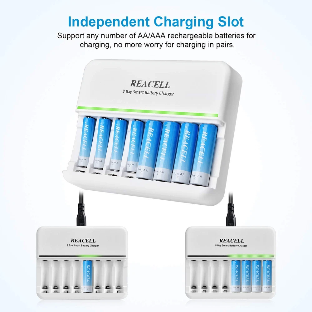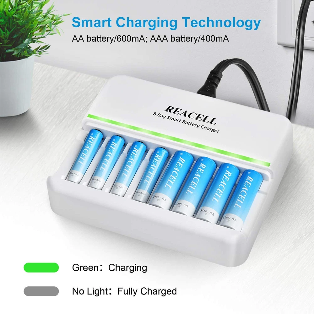 Excellent Mixed Charging Feature - You can freely charge 1-8pcs of AA or AAA Ni-MH/Ni-CD rechargeable batteries without pairs Fast and Stable Charging - AC input, 600±50mA charging current for NICD/ NIMH AA rechargeable batteries, 400±50mA current for AAA rechargeable batteries, 2 Hours get your AAA batteries fully charged Smart Charger - 8 bays charger’s smart LED indicator, green light: charging; light off: fully charged, easy to know the status and can auto stop charging when the battery is fully charged Intelligent MCU Control - Using -∆V intellectual cut-off charging method, automatically turn to trickle charge to prevent the batteries from over-voltage, over-current or over-heat, extend battery life and charge up to 100% Secure and Reliable - Auto-detect & indicate of non-rechargeable battery and defective battery, protects against overcharge, over discharge and short-circuiting