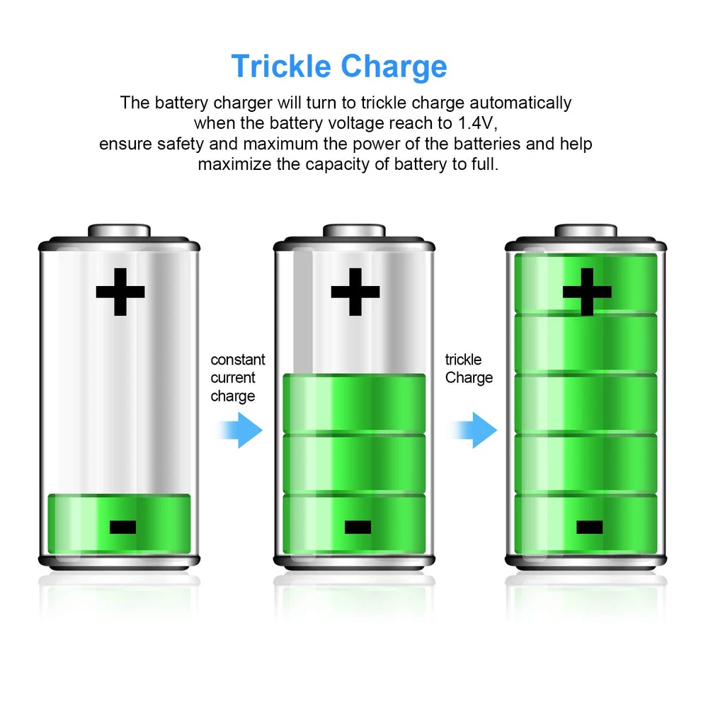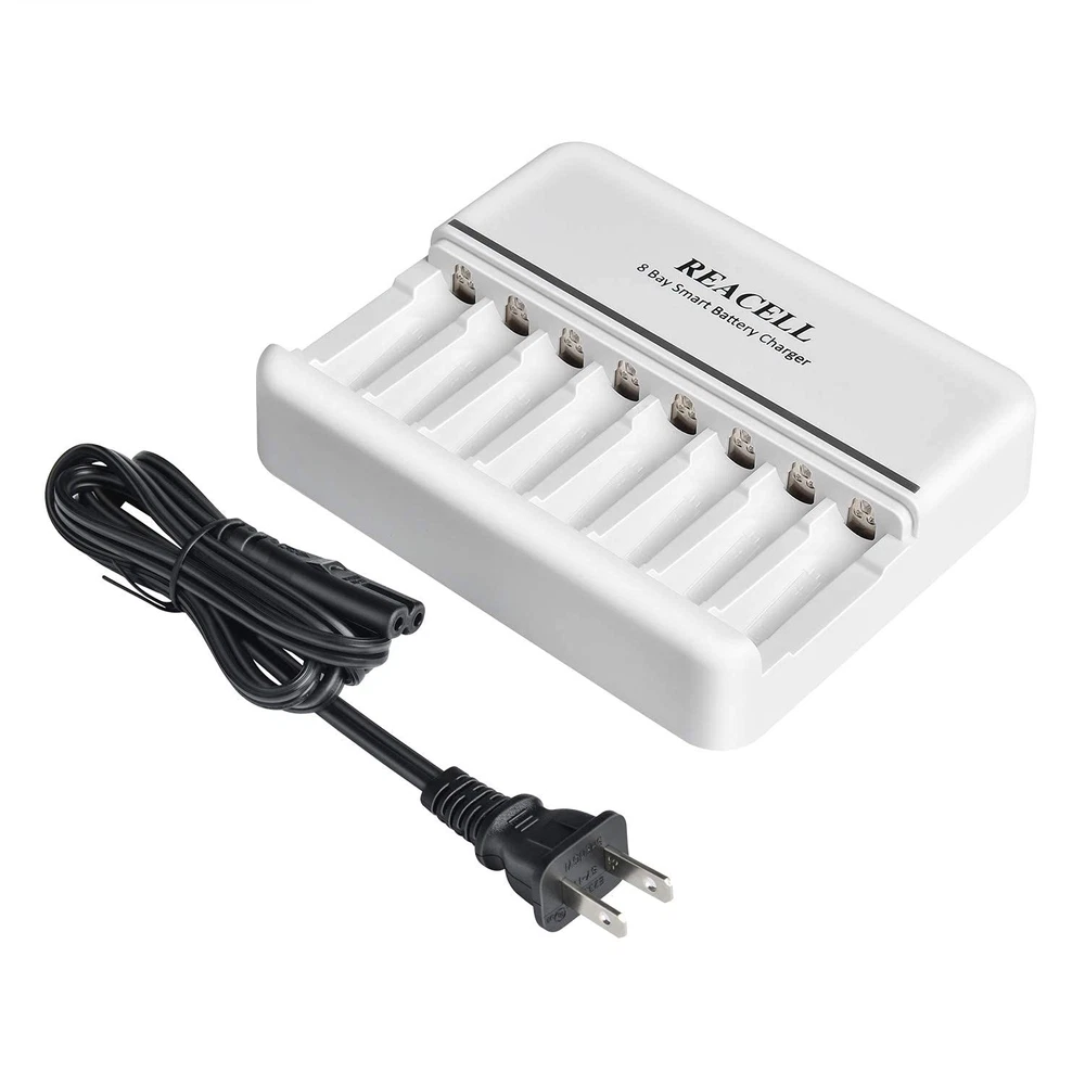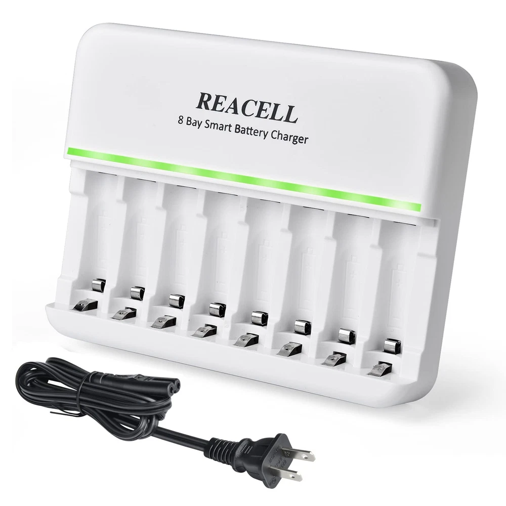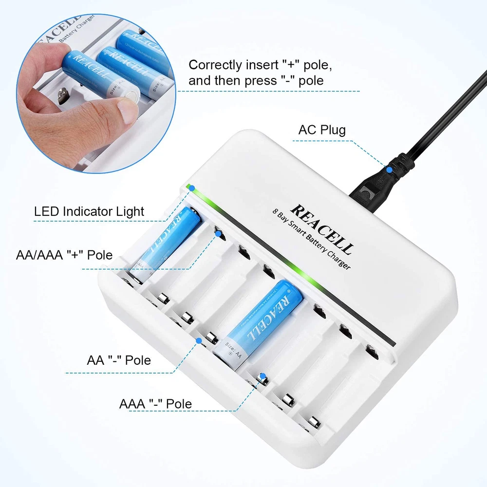 Excellent Mixed Charging Feature - You can freely charge 1-8pcs of AA or AAA Ni-MH/Ni-CD rechargeable batteries without pairs Fast and Stable Charging - AC input, 600±50mA charging current for NICD/ NIMH AA rechargeable batteries, 400±50mA current for AAA rechargeable batteries, 2 Hours get your AAA batteries fully charged Smart Charger - 8 bays charger’s smart LED indicator, green light: charging; light off: fully charged, easy to know the status and can auto stop charging when the battery is fully charged Intelligent MCU Control - Using -∆V intellectual cut-off charging method, automatically turn to trickle charge to prevent the batteries from over-voltage, over-current or over-heat, extend battery life and charge up to 100% Secure and Reliable - Auto-detect & indicate of non-rechargeable battery and defective battery, protects against overcharge, over discharge and short-circuiting