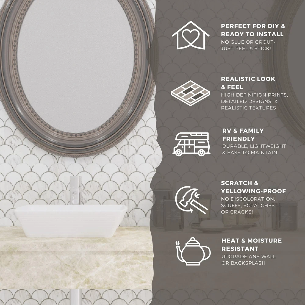 PEEL AND STICK BACKSPLASH ’s premium-grade kitchen backsplash tiles are a notch up from other adhesive wall tiles available on the market. Enjoy beautiful designs, 3X adhesive strength, 4mm thickness, heat and moisture resistance and a 3D realistic tile effect. PEEL AND STICK BACKSPLASH ’s premium-grade kitchen backsplash tiles are a notch up from other adhesive wall tiles available on the market. Enjoy beautiful designs, 3X adhesive strength, 4mm thickness, heat and moisture resistance and a realistic tile effect. EASY TO INSTALL Our stick on tiles make for an effortless DIY install that requires minimal preparation and expertise. With a few simple tools, your kitchen, bathrooms, or living space can be transformed into a designer room! No grout, no mess, no hassle. STONE COLLECTION Sharp and sleek, stone composite peel and stick tiles feature a high-end, marble/wood look surface and a sturdy, composite core. Your budget-friendly home improvement solution! Tiles measure 9.25” x 11.88”, 4 mm thick, and cover 0.76 square foot each. Box contains 8 tiles, total coverage of 6.11 square feet. QUALITY GUARANTEED ’s peel and stick tiles are simple to cut, easy to clean, and heat and humidity resistant. (Not intended for use in showers.) Upgrade your kitchen backsplash instantly with fast DIY installation and enjoy long-lasting durability. Born to take the hassle out of DIY renovations, tiles are easy to cut and install and are made to look like real, beautiful tiles. With a wide variety of shapes, textures, and colors, caters to all tastes and styles.