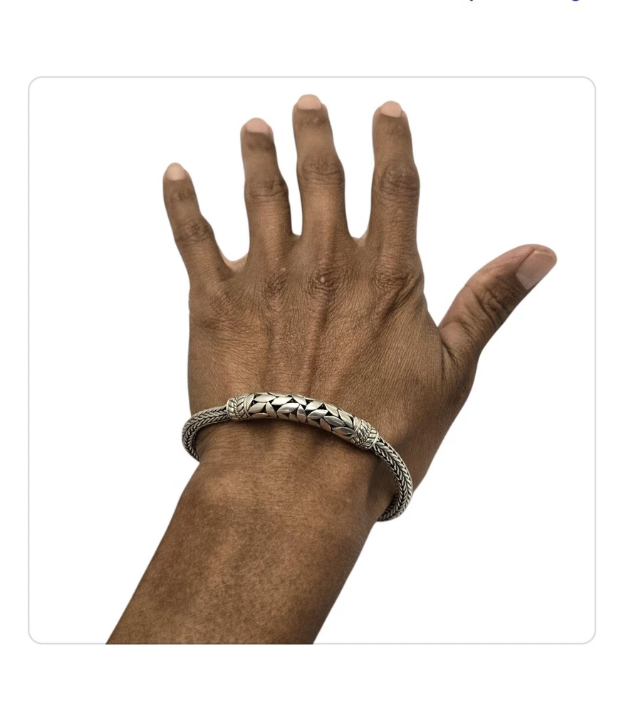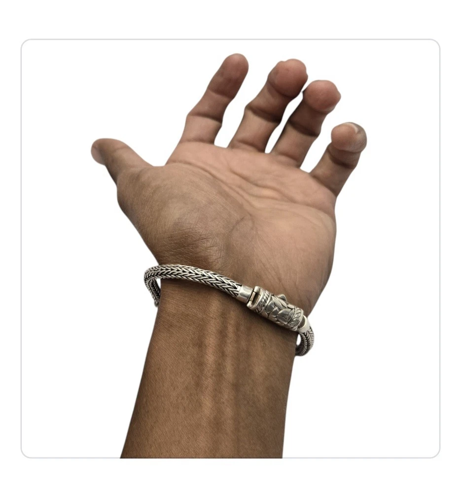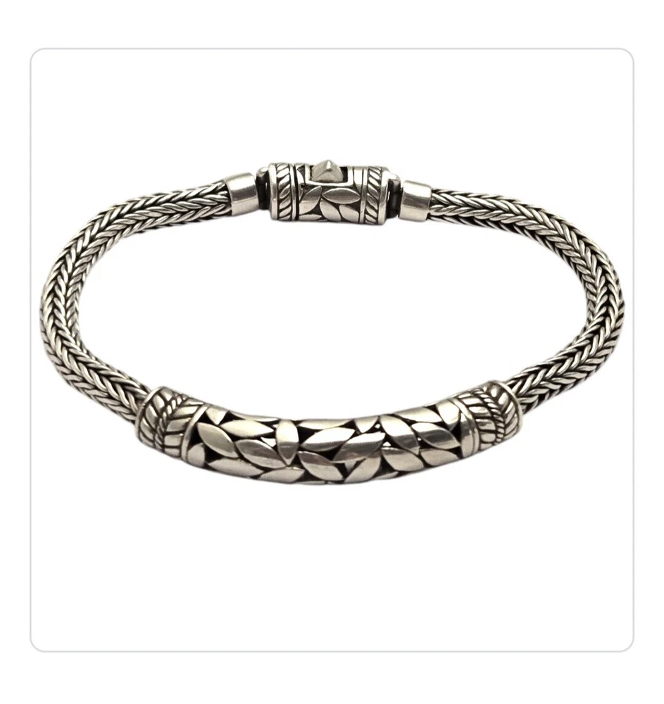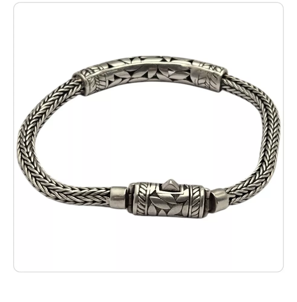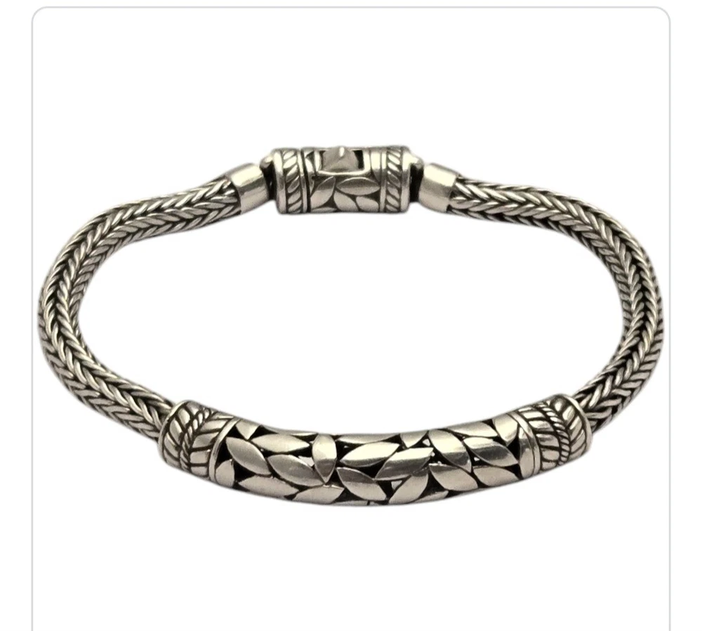 Vintage Modernist Balinese Sterling Silver 5mm Wheat Chain Bracelet - 8"⅛ | Cut Leaf Centerpiece wheat chain bracelet that has a centerpiece depicting a bunch of cut leaves - and yes, there is openwork between the leaves. Thickness at the chain is 5mm (1/4"); at the center 7.5mm (or 5/16"). Weight is 30.5 grams. Condition is wonderful with a push button tab closure; good strong hold. Absolutely lovely with a designer look! The Rich Tapestry of Balinese Jewelry HistoryYou might have marveled at the intricate designs and fine detailing that Balinese jewelry pieces carry. These design details are not mere ornaments, they are a testament to the mastery of Indonesian artisans who have passed down century-old techniques through generations. Specialties like fine filigree work, granulation, and jawan are trademark elements in these pieces The artisans perform these operations faithfully according to age-old practices handed down over generations. These details transform each piece into a miniature artwork, resonating with the highly recognised quality and uniqueness of Balinese art. As you wear Balinese jewelry, you're not just donning beautiful accessories; you're carrying a piece of history and cultural identity with you. Both gold and silver pieces resonate with age-old traditions and a deep appreciation for abundance in nature. Balinese people see these precious metals as gifts from the earth's heart, infusing spiritual significance into each exquisite creation