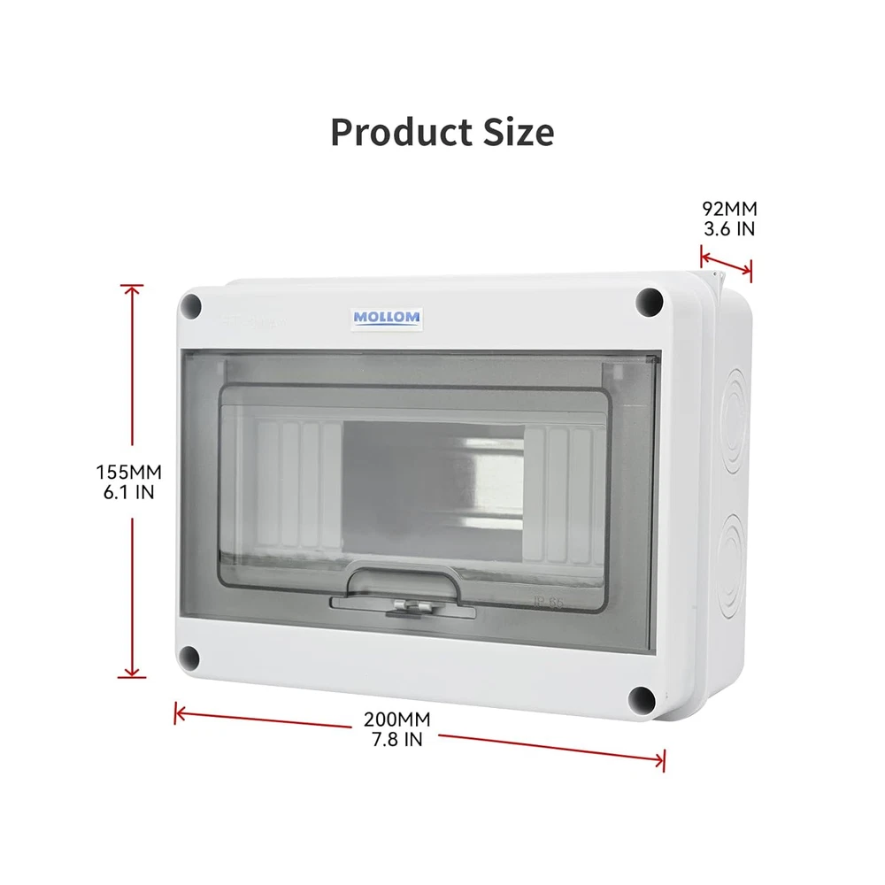 【Robust and durable】Made of high quality PC+ABS alloy material. Size: 200x92x155 MM | 7.8x.3.6x6.1 IN (L*W*H) 【Waterproof IP65】Protects against most harmful dust and prevents rain from entering, effectively protecting the circuit breaker.Impact resistance up to IK08 【Easy Installation】The circuit breaker box can be easily installed and very convenient to use, just need a few steps to mount it on your wall 【Wide range of uses】Suitable for outdoor installation, such as connecting solar energy, car charging posts, etc. Also suitable for indoor, such as home, workshop, hotel, shopping mall, charging station, etc 【Packing】1PCS x 8Way Power Distribution Protection Box; 4PCS x Stainless Steel Screws; 2PCS x Waterproof Connectors Product Description waterproof:IP66. Impact resistance up to IK08. Fireproof, waterproof, dustproof, impact resistant, corrosion resistant. PC+ABS alloys are produced with a life expectancy 3 to 5 times higher than other ABS materials. Innovative design The security lock hole is reserved for customers to buy with lock models or with their own security locks. It is safer and more secretive for outdoor use and more secure for indoor use to prevent children from accidentally touching it. Add 4 seals Waterproof gaskets are added to the 4 screw blanks, and with a waterproof rating of up to IP66, they can withstand strong wave impact or strong water spray, and completely prevent dust from entering. Greatly improve the safety of the circuit breaker. Made of sturdy materials The transparent cover of the meter box is made of PC material, the box is made of PC + ABS alloy material, the strength of the box up to IK08, even in outdoor use do not have to worry about external impact resulting in damage. A small locks for big security While collecting feedback from our customers, we found that they were in great need of a lock to protect his meter box from the serious consequences of accidental touching outdoors, or from children indoors. This is a very important safety design. Add to Cart Add to Cart Add to Cart Add to Cart Add to Cart Add to Cart Customer Reviews 4.5 out of 5 stars 353 4.5 out of 5 stars 353 4.5 out of 5 stars 353 4.5 out of 5 stars 353 4.5 out of 5 stars 353 4.5 out of 5 stars 353 Price $13.99 $ 13 . 99 $17.99 $ 17 . 99 $18.99 $ 18 . 99 $20.99 $ 20 . 99 $24.99 $ 24 . 99 $32.99 $ 32 . 99 Waterproof IP65 IP65 IP66 IP66 IP66 IP66 Padlock available X X ✓ ✓ ✓ ✓ Qualification CE Rohs CE Rohs CE Rohs CE Rohs CE Rohs CE Rohs