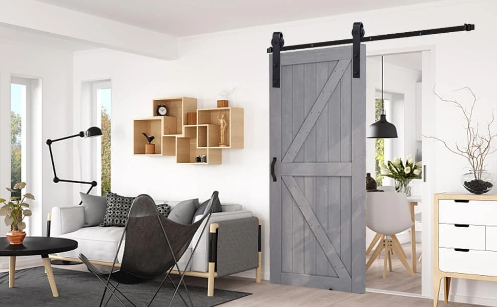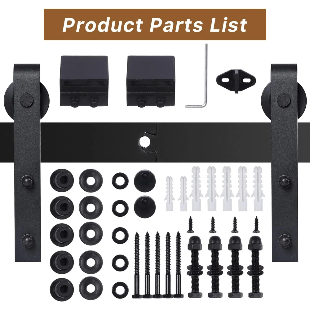 Pre-purchase Information 1.Door is not included, only the hardware kit is for sale. 2.You will need 5" clearance from the top of your door to the ceiling for this kit to fit correctly. 3.Fit for door panel thickness: 13/8" to 13/4". 4.This hardware kit can hold door weight 330lbs. 【Simple and easy to install】 Very detailed and visual instruction. Our instruction explains every step with words and picture and all data is measured in inch. It is very easy for you to take a reference during the installation. 【Package included】A Barn Door Hardware Kit (Rail*1, Rail Spacers*5 , Installation screw*5 , Roller*2, Anti jumpers*2, Door Stopper*2 , Floor Guide*1 , Installation tools+1; all other necessary hardware is included as you see in the pictures. ) *Door Not Included. 【Durable & Sturdy】 High strength industrial tracks and pulleys can easily hold 330 lbs loads. 【Wide Applicability】 Expansion screws are used for walls, ordinary screws are used for wood walls and cabinets, etc. Rustic style suitable for indoor decoration in kitchen, bedroom, dressing room, club, pub and so on. 【Door weight capacity】Door weight capacity: 330 lb; fit door panel width: 40"; fit door panel thickness: 1.75 inch.