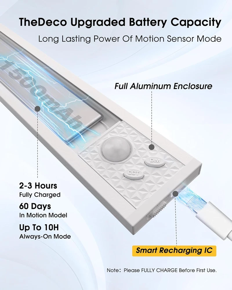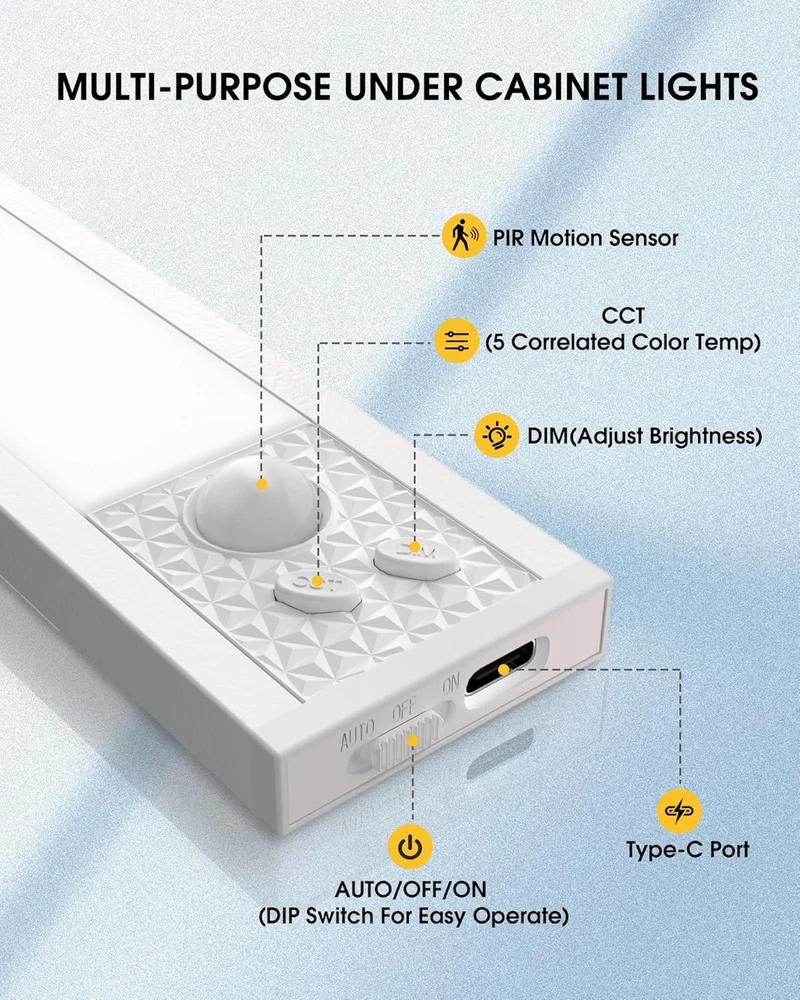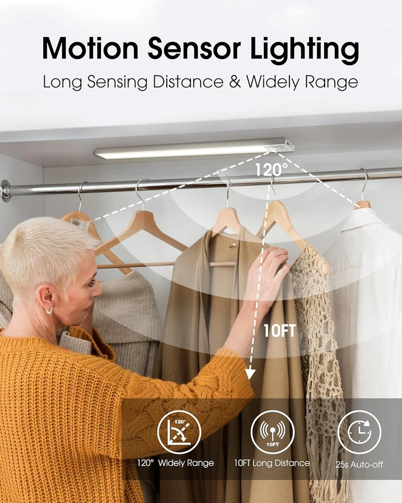 Adjustable Brightness: Exceptional brightness with a high Color Rendering Index (CRI) for vivid and natural lighting. Easily adjust the brightness from 10% to 100% and switch between 5 color temperatures: warm (2700K/3000K), natural (4500K), and cool white (5000K/6500K). Engineered with side illumination, a light guide plate and an anti-glare frosted cover, it’s designed to protect your eyes while providing stunning clarity even in darkness Smart Motion Sensor: Choose from 3 modes: always-on, always-off, motion sensing. Perfect for enhancing home lighting or nighttime navigation, this motion sensor light provides reliable visibility exactly. Detecting motion within 10 feet / 120-degree range, it automatically activates in low-light conditions with a rapid response time of 0 seconds. The default setting ensures it turns off within 25 ± 5 seconds after no motion is detected, making it efficient and practical Large capacity battery: Equipped with a built-in 1500mAh high-capacity battery, The light lasting 1–2 months in motion sensor mode. Conveniently recharge using a standard USB-C cable, compatible with computers, adapters, or USB sockets. It fully charges in just 3 hours, ensuring minimal downtime. Enjoy additional features like stepless dimming and brightness lock mode switching even while the light is in use, making it both versatile and user-friendly Easy Installation: Installing this closet lights is easy with its 2 strong magnets and adhesive iron plates. Attach it directly to iron surfaces or use the included adhesive metal plate for non-ferrous surfaces. When it’s time to recharge or relocate, simply remove and reposition the light—no tools needed. Plus, the built-in hooks on top make it perfect for outdoor adventures like camping, providing reliable lighting on clear days Widely applicable & Versatile Lighting: With its compact size and gentle, eye-friendly illumination, this motion sensor cabinet light is perfect for both indoor and outdoor use. Ideal for a variety of settings, it’s not just for kitchens—use it in wardrobes, hallways, basements, countertops, bedrooms, nurseries, workshops, garages, stairwells, entryways, pantries, and more. Wherever extra lighting is needed, this adaptable light delivers functionality and style Product Description 1 Hidden Hooks 2 Motion Sensor 3 Package 4 Large Capacity 5 Easy Installation Compare with similar items Add to Cart Add to Cart Add to Cart Add to Cart Customer Reviews 4.3 out of 5 stars 95 4.3 out of 5 stars 95 4.3 out of 5 stars 95 4.0 out of 5 stars 177 4.0 out of 5 stars 177 4.0 out of 5 stars 177 Price $29.99 $ 29 . 99 $35.99 $ 35 . 99 $44.99 $ 44 . 99 $22.98 $ 22 . 98 — — Light Source Type LED LED LED LED LED LED Light Sources 34 56 78 34 54 74 Dimensions (L x W x H) 7.87 x 1.57 x 0.39 inches 11.8 x 1.57 x 0.39 inches 15.75 x 1.57 x 0.39 inches 8 x 1.57 x 0.39 inches 11.81 x 1.57 x 0.39 inches 15.75 x 1.57 x 0.39 inches Power Source Battery Powered Battery Powered Battery Powered Battery Powered Battery Powered Battery Powered Lighting Method Adjustable Adjustable Adjustable Adjustable Adjustable Adjustable What is the battery life of this cabinet light? A large capacity battery is sufficient to meet your needs. Is the operation of the product simple? Yes.The design of separating switch and buttons makes operation simple. How many installation methods of the cabinet light? Three.Built-in Magnet, Adhesive Iron Strip and Hidden Hooks.