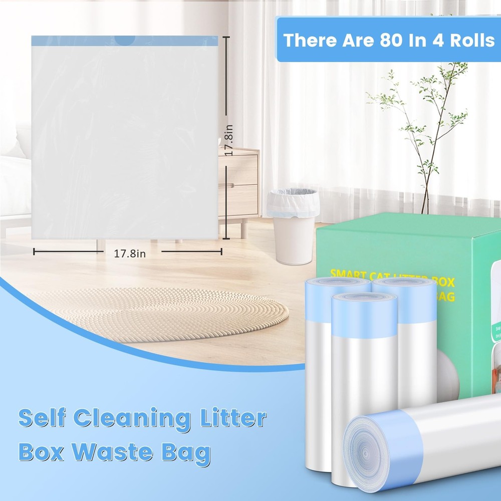 【18.2 x 18.2 inches】 This cat litter bag is only suitable for small-caliber self-cleaning cat litter boxes, and cannot be used for ordinary cat litter boxes. In addition, it is suitable for collecting other garbage, such as kitchen garbage, bathroom garbage and so on 【80 Counts/4 Rolls】 There are 4 rolls of cat litter bags in a box, a total of 80. If you change it twice a week, it will last ten months! 【Thicker and stronger】 This cat litter bag is specially designed for cat litter. The thickened material can effectively prevent cat litter from scratching the cat litter bag, and can prevent liquid from leaking 100% 【Drawstring Bags】 The rope-drawing cat litter bag can be suitable for many scenes, and it is convenient enough in the process of throwing garbage. 【Odour Removal】 The waste collection box is a separate module designed to isolate odors, and the device uses negative ion technology to neutralize odors, ensuring the indoor air remains fresh. All parts inside the machine are easily removable for hassle-free cleaning 【18.2 x 18.2 inches】This cat litter bag is only suitable for small-caliber self-cleaning cat litter boxes, and cannot be used for ordinary cat litter boxes. In addition, it is suitable for collecting other garbage, such as kitchen garbage, bathroom garbage and so on 【80 Counts/4 Rolls】There are 4 rolls of cat litter bags in a box, a total of 80. If you change it twice a week, it will last ten months! 【Thicker and stronger】This cat litter bag is specially designed for cat litter. The thickened material can effectively prevent cat litter from scratching the cat litter bag, and can prevent liquid from leaking 100% 【Drawstring Bags】The rope-drawing cat litter bag can be suitable for many scenes, and it is convenient enough in the process of throwing garbage. 【Odour Removal】The waste collection box is a separate module designed to isolate odors, and the device uses negative ion technology to neutralize odors, ensuring the indoor air remains fresh. All parts inside the machine are easily removable for hassle-free cleaning