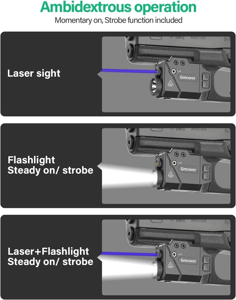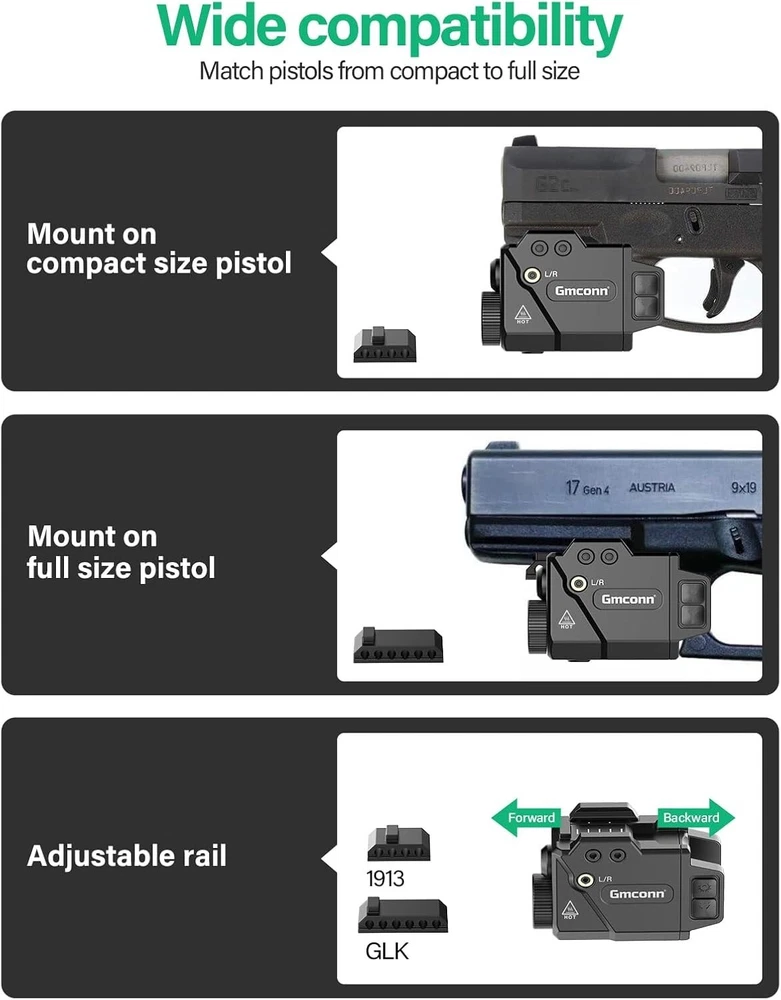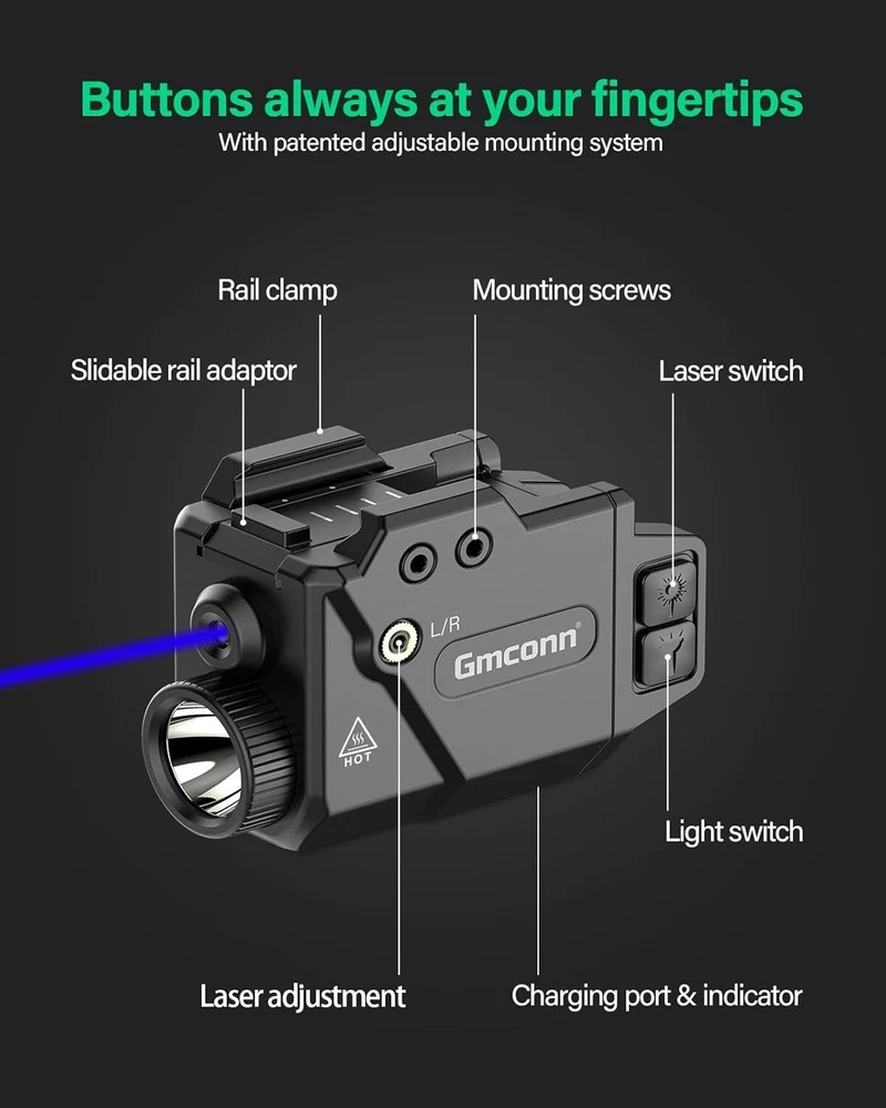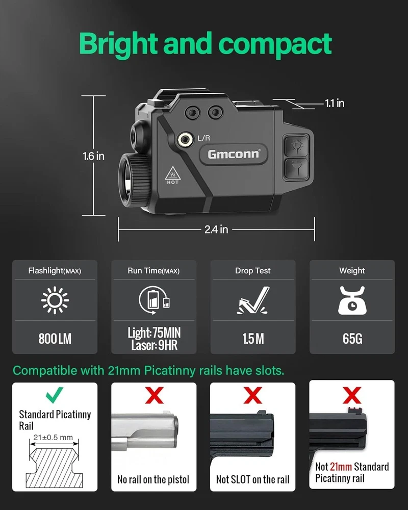 800 Lumen Tactical Pistol Light with LED Flashlight & Blue Beam for Glock Taurus Precision laser sight, beam intensity/wavelength: <5 mW peak, 530 nm, laser Class 3a. It meets US safety standards. Extreme bright LED gun flashlight and laser sight combo. Ajustable Rail System: GM-1091 flashlight for pistols adopts the adjustable rail system, which allows it to perfectly fit different kind of pistols. Convenient Operation: Controlled by ambidextrous switch, easy to turn on and turn off. LED light and laser sight can be turned on or turn off independently, therefore, you may have combinations of light and laser, light (strobe mode available) only, and green laser only. The LED Flashlight and Green Laser sight are powered by a Built in rechargeable battery, which is charged with a Micro USB charging cord. The green laser can used to 9 hours. The powerful battery life allows you not to worry about running out of power. What's in the Package: 1x Pistol Laser/ Light Combo(with built-in battery), 1x Slidable rail adapter, 1x Backup Screw, 1x Allen wrench, 1x Charging cable, 1x User Manual. Top-Notch USA Seller | S wift USPS/UPS delivery | Shipped within 1 Business Day | Quick Replies | Free Shipping | Prompt Communication Contact us We value open communication with our customers. Our team is committed to providing quick responses to any queries or concerns you may have regarding our products or your order. Please feel free to contact us on eBay's Internal Message System for any questions or concerns you may have. Our dedicated customer service team is committed to providing exceptional support and ensuring your shopping experience with us is nothing short of excellent. Customer Service We strive to offer the best quality products to our customers. Each item listed in our store undergoes rigorous quality checks to ensure customer satisfaction. If you have any problems, we are very glad to help you. Please message us directly through eBay for faster response. Your inquiry is important to us and we'll respond within 24 Hr. Your order will be shipped within 1 business days upon full payment received. [ Due to the different monitor and light effect, the actual color of the item might be slightly different from the color showed on the pictures. Thank you ! ]