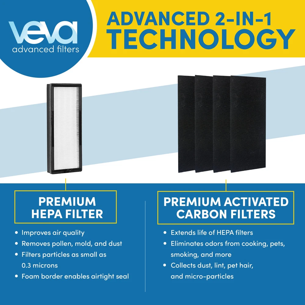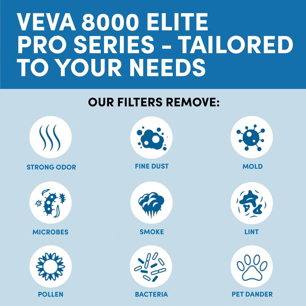 Premium Quality - HEPA filter captures dust, pet dander, and allergens as tiny as .3 microns to remove household dust, pollen and PM2.5 particles. Ideal for anyone looking to create a cleaner healthier home Eliminate Odors - Premium activated carbon pre-filters remove odors from pets, smoking, cooking and more. Use activated charcoal nano-technology to provide fresh clean air throughout a large room. Superior Value - This complete air cleaner system includes a HEPA Filter along with 4 Precut Activated Carbon Pre-Filters. This complete set eliminates the need to cut, clean or vacuum pre-filters and extends the life of the main HEPA filter. Perfect For Home or Office - The 8000 features an innovative and sleek design that guarantees the air purifier to be the perfect addition to any home or office. It can be changed from a tower air purifier to a table-top air purifier by removing the base. 3-Stage Fan Speed ranges from Ultra Quiet to Turbo. Measures 9" x 8" x 23" Safe for the Whole Family - 100% Ozone free, does not use UV or Ions which produce trace amounts of measurable ozone, a harmful air pollutant. ETL Certified and tested by Nationally Recognized Testing Laboratories to UL Standard. Has an automatic shut-off safety feature when the front panel is removed, making it safe for homes with a baby, cat or dog.