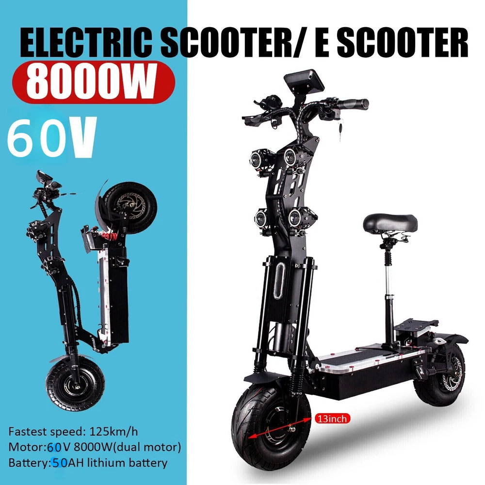 Product description Product: Electric scooter/ E-Scooter Motor Power 60V 80000W Tires 13"(On-Road Tires) Battery Capacity 60V 50A Long Range ECO-78Miles / TURBO-45Miles Gradeability 40° Maximum load weight 200KG/440Lb Charging time Dual charging port: 8-10h Screen LED Switching function Single /Double Drive Switching, Fixed -Speed Cruise Brake System XOD Oil Brake Seat Folding seat - lifts up and down. Product Dimensions 53"L*28"W *53"H Product weight 65kg Acceleration Method Handle Shock Absorbers Dual Spring Shock Maximum speed: 125 km/h Engine: 60V 8000W (twin engine) Battery: 50AH lithium battery Material: Aluminum Brake: Hydraulic brake Quick payment, Quick shipment! Due to the light and screen setting difference, the item's color on the picture may be slightly different from the actual color of the item. Please allow slight dimension difference due to different manual measurement. Thanks for your kindly understanding! PAYMENT: 1.We accept Payoneer only. 2.All major credit cards are accepted through secure payment processor Payoneer. 3.Payment must be received within 7 business days of auction closing. 4.We ship to your eBay or Payoneer address. Please make sure your eBay and Payoneer address is correct before you pay. SHIPPMENT: 1. Clear payment must be done within 5 days after placing the order; 2. We ship to Payoneer address, please make sure the address is correct before you pay, and make sure the phone number is filled in. 3. The item will shipped from US/Outside US. 4. The handling time usually takes 1-5 working days. 5. If you have any problem about tracking parcel or delivery time, pls contact us. -30 DAY MONEY BACK RETURN POLICY: 1. If you are unhappy with your item or changing of mind purchases for whatever reason, pls keep the item and package original. Buyer needs to afford the return postage. Besides, original postage will not return. 2. Please contact us within 30 days if you have a faulty item and we will cover the return postage where necessary, we do not cover this outside 30 days of purchase. -ADDRESS CHANGES: 1. If you enter the incorrect name or shipping details before purchasing, we will arrange shipment for you according to your ebay address. 2. We are not responsible for these changes if there is a mistake entered by the buyer.