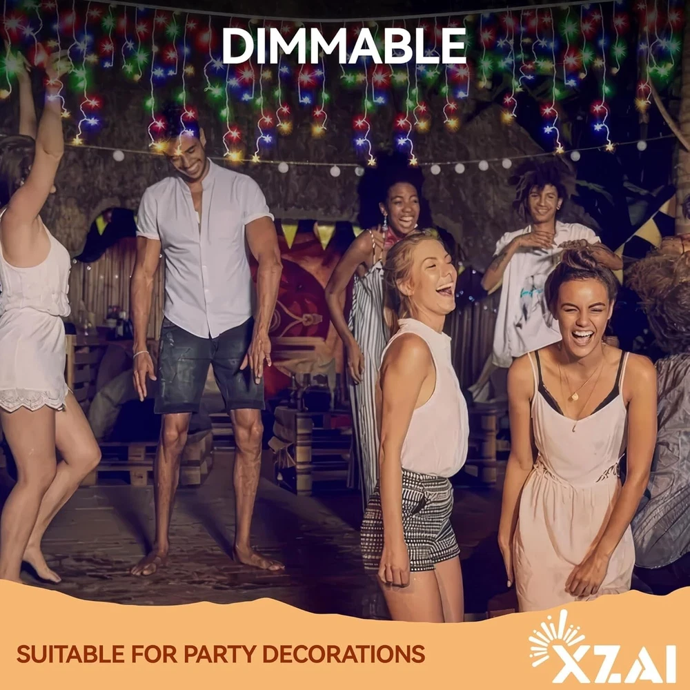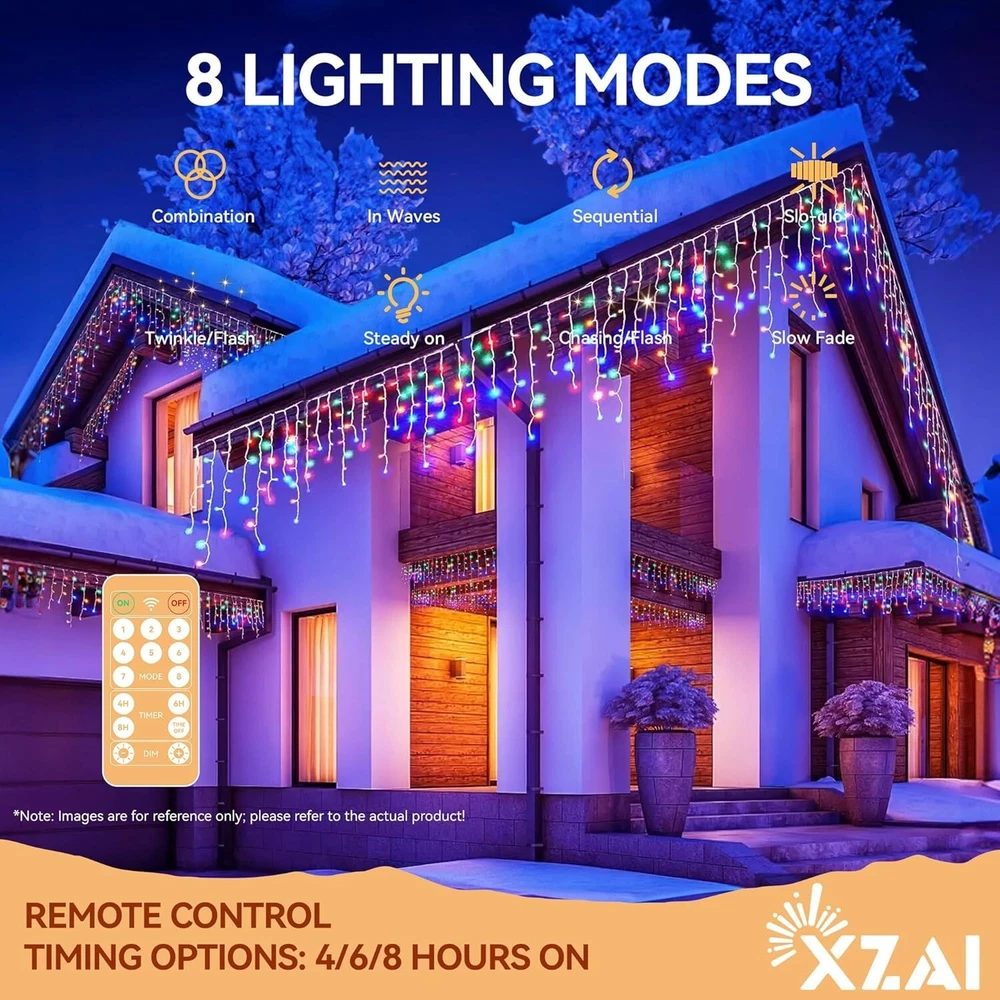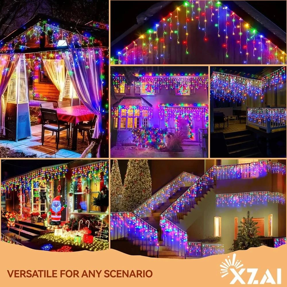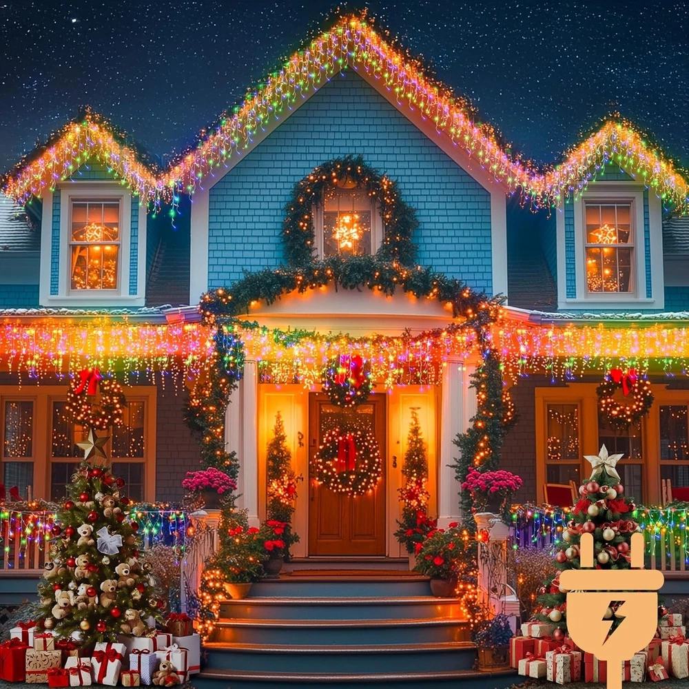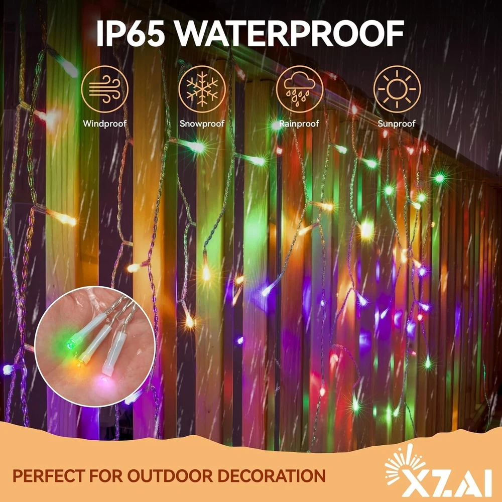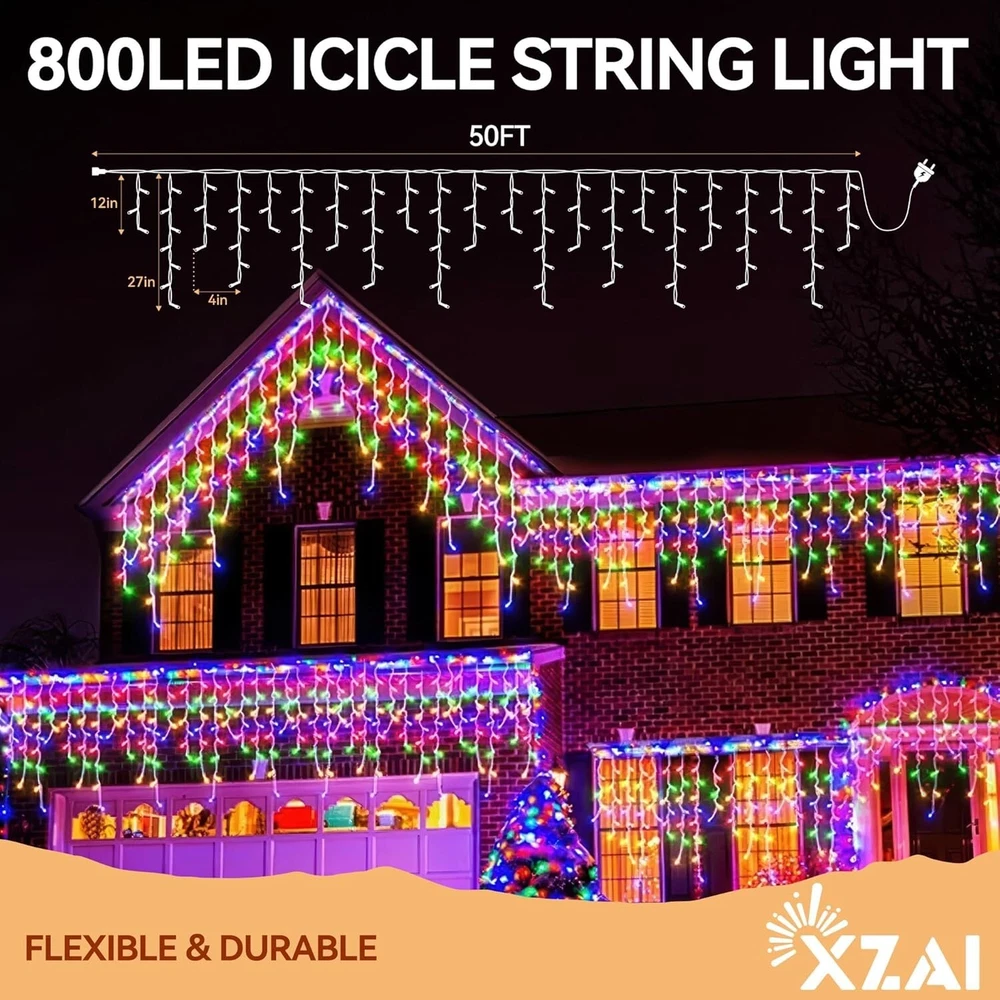 800LED 50FT, Fairy Icicle String Lights, Plug-in, Multi-Color & Cool White, Christmas/Party Decorations with Remote, 8 Modes, Timer, Dimmable, IP65 Waterproof, Hanging for Outdoor & Indoor Use 8 Lighting Modes with Remote: Set the perfect ambiance with our remote-controlled lighting system;with just one click, choose from Steady-On to 7 bing modes, to complement any mood. Use our icicle string lights to create your personal outdoor light show for friends and family. 4 Brightness Levels & 3 Timing Options: with 4 brightness levels (25%, 50%, 75%, and 100%), you can choose the perfect illumination to enhance your indoor and outdoor spaces. Customize your lighting experience with 4, 6, or 8-hour settings, ensuring your space stays illuminated just the way you like it—no need to reset it every day. Flexible & Durable: Crafted with a robust combination of pure copper for optimal conductivity and a durable polyester outer layer, our icicle string lights are designed to be both flexible and long-lasting. Easily bend and shape them to create stunning displays for any occasion. Certified Safety & Efficiency: Our icicle string lights are UL certified, SATISFACTION GUARANTEEing safe usage for your peace of mind;with a low 29V output, these LED lights ensure minimal power consumption and reduced electricity costs, allowing you to illuminate large areas affordably. IP65 Waterproof Design: with an impressive IP65 waterproof and dustproof rating, you can rest assured that your lighting will remain bright and beautiful whether it’s rain, snow, or high winds—just avoid submerging them in water(Keep the plug away from water). Widely Used for Indoor & Outdoor Decorations: Our 50 ft string fairy lights feature 800 bright LEDs, making them suitable for various settings including porches, roofs, trees, backyards, patios, barbecues, fences, pergolas, bistros, restaurants, hotels, commercial buildings and more.Perfect for dinners, birthdays, weddings, parties, Christmas celebrations and beyond. Each set comes in a beautiful gift box,making it a magical gift for friends and family. 12- satisfaction: offers 100% satisfaction service; feel free to contact me via message or the service provided in the manual.